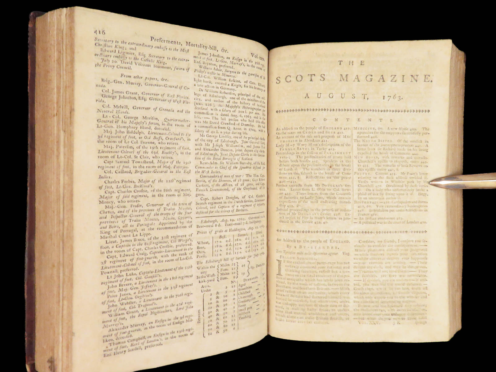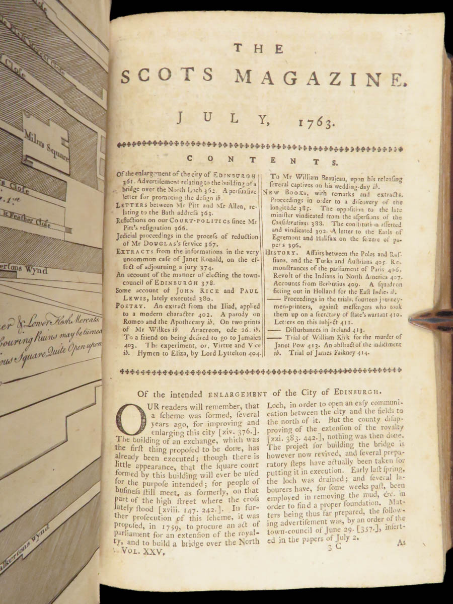 The Scots Magazine, 1763. Volume XXV, printed in Edinburgh, includes 5 plates and 2 maps, among them a folding plan of the North Loch bridge, with reports on European diplomacy and North American events.