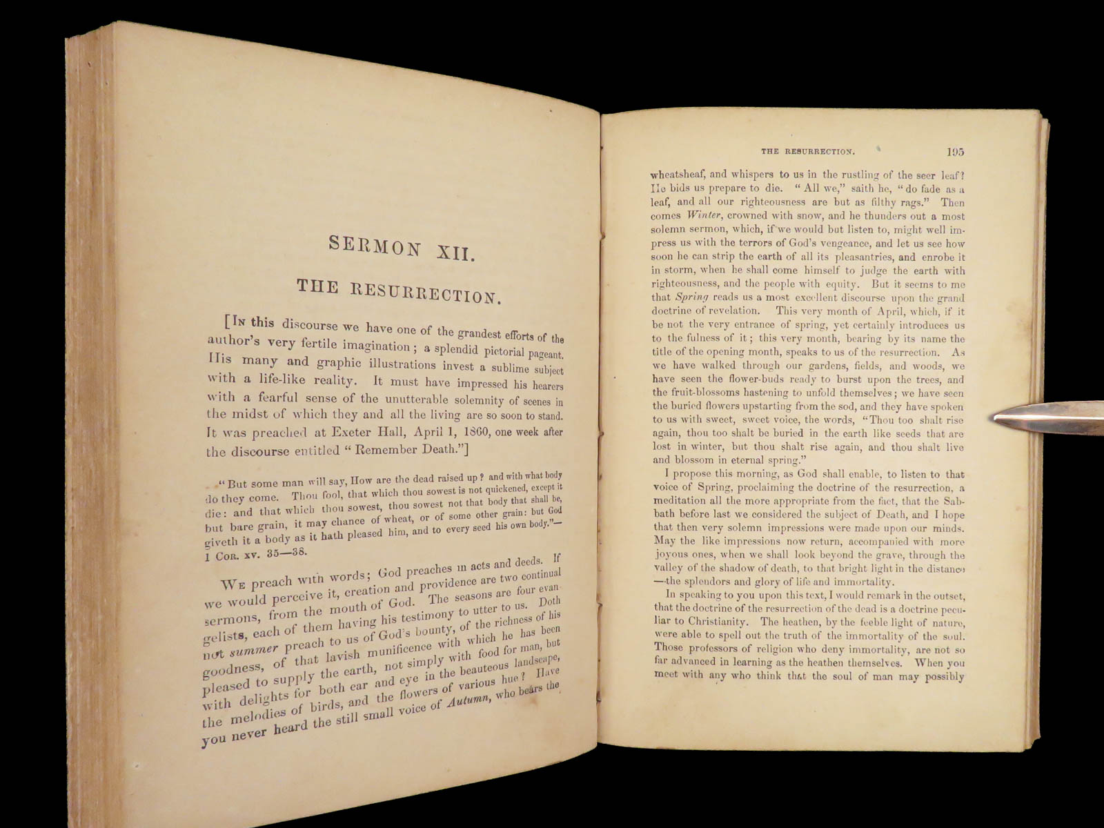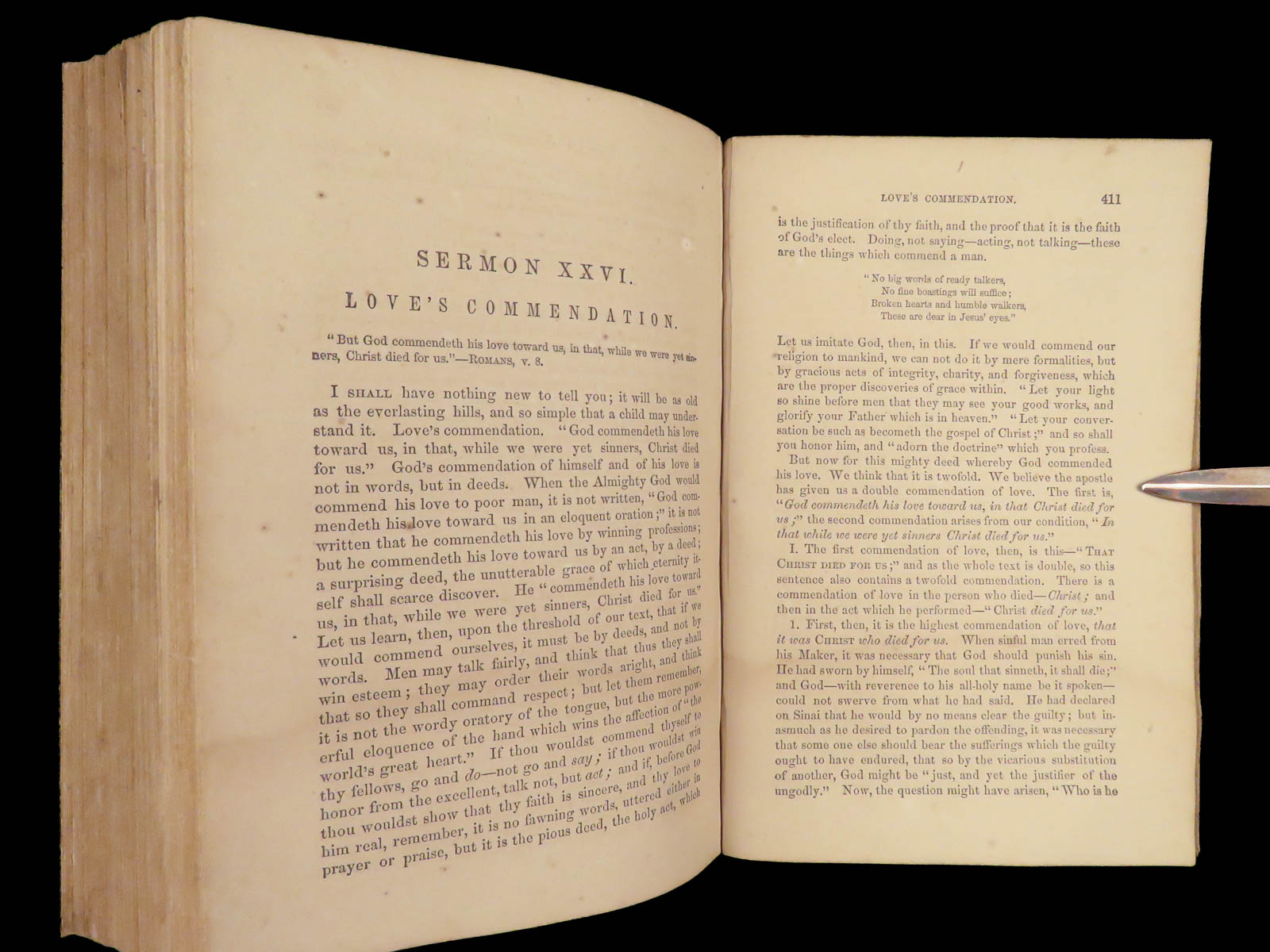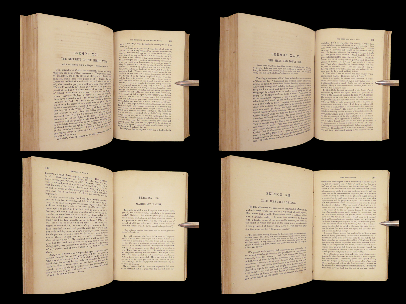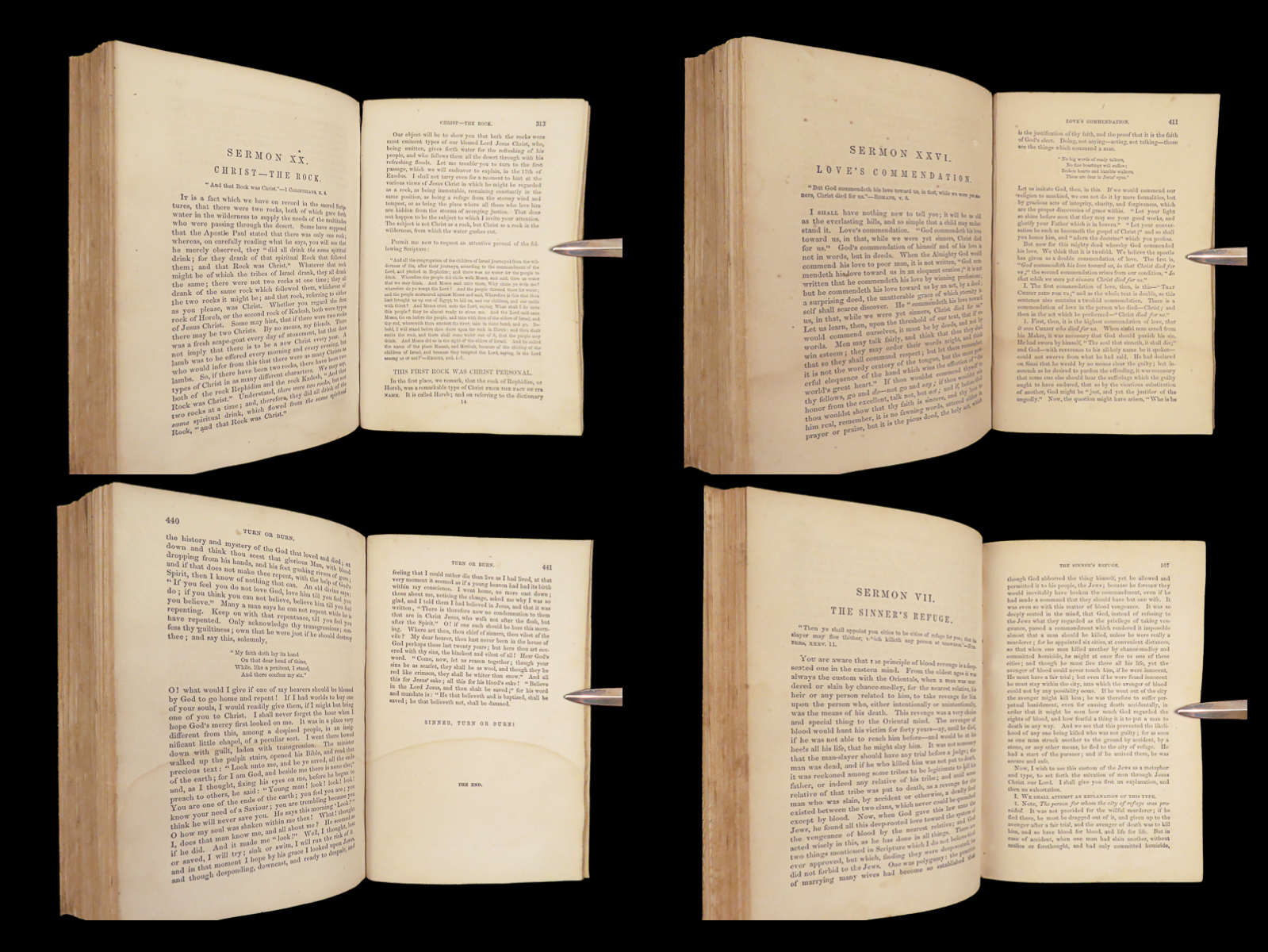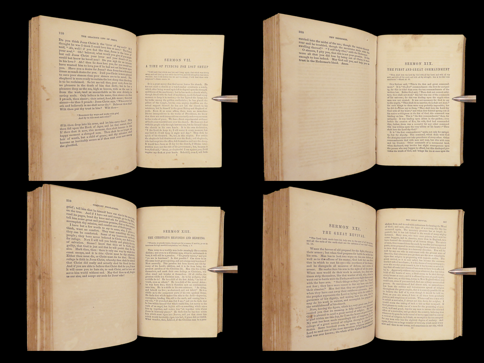 This Sermons of the Rev. C.H. Spurgeon is an extensive yet curated series of Charles Haddon Spurgeon’s sermons, published during the 1860s in response to the growing demand for devotional and religious literature leading up to the Civil War. Spurgeon, often hailed as the “Prince of Preachers,” gained widespread acclaim for his direct, scripture-centered preaching style. The set compiles Spurgeon’s sermons from the formative decades of his ministry, with the American imprint reflecting his growing transatlantic influence after the Second Great Awakening. American editions such as this played a significant role in shaping 19th-century evangelical thought in the United States, particularly in Northern Protestant circles who cited Spurgeon’s anti-slavery stance in their own abolitionist sermons. This set of Sermons of the Rev. C.H. Spurgeon was published between 1860-1869 in a joint publication by Sheldon and Company, Gould & Lincoln, and S.C. Griggs, and includes the Second through Seventh Series.