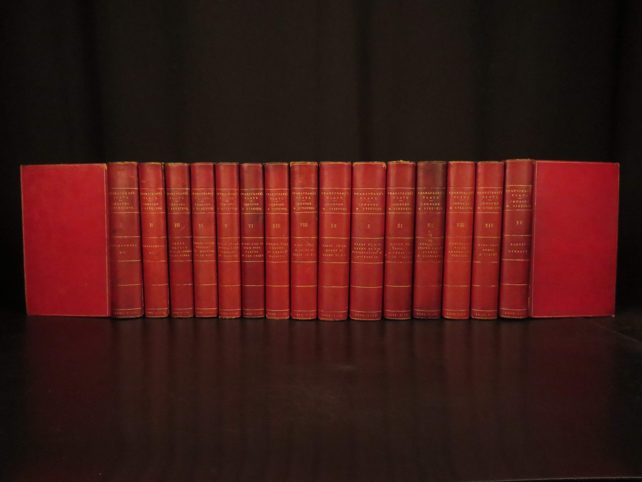 1793 edition of The Plays of William Shakespeare, edited by Steevens and Johnson, complete in 15 volumes with full leather bindings.