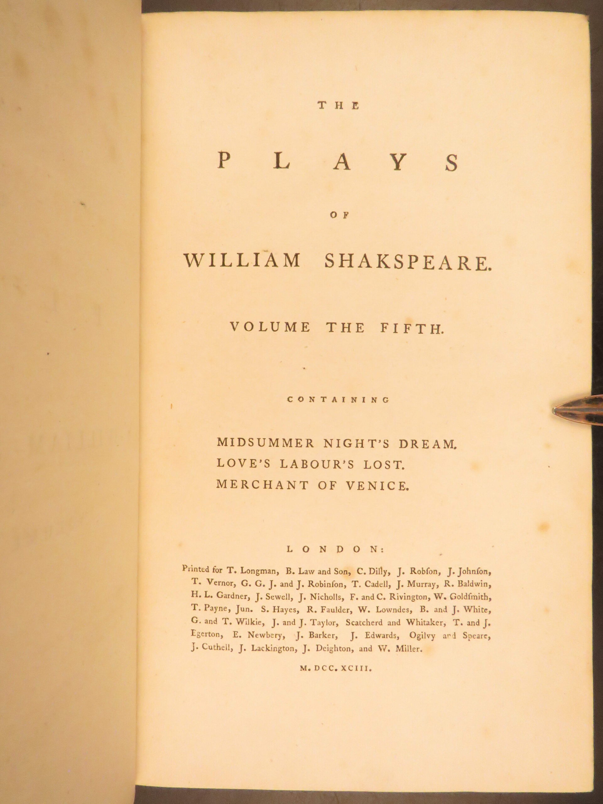This 1793 edition is extremely desirable as it includes each of the famed plays of Shakespeare, but it also features a historical commentary and account of English theatre by Edmond Malone.
