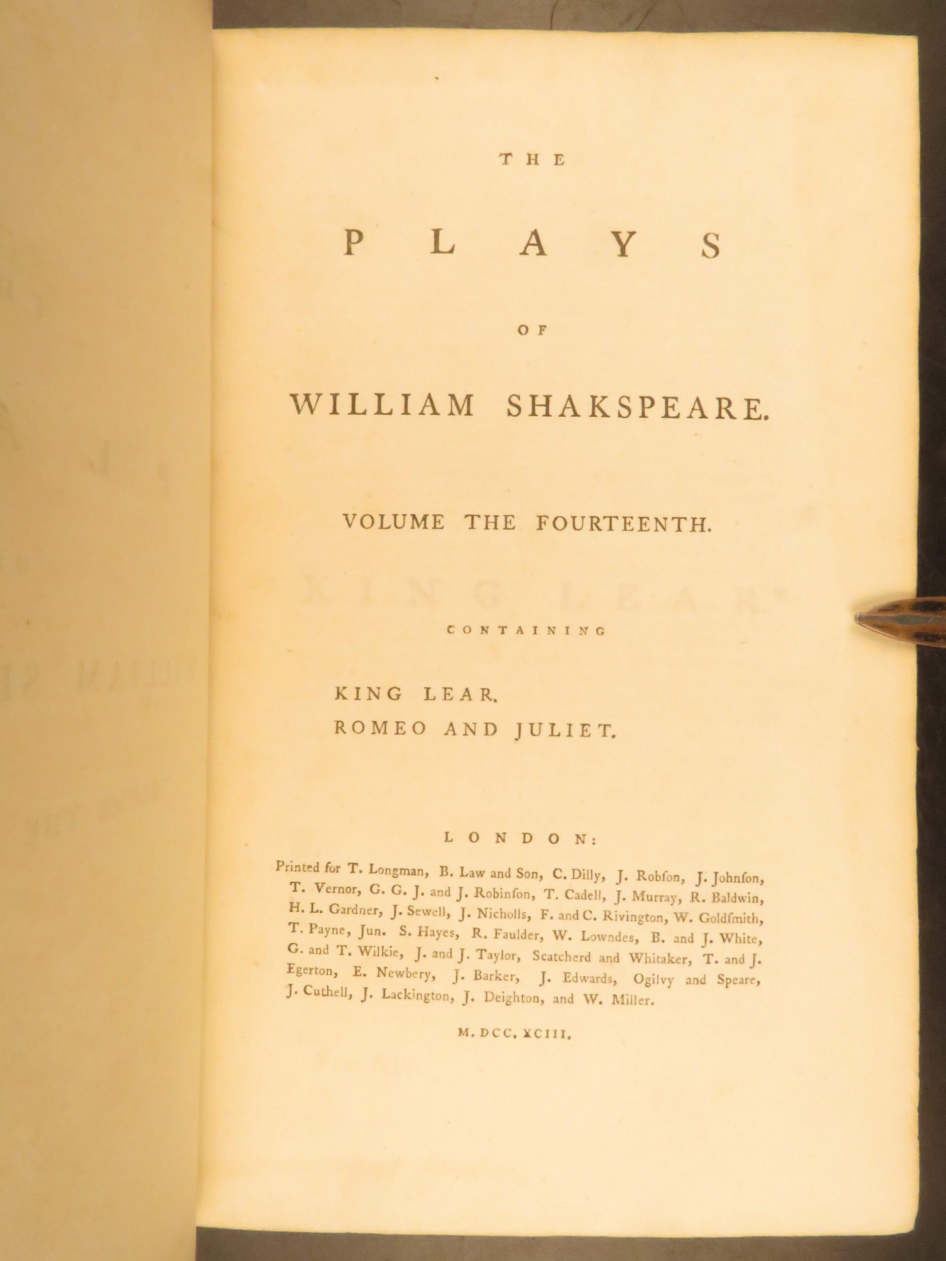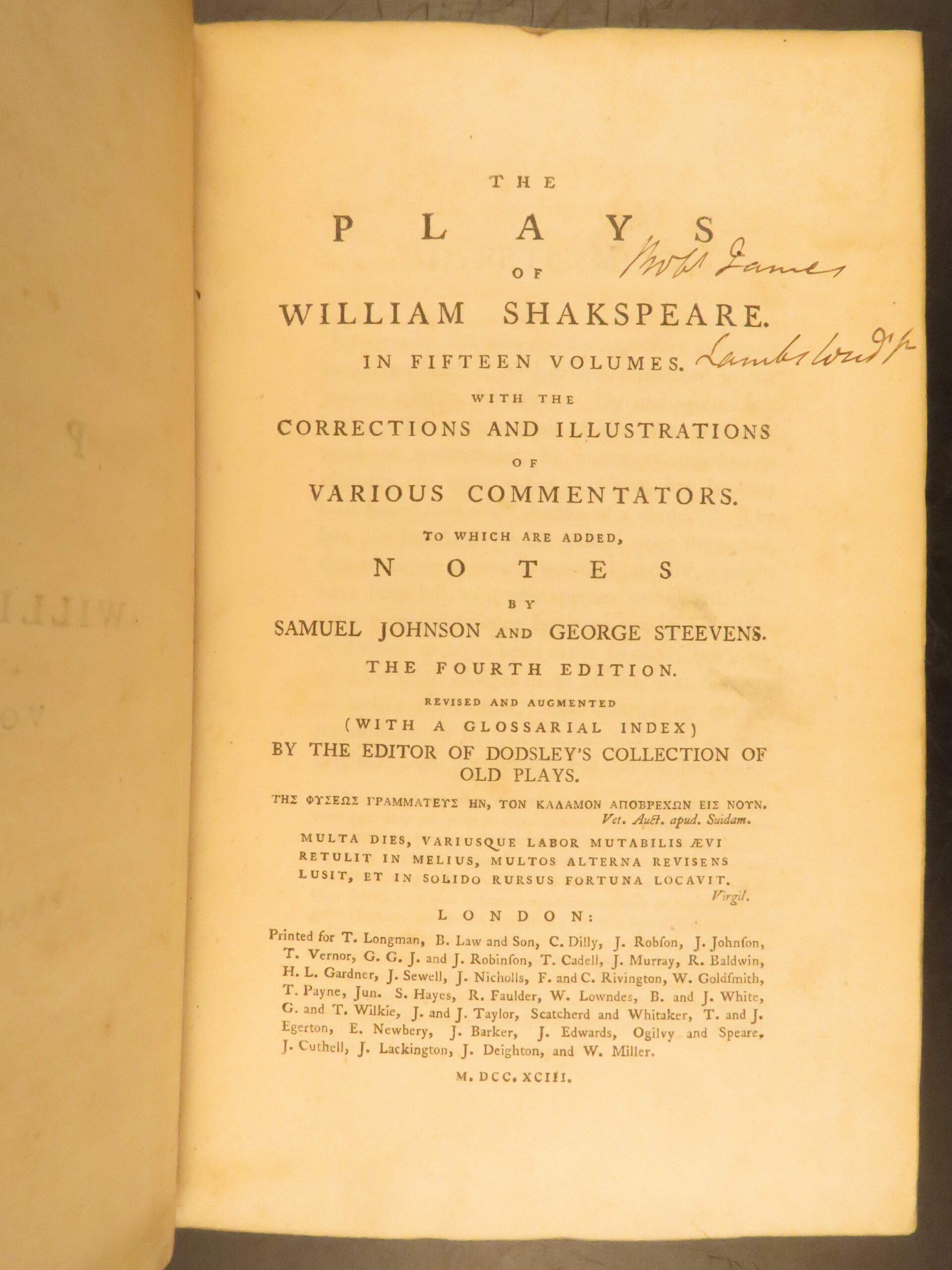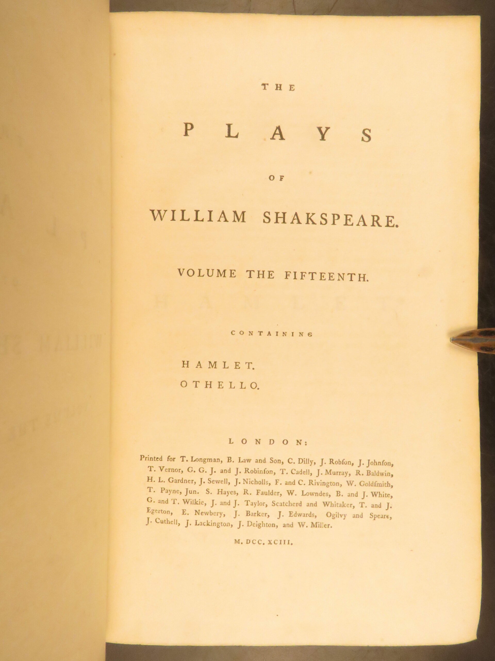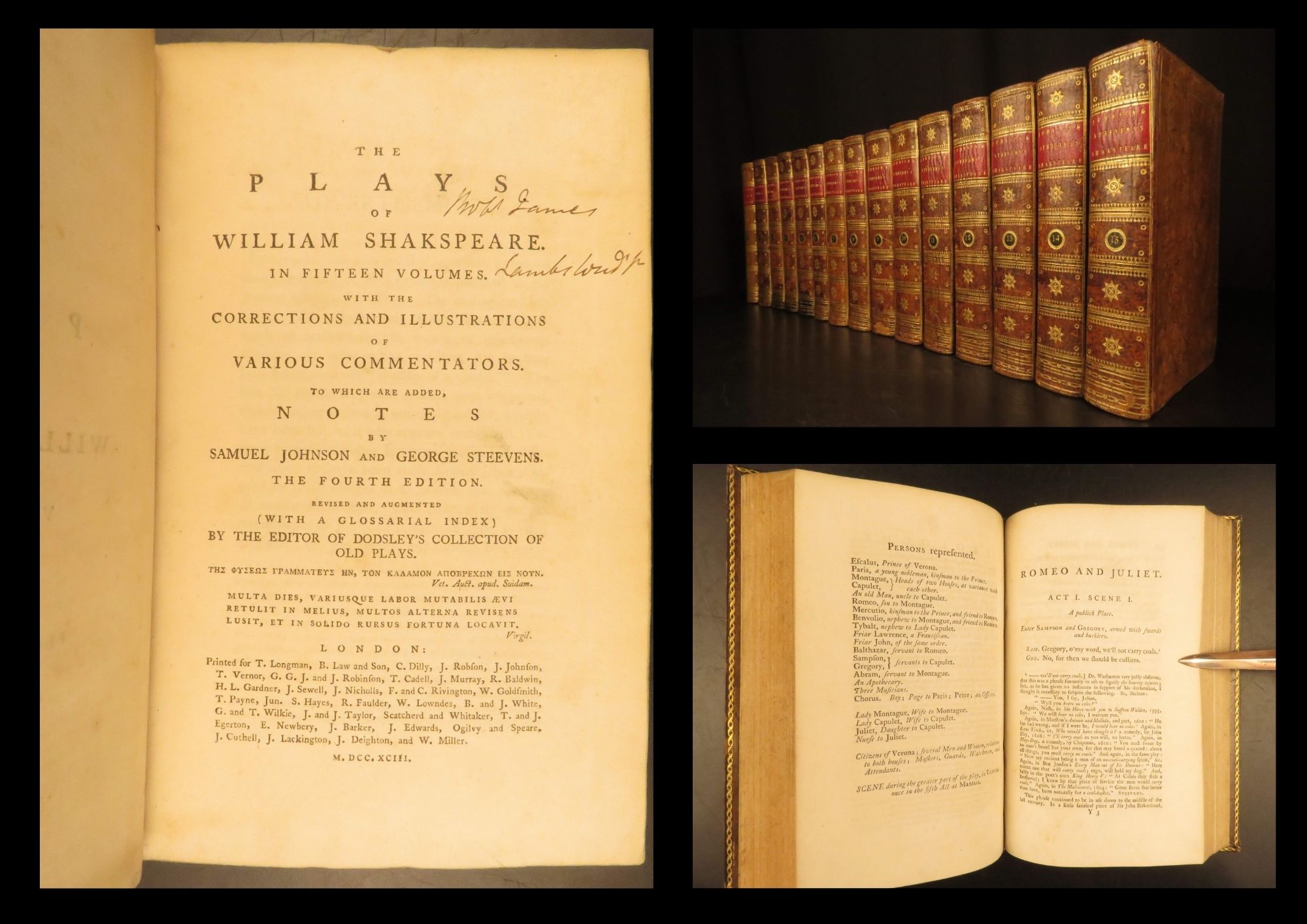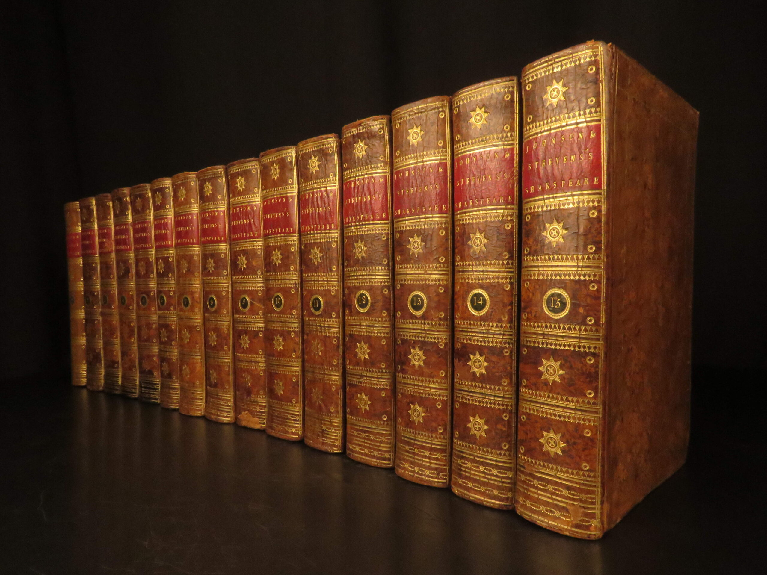 1793 edition of The Plays of William Shakespeare, edited by Steevens and Johnson, complete in 15 volumes with full leather bindings.