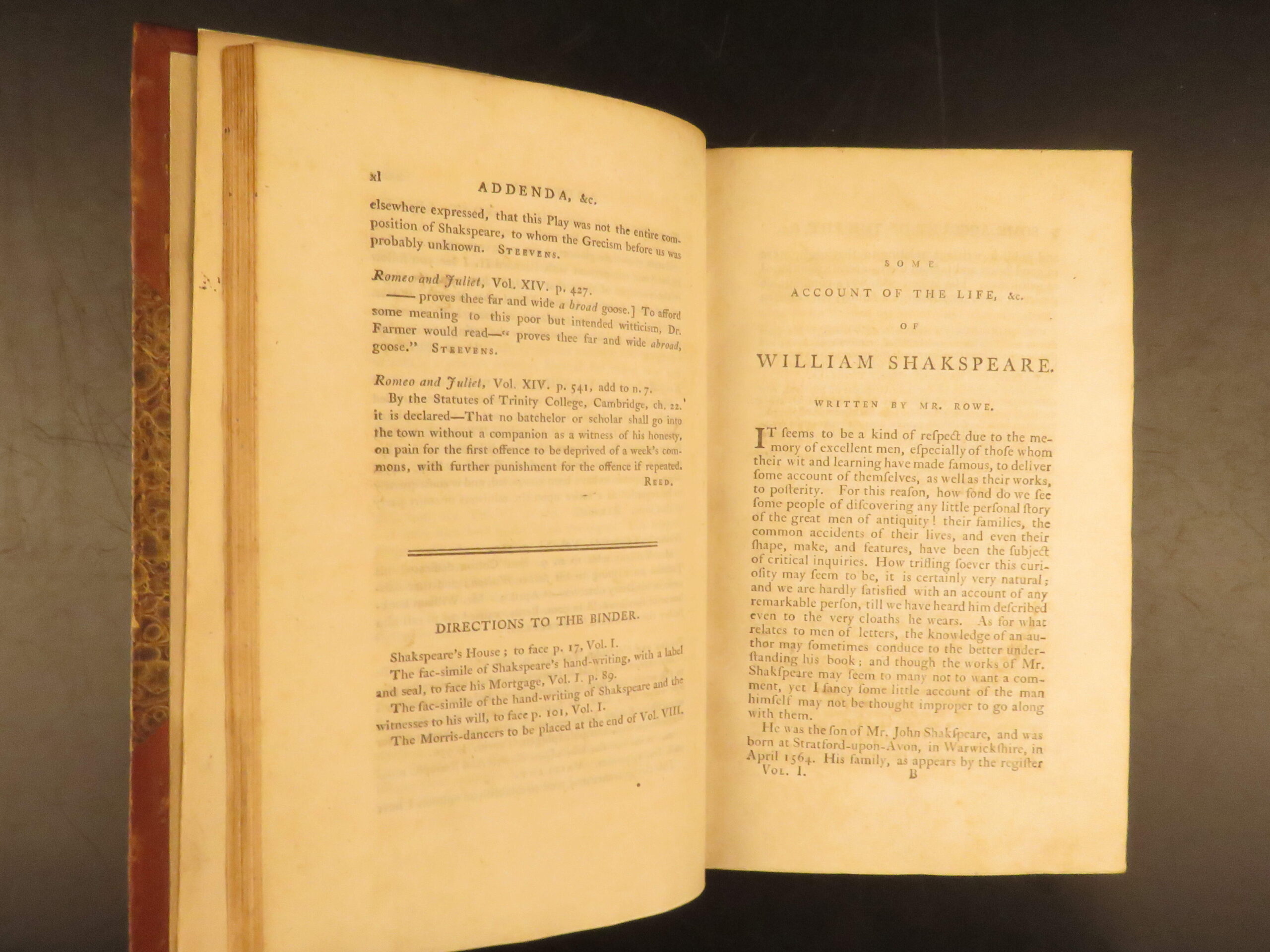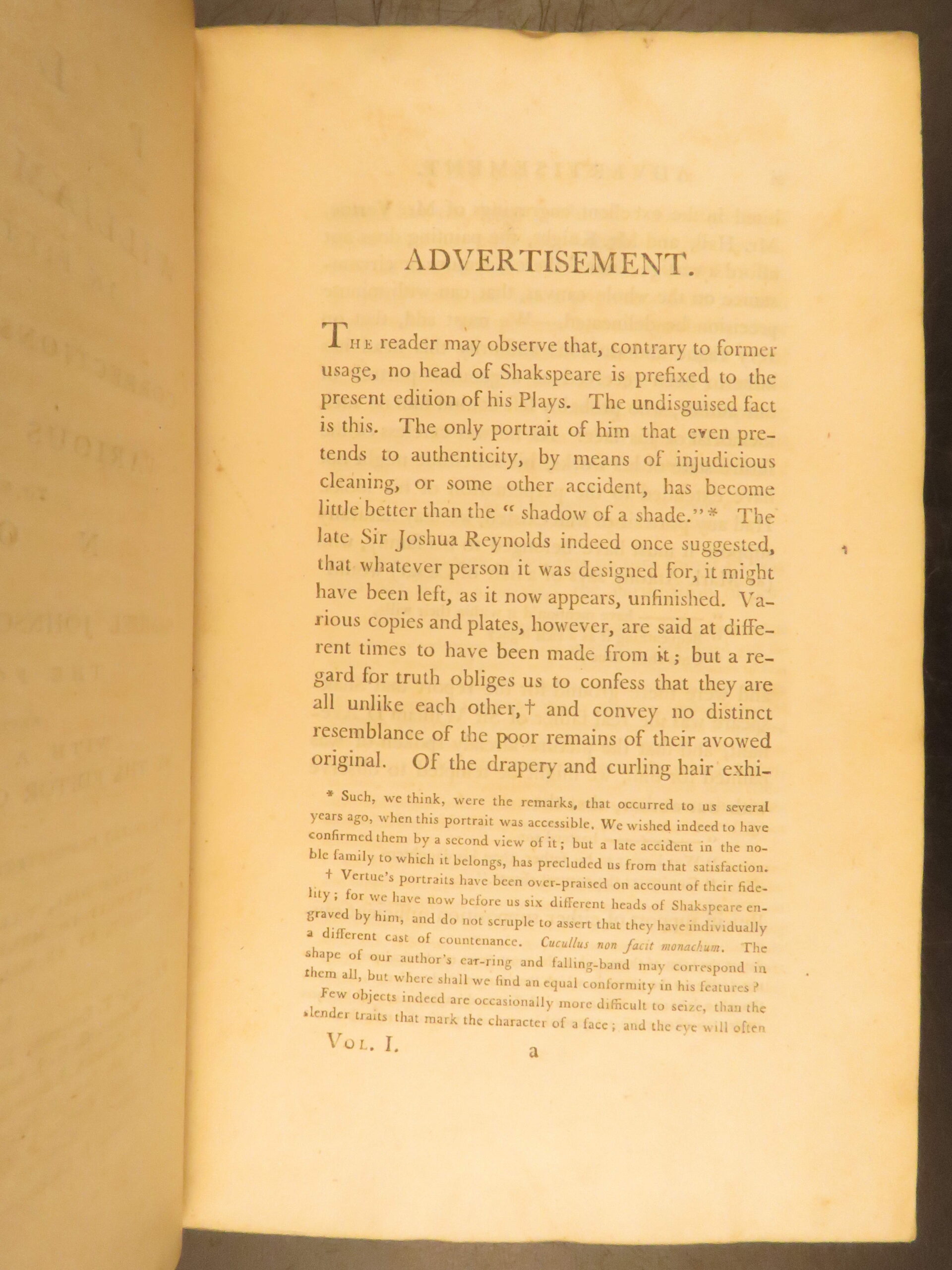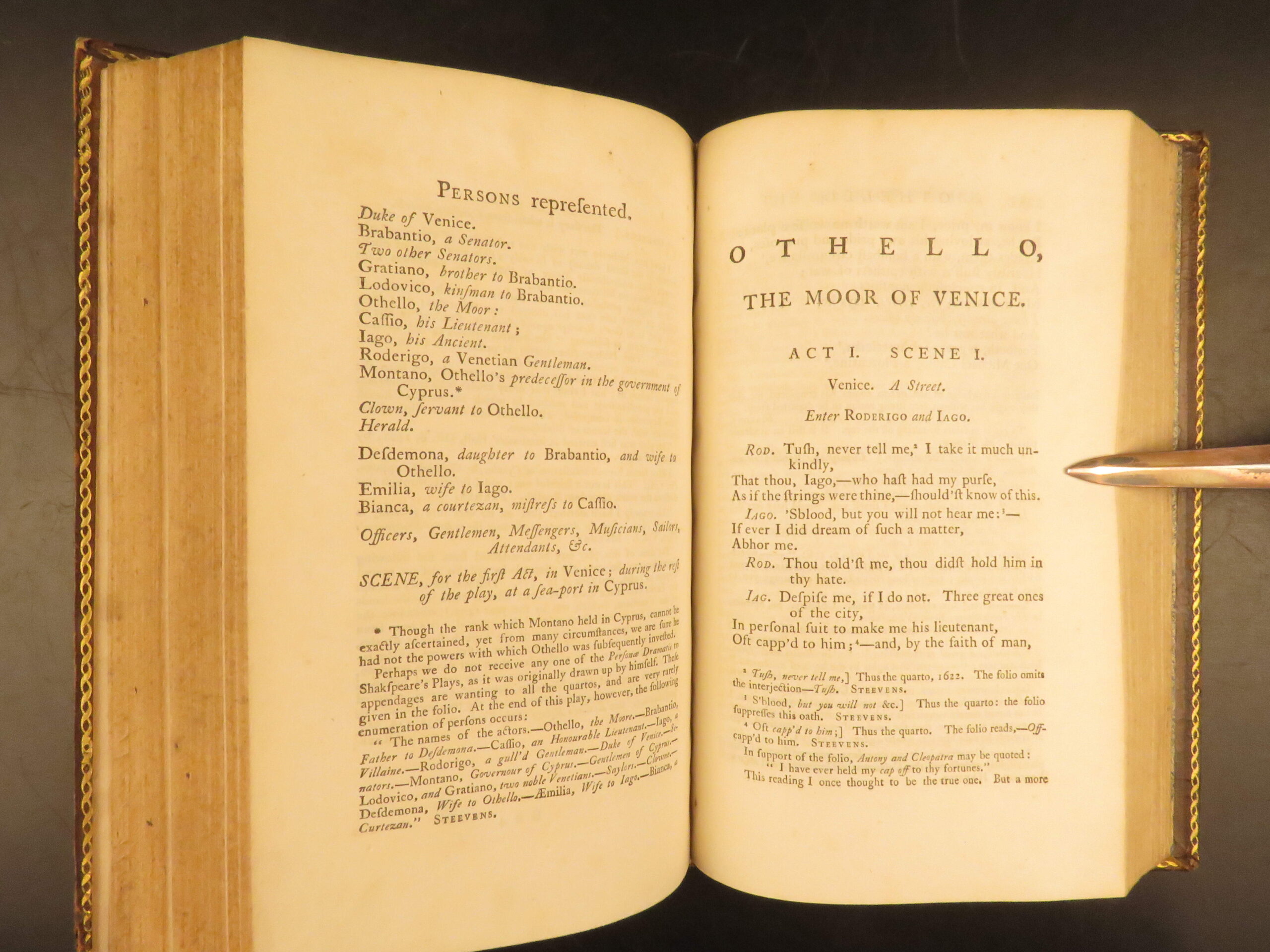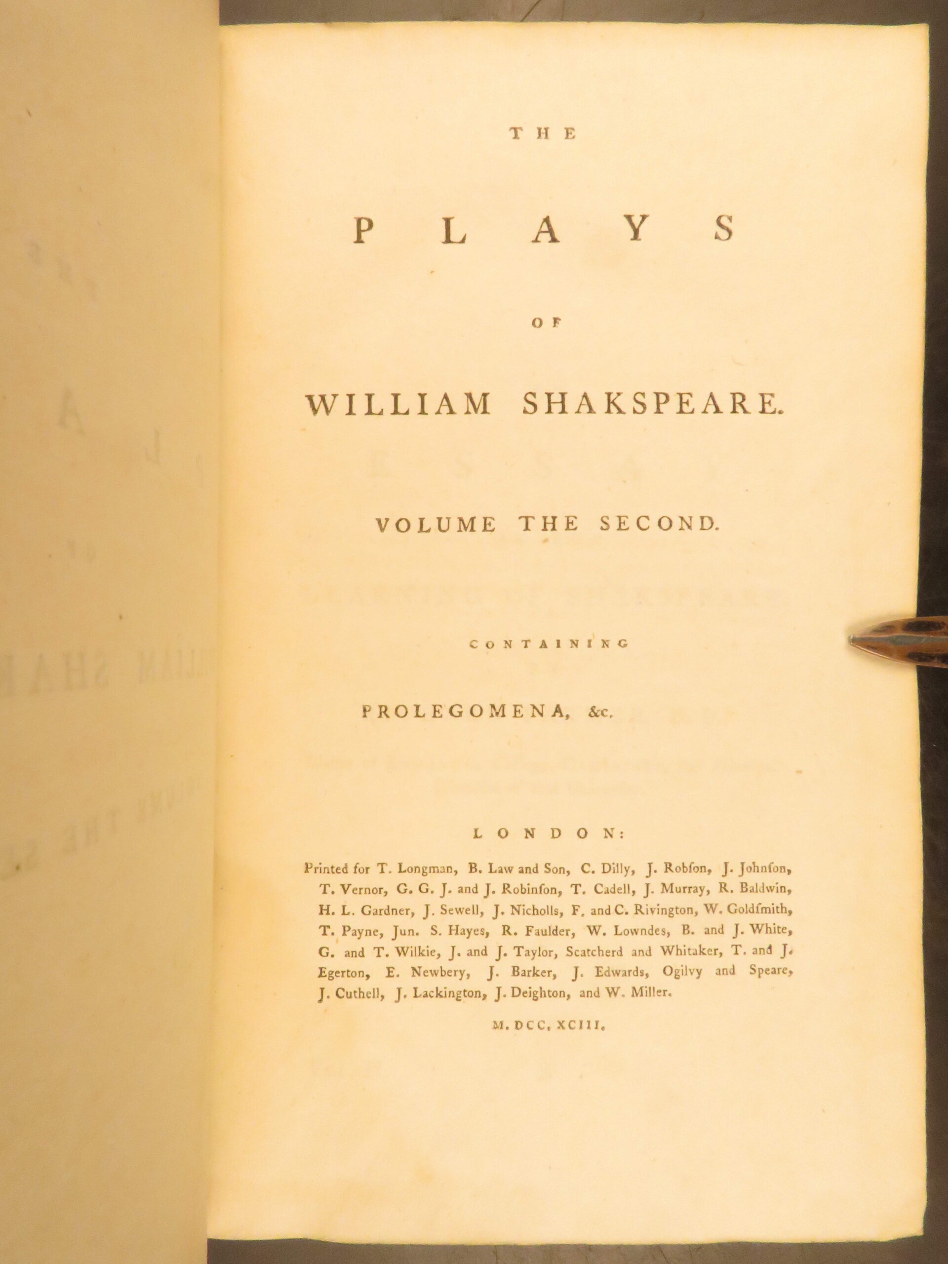 This 1793 edition is extremely desirable as it includes each of the famed plays of Shakespeare, but it also features a historical commentary and account of English theatre by Edmond Malone.
