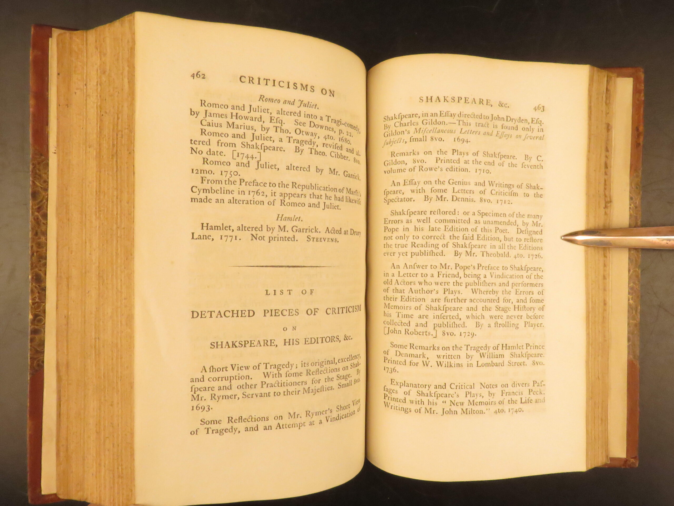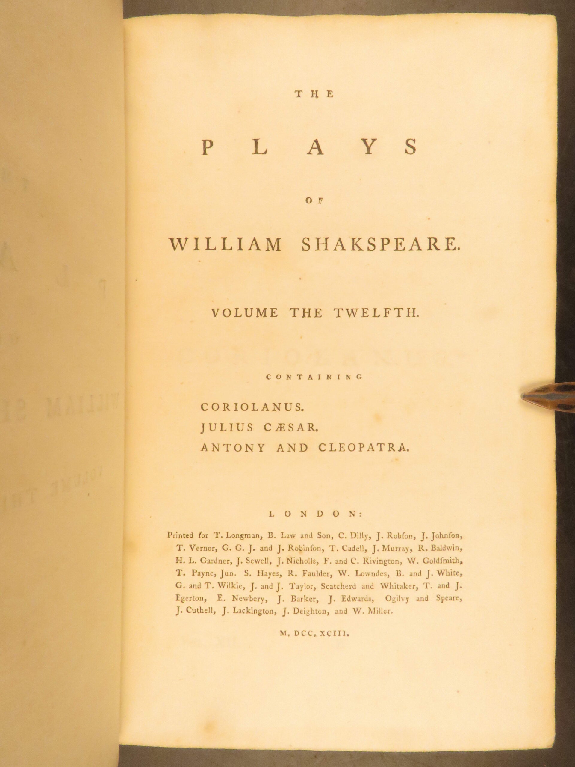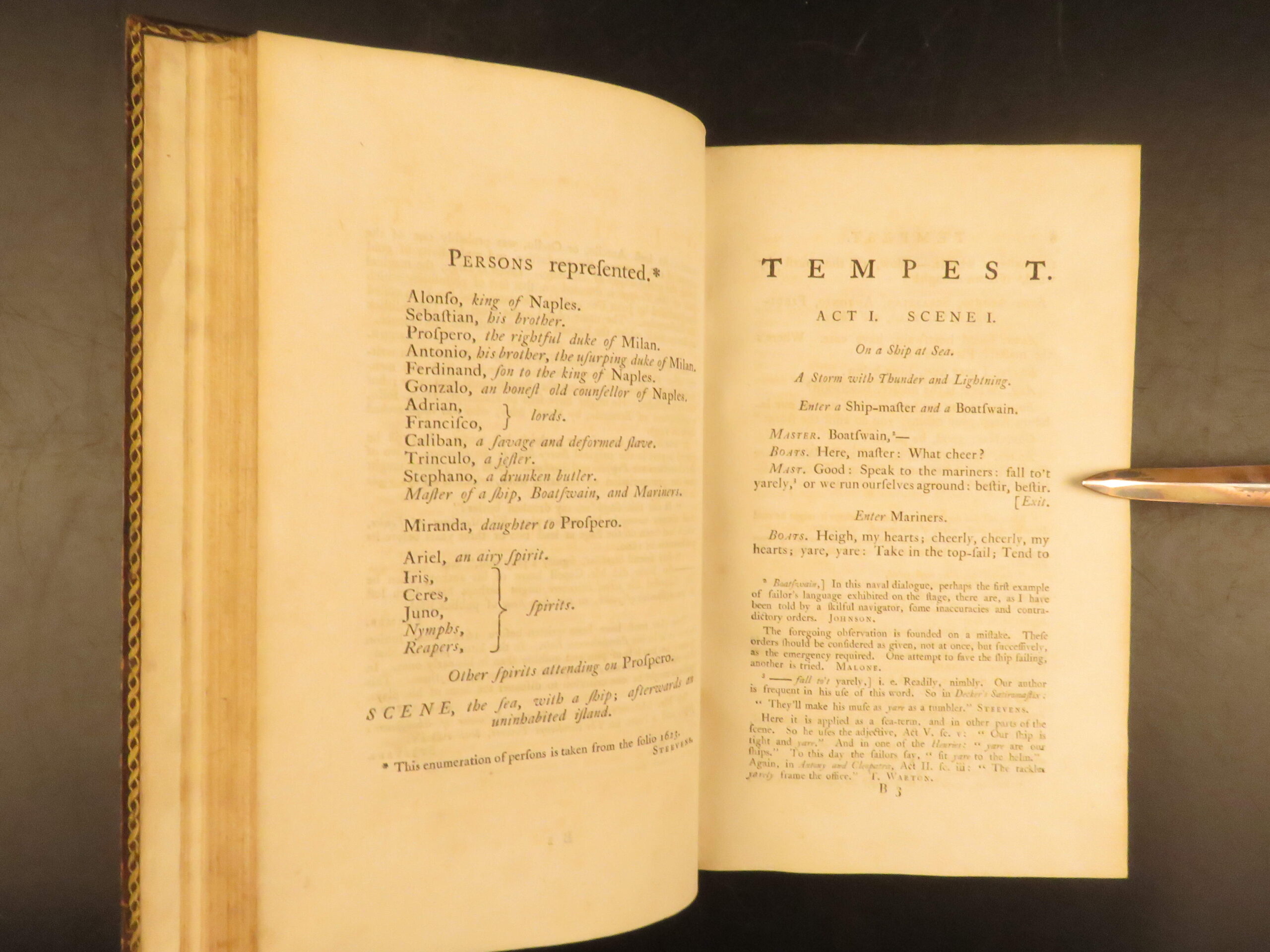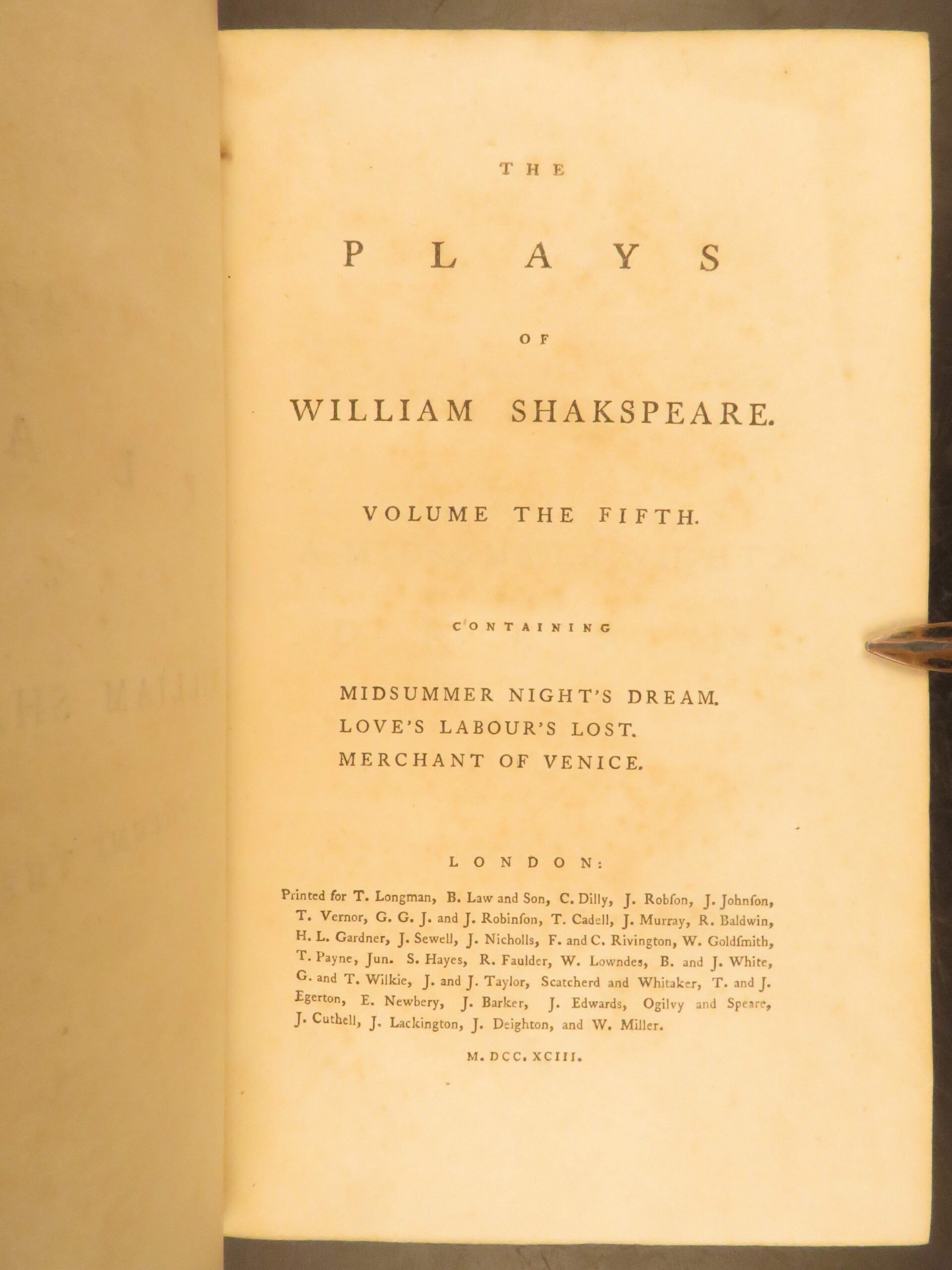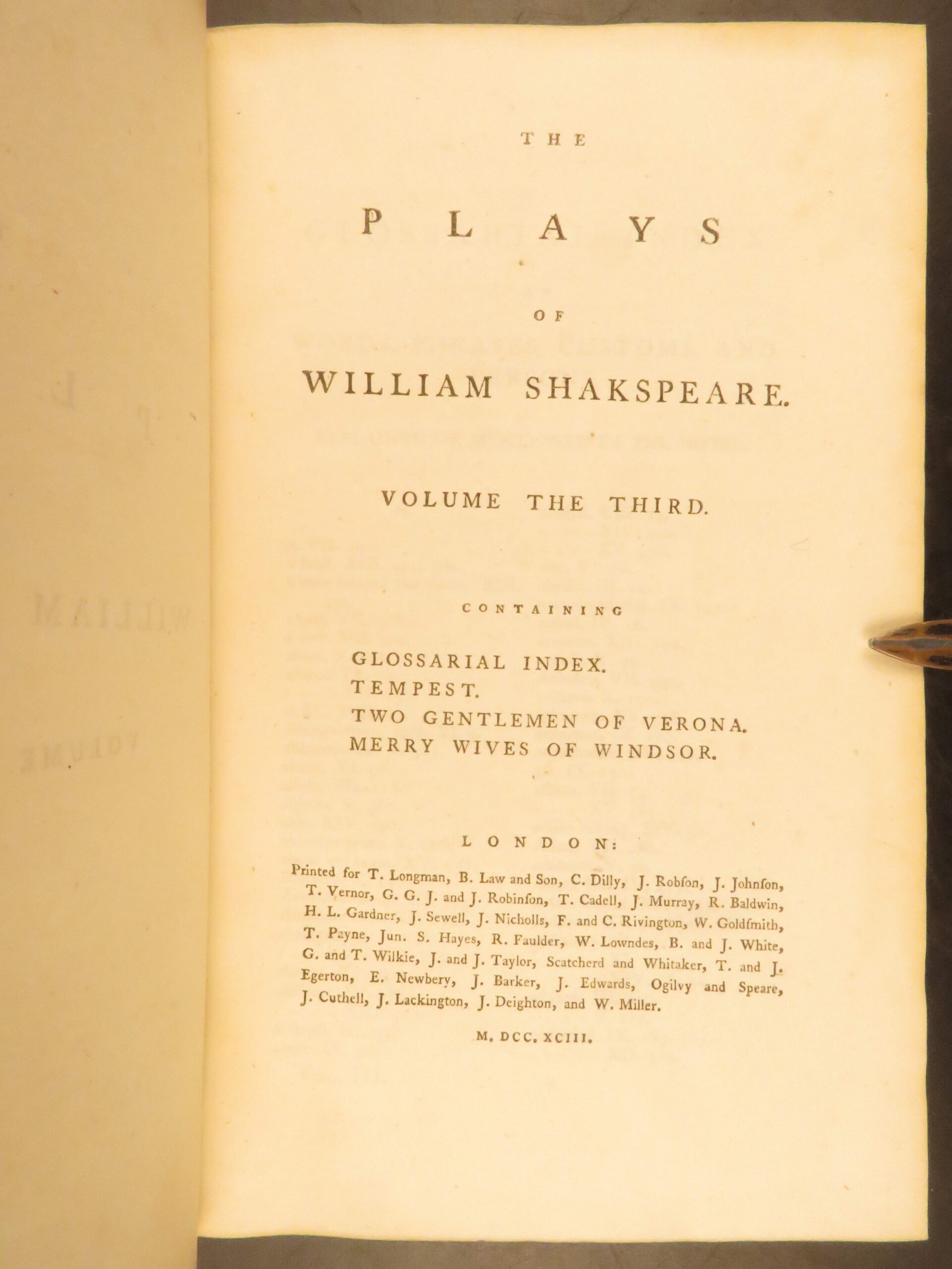 This 1793 edition is extremely desirable as it includes each of the famed plays of Shakespeare, but it also features a historical commentary and account of English theatre by Edmond Malone.