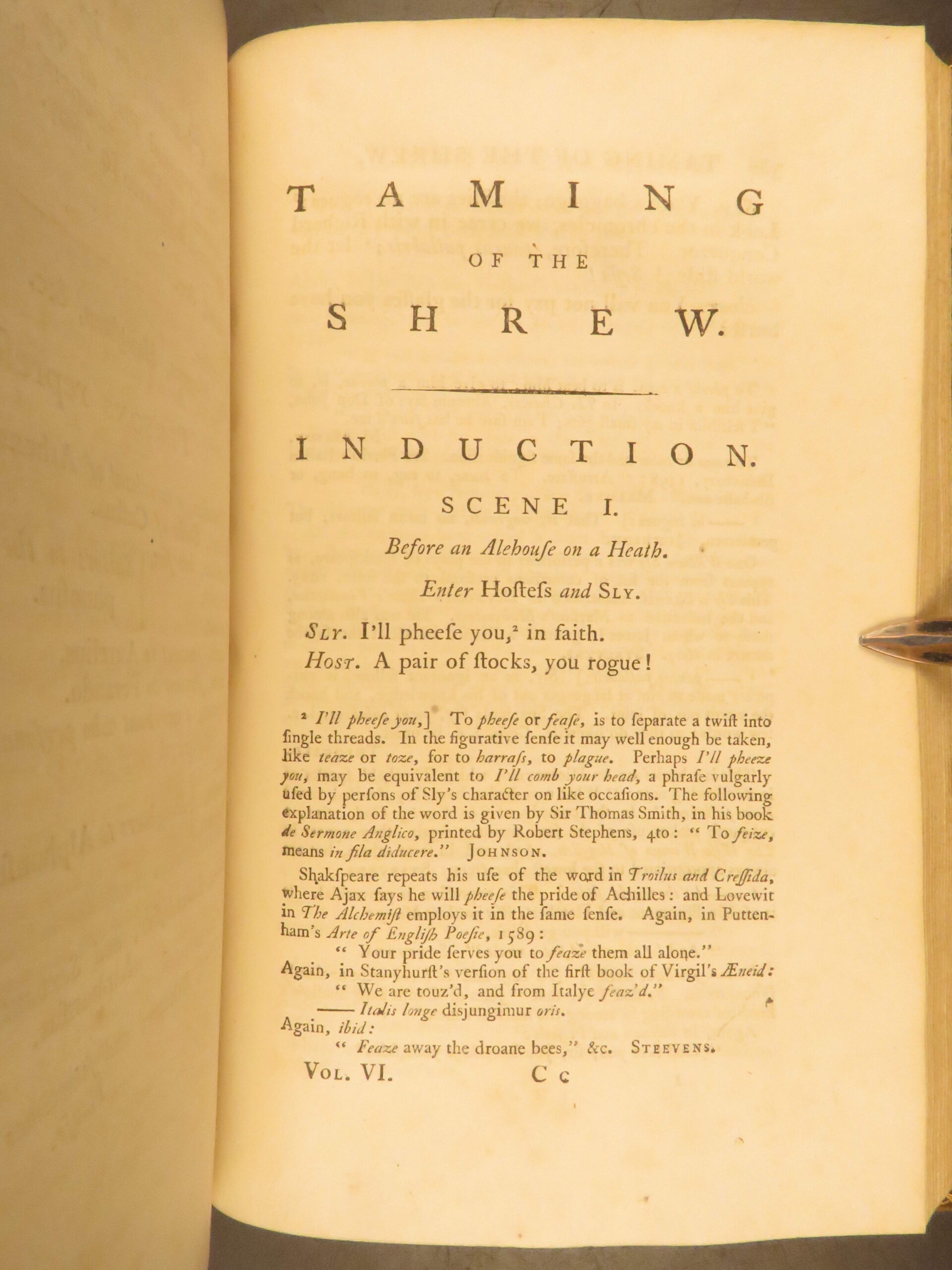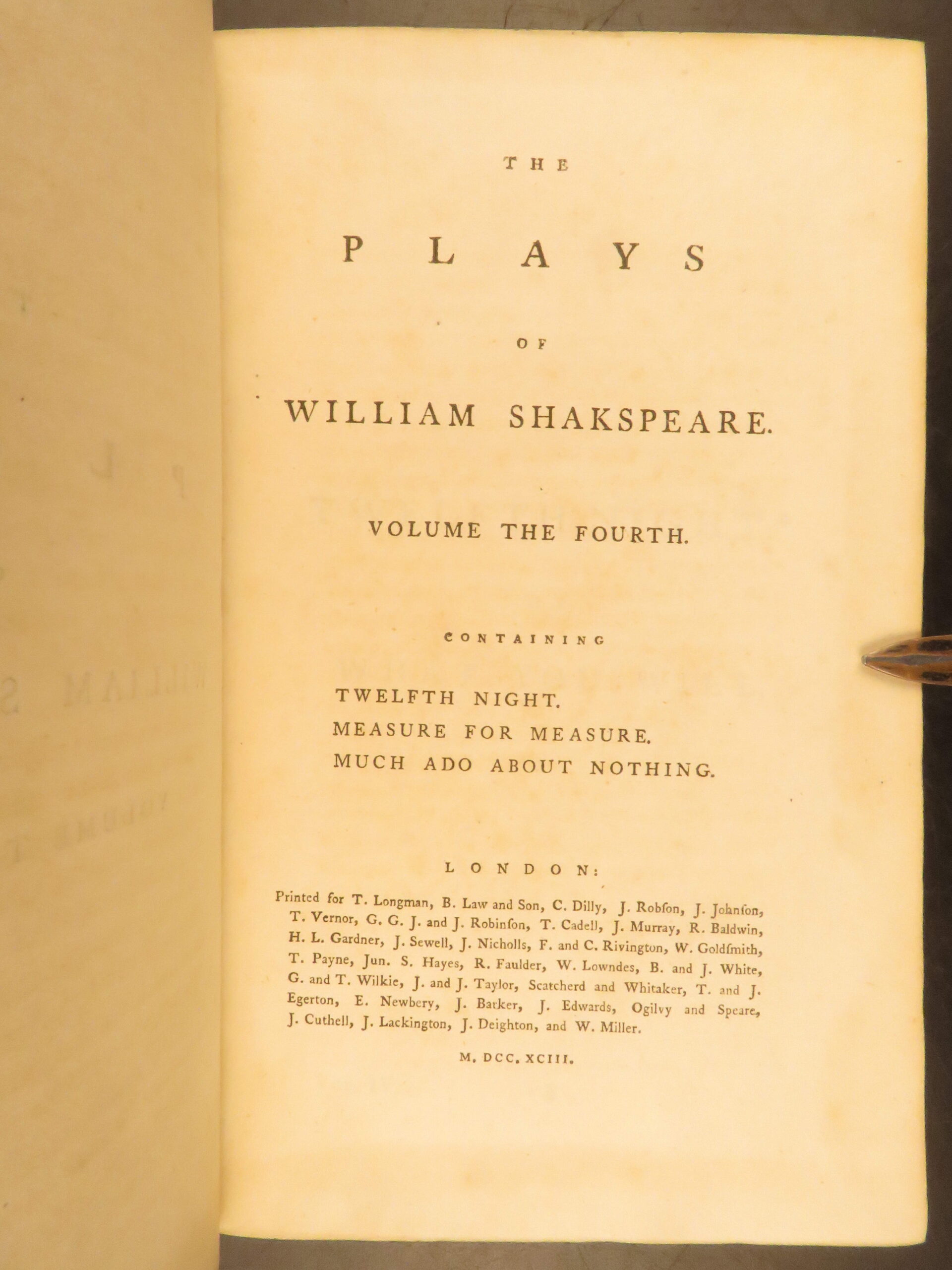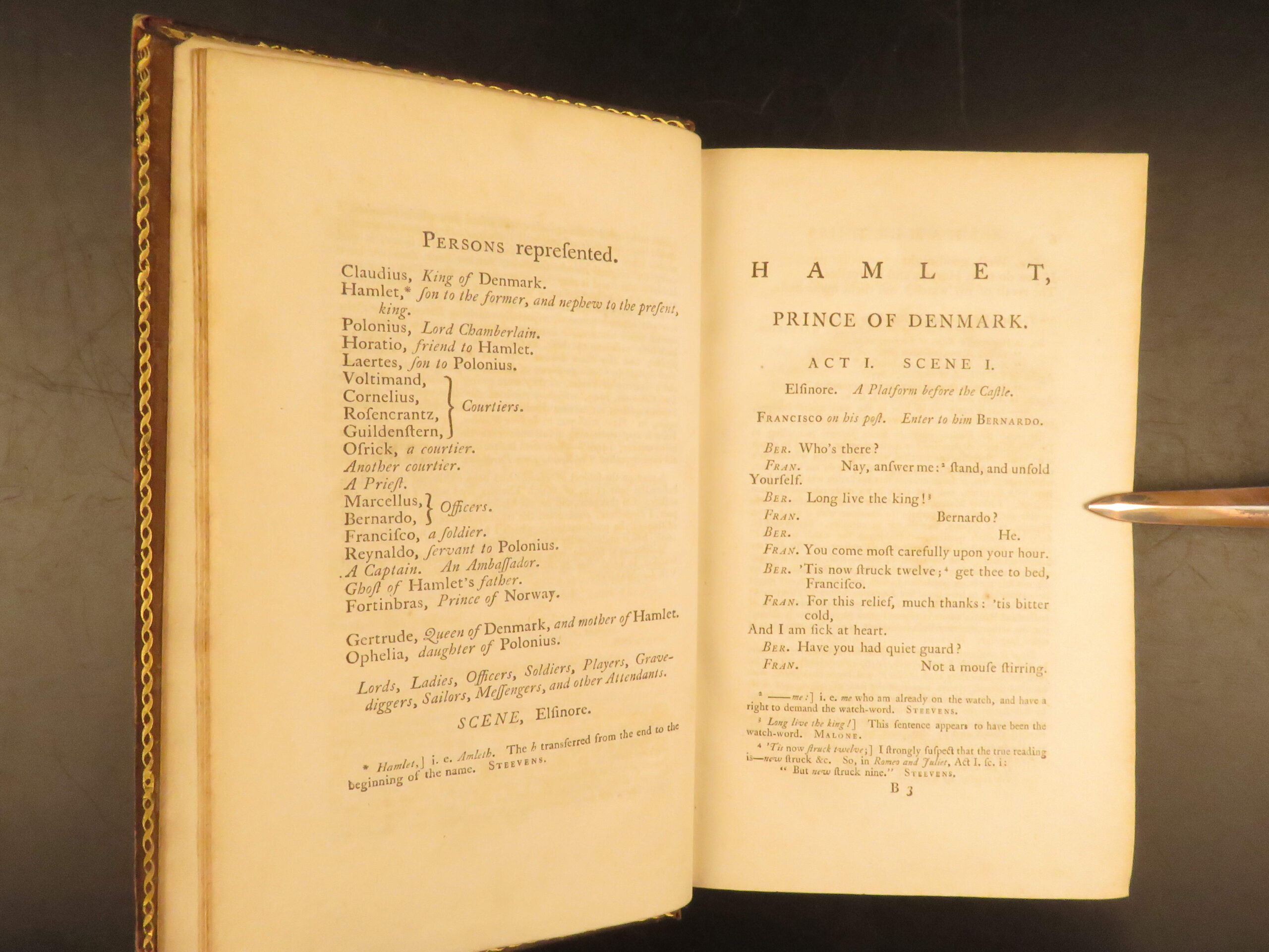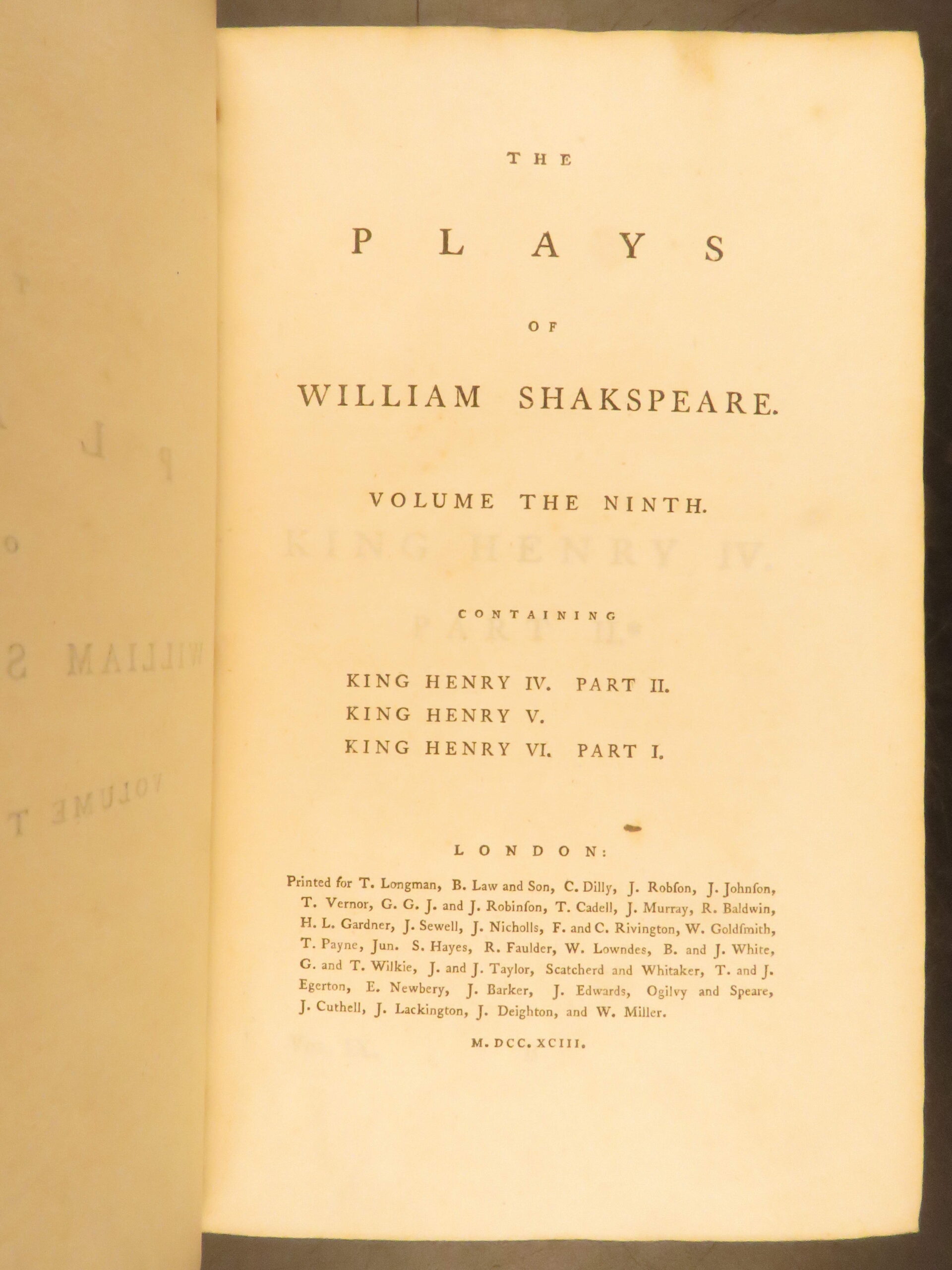 This 1793 edition is extremely desirable as it includes each of the famed plays of Shakespeare, but it also features a historical commentary and account of English theatre by Edmond Malone.