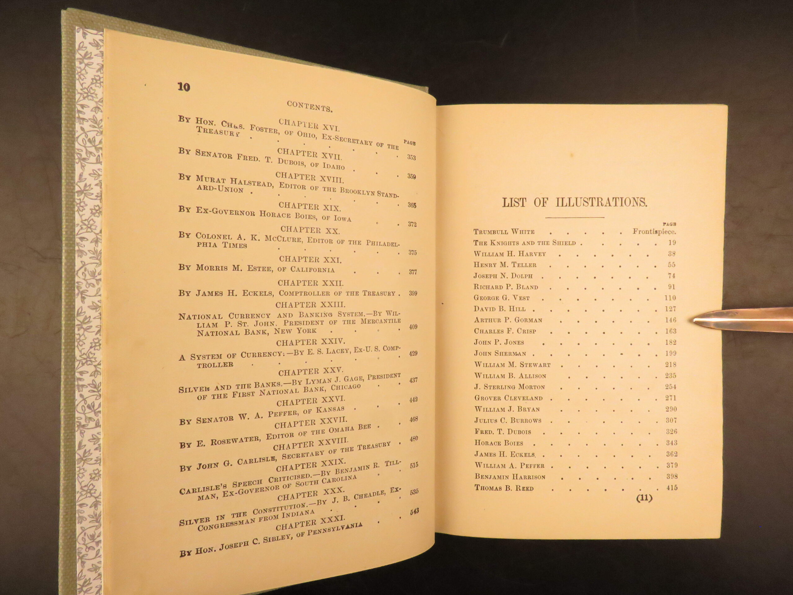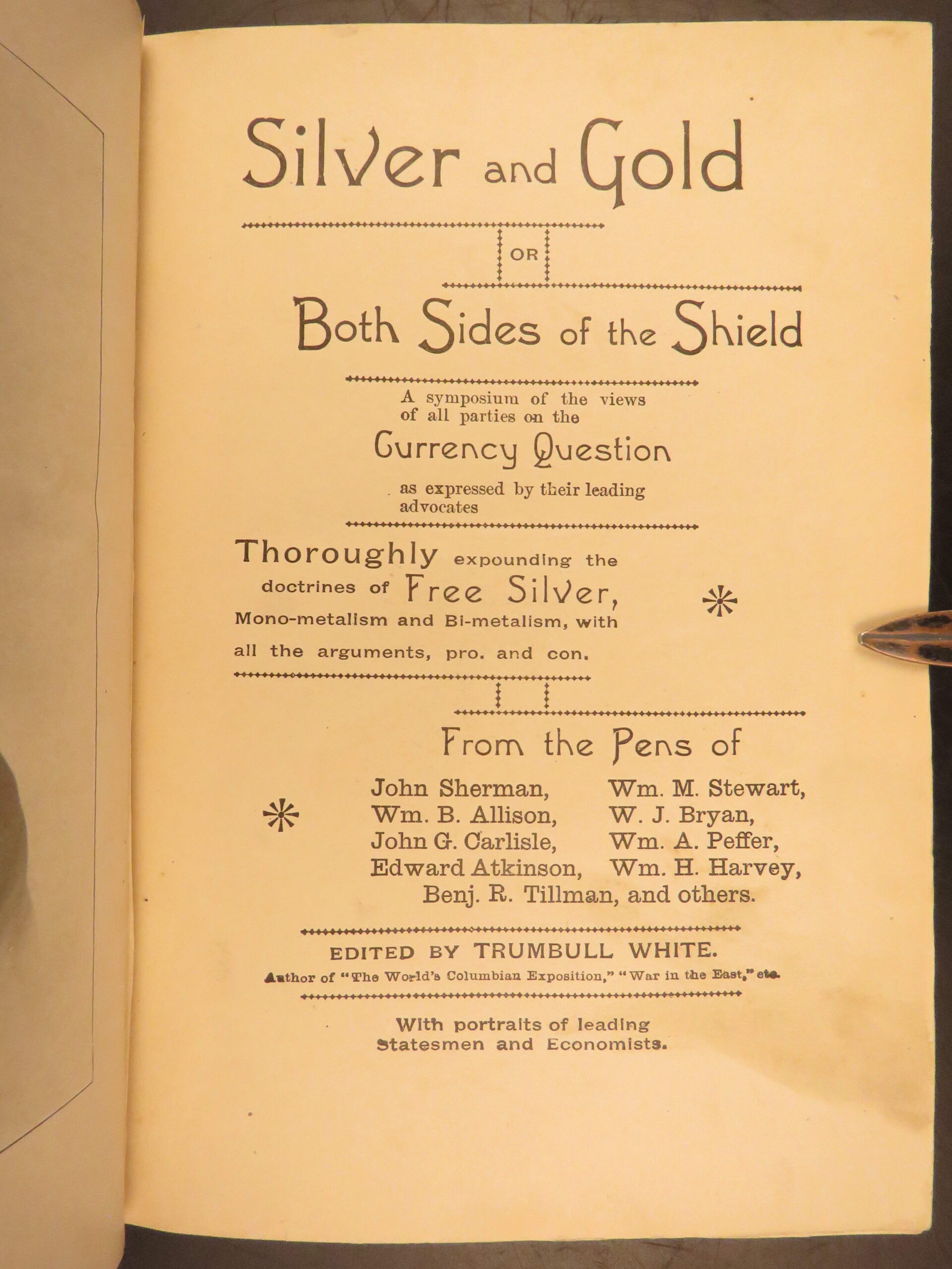 Silver and Gold or Both Sides of the Shield by Trumbull White is a late 19th-century survey of the controversies concerning gold and silver in American economics. Published during the fallout of the Panic of 1893, this book describes the political and economic arguments supporting both gold and silver standards in America. This first edition contains 32 portrait engravings of notable figures.