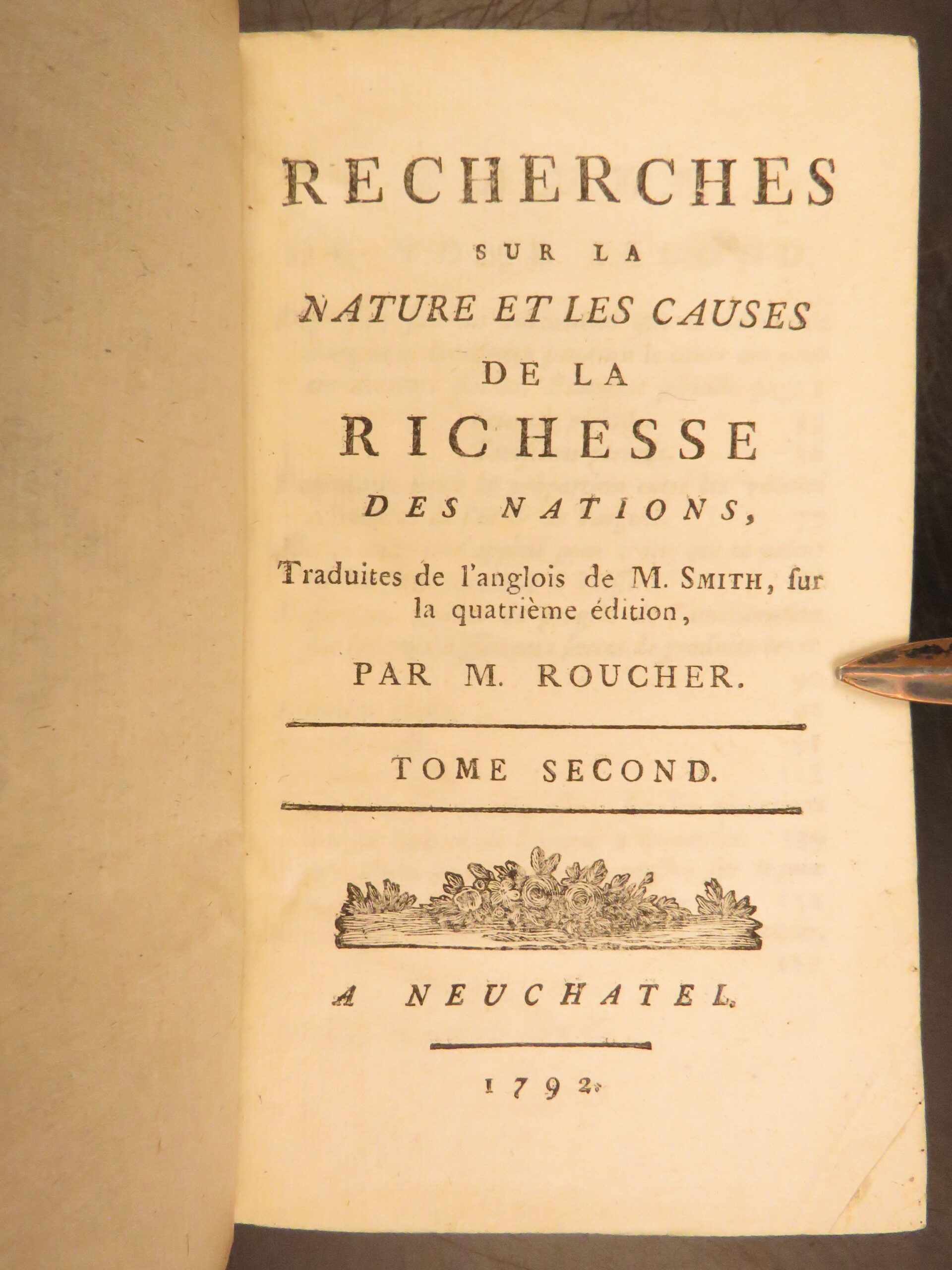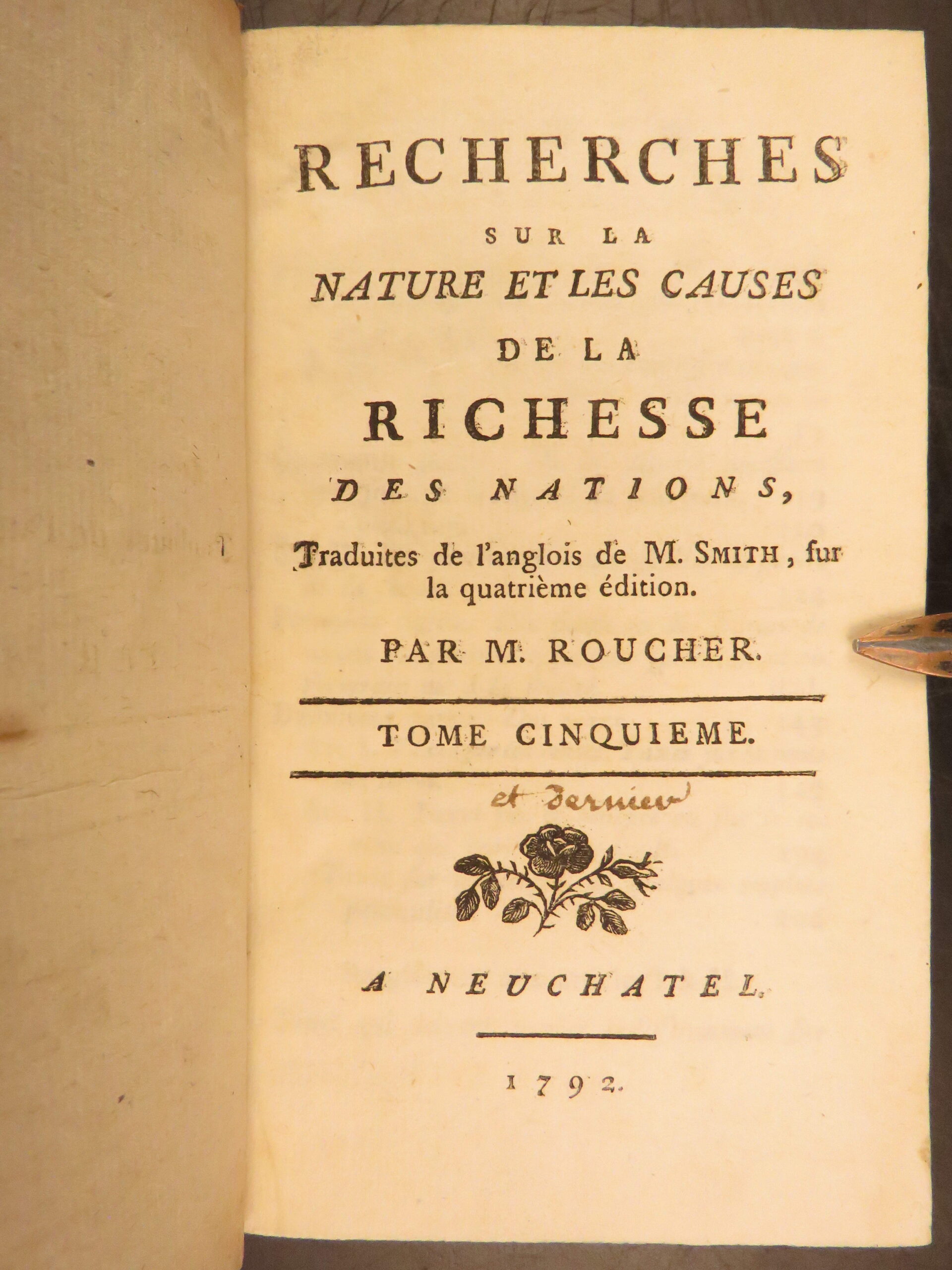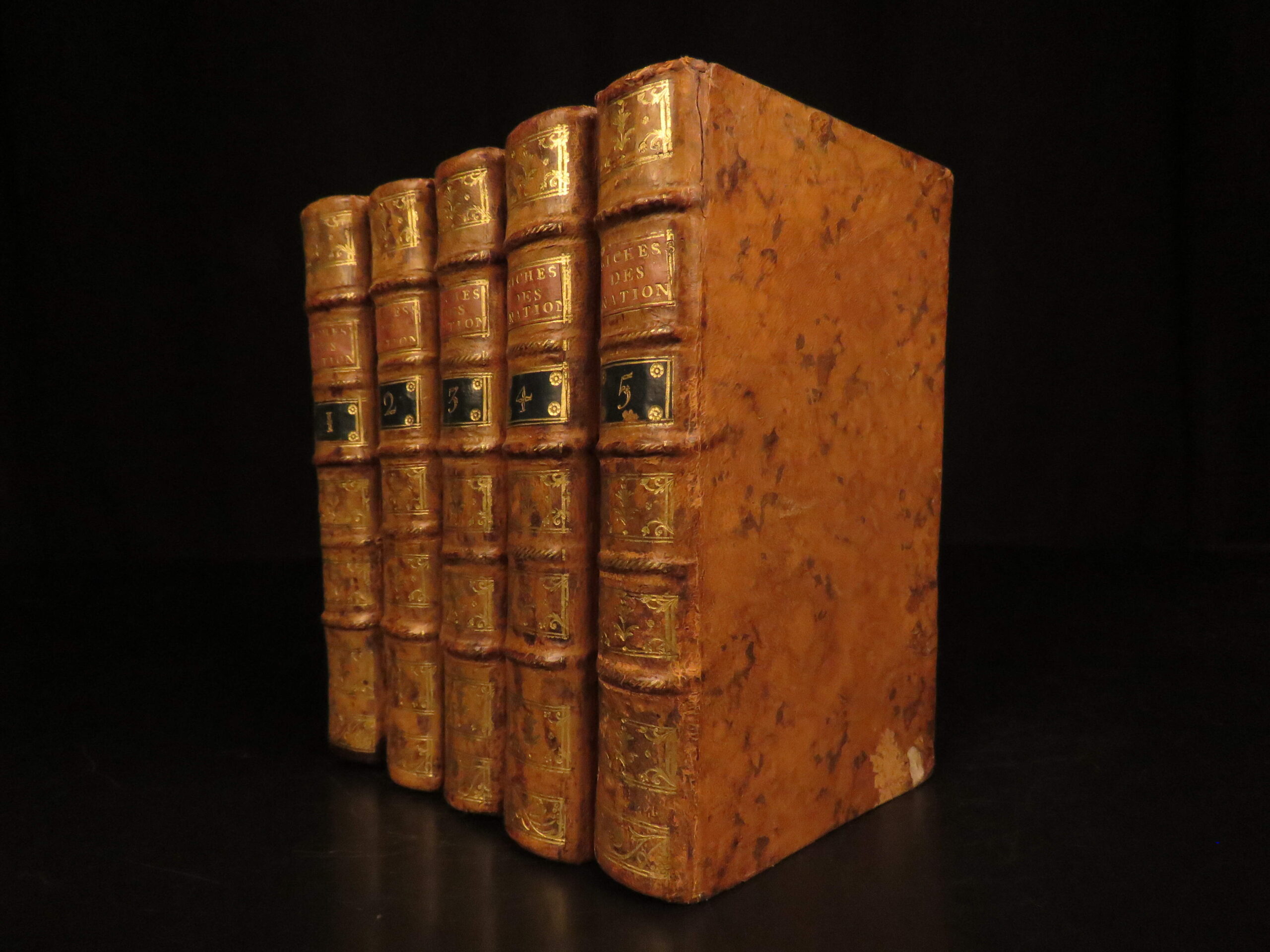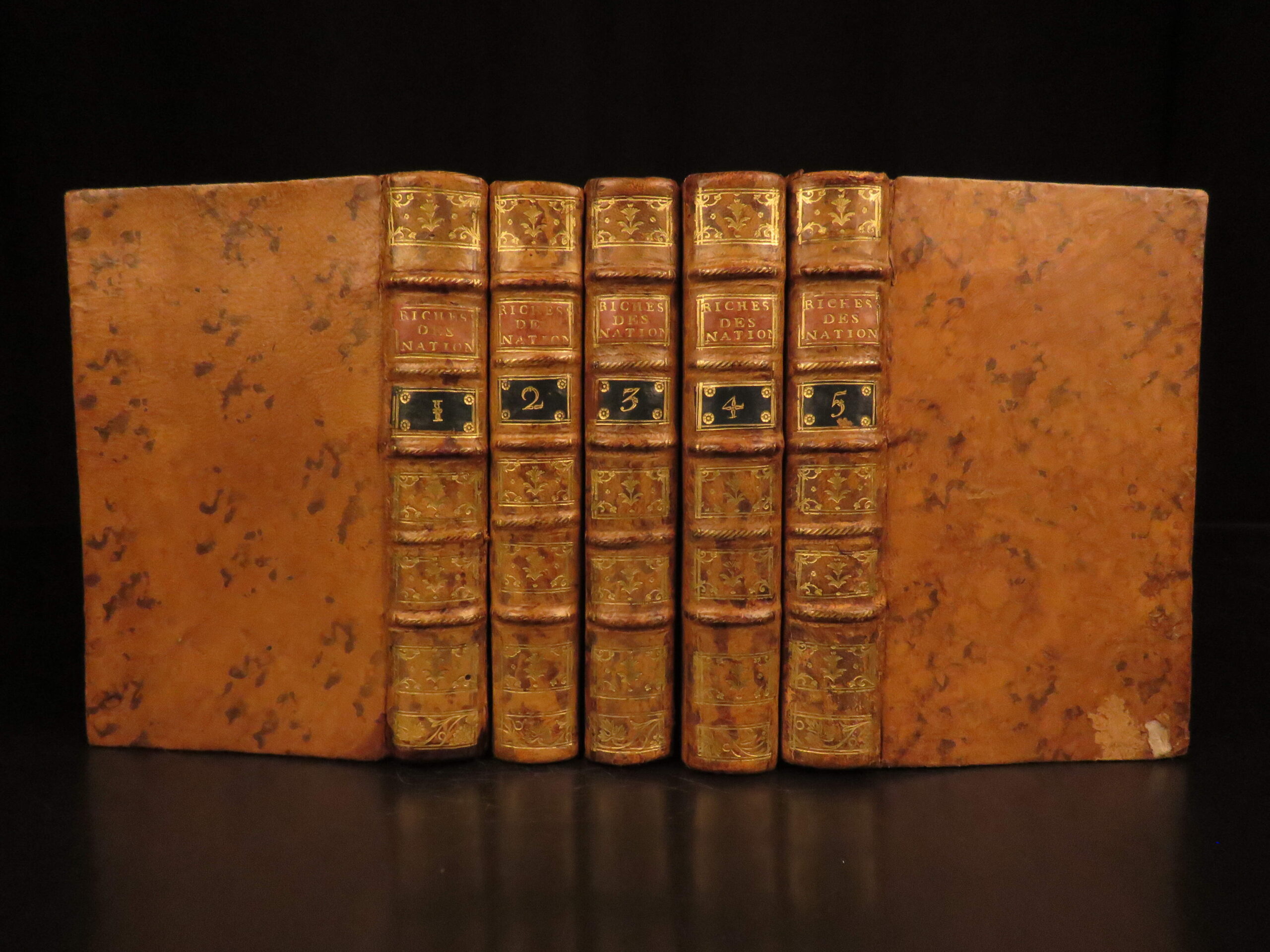 1792 Neuchatel five volume French edition of Adam Smith’s Richesse des Nations, translated by Jean-Antoine Roucher, a key Enlightenment printing of early economic theory.