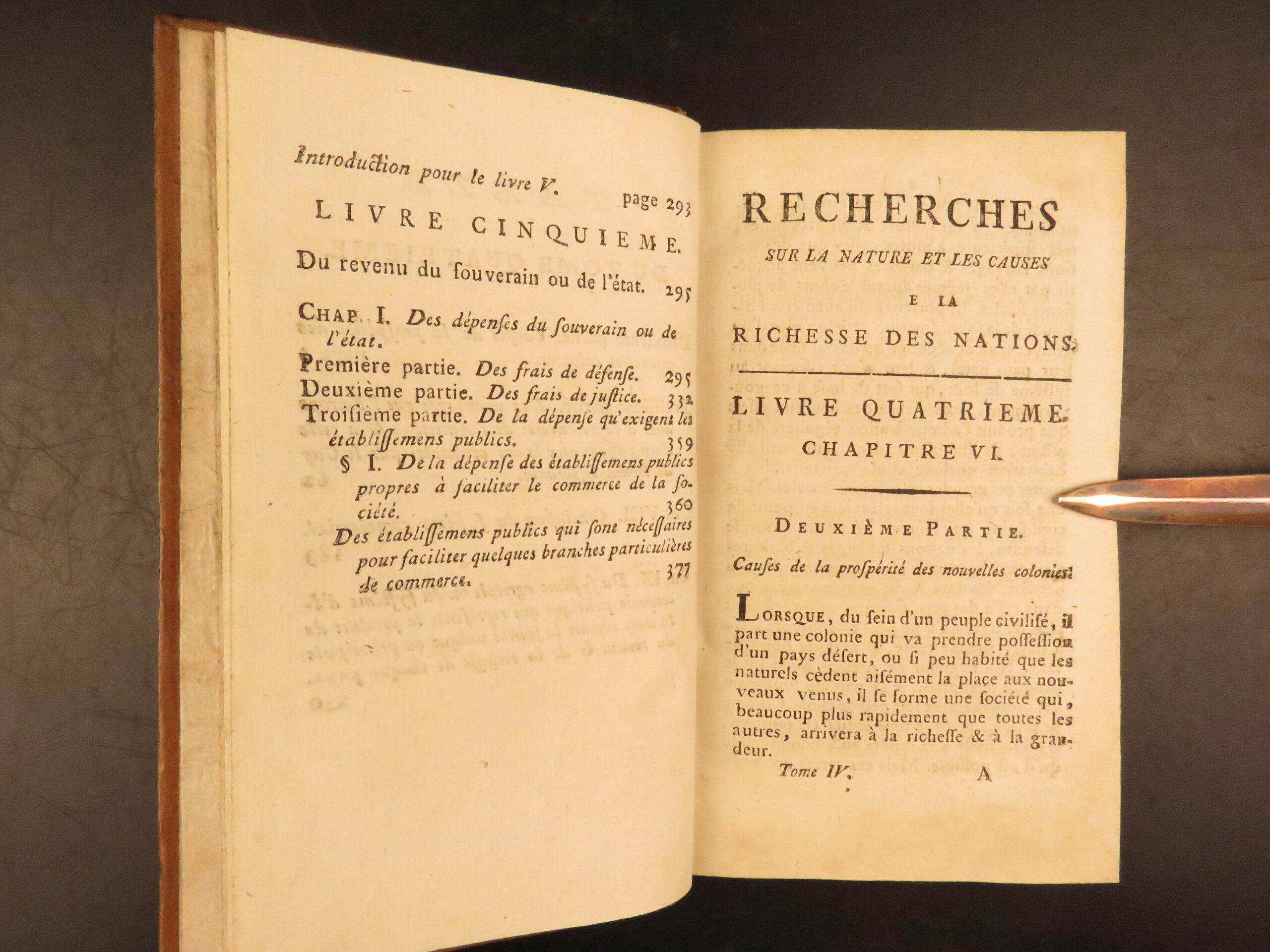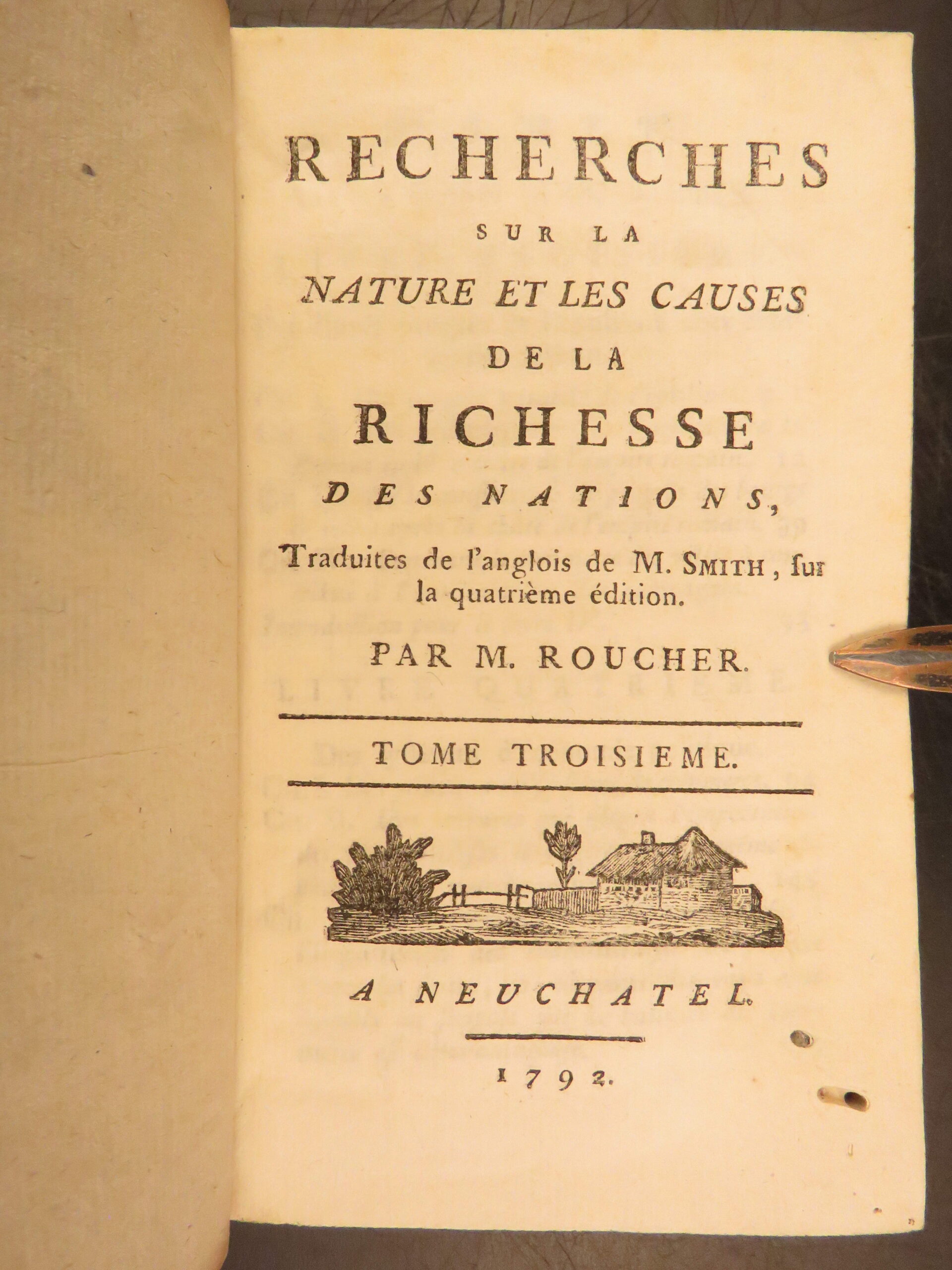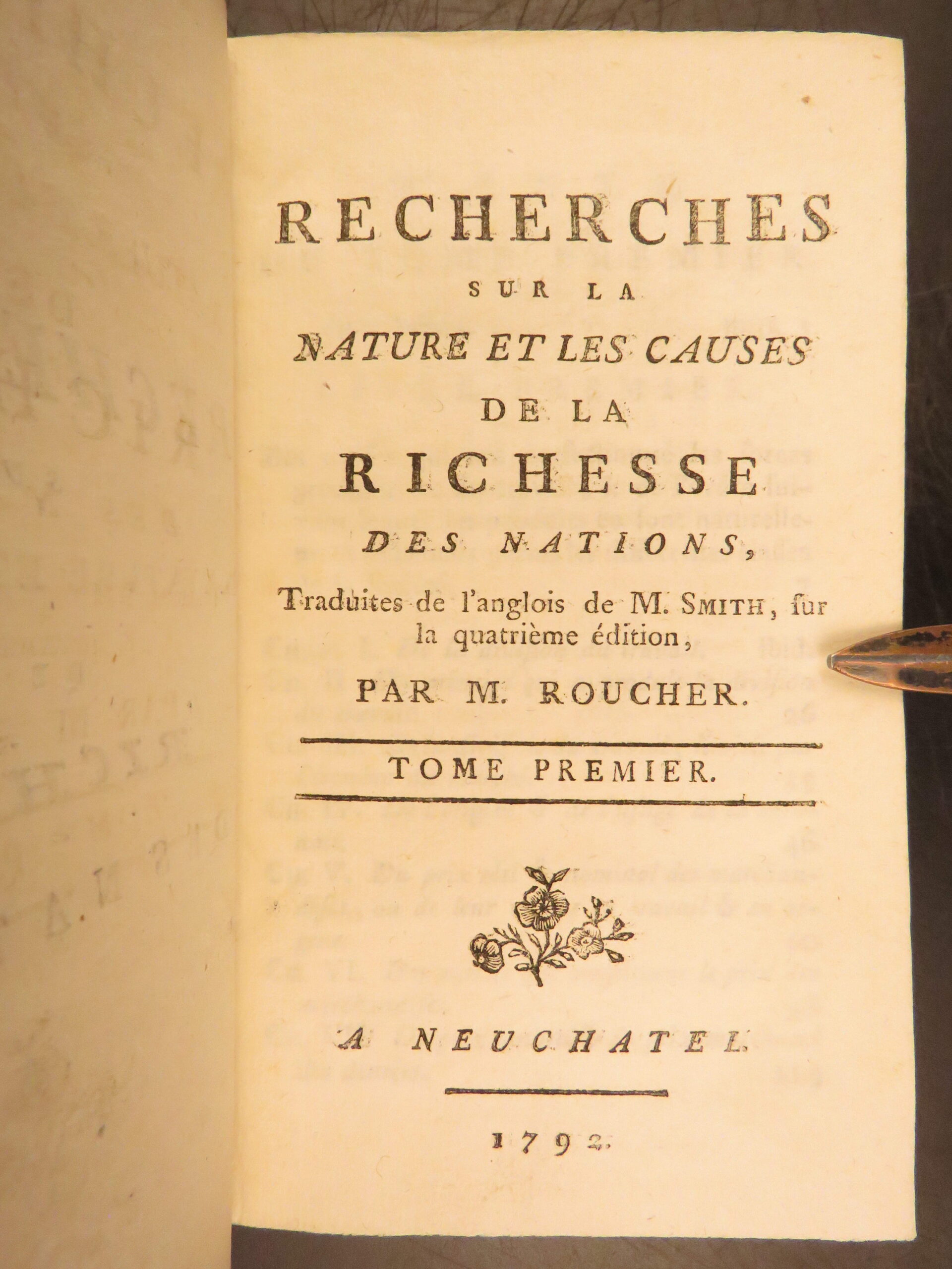 1792 Neuchatel five volume French edition of Adam Smith’s Richesse des Nations, translated by Jean-Antoine Roucher, a key Enlightenment printing of early economic theory.