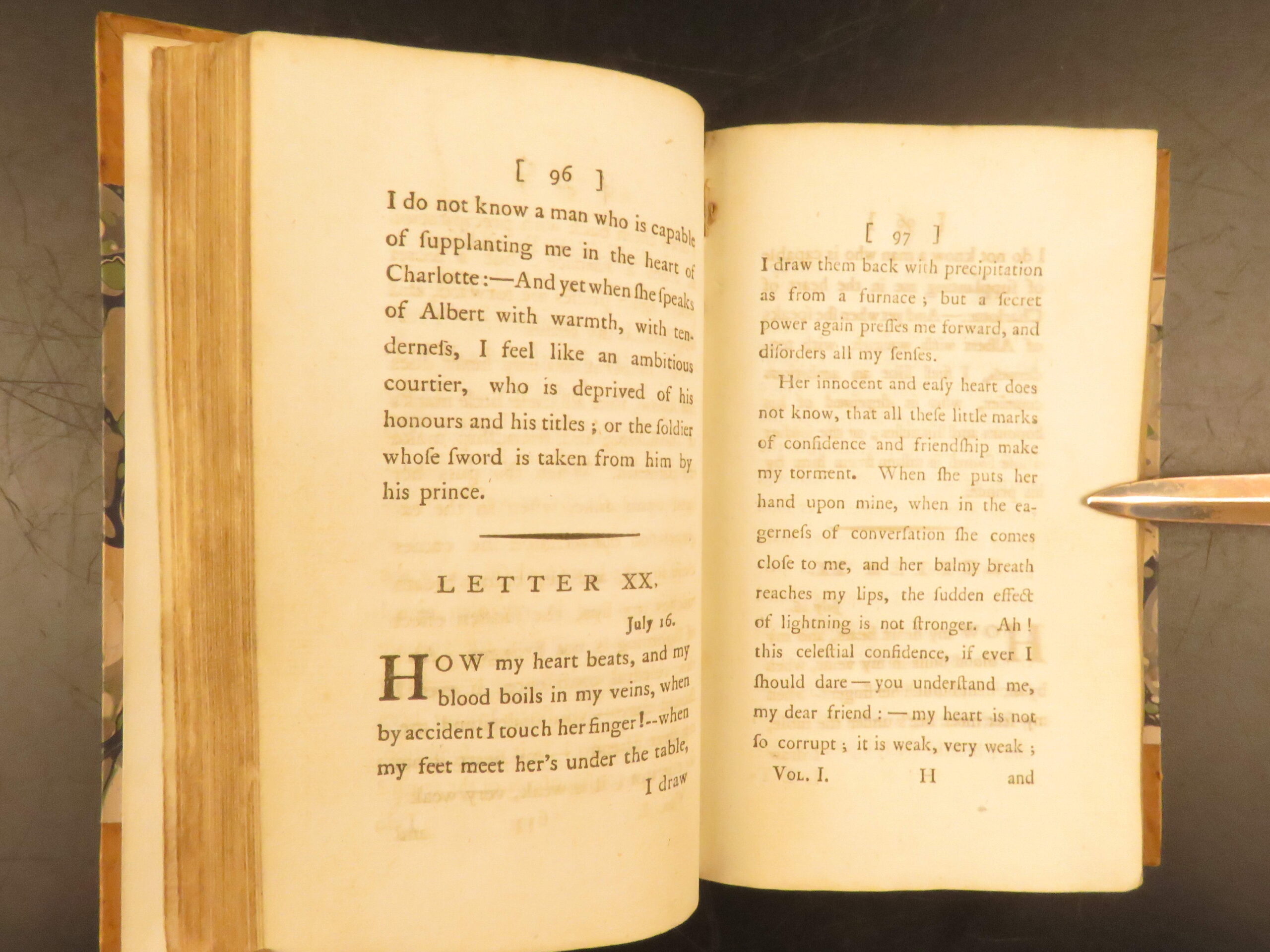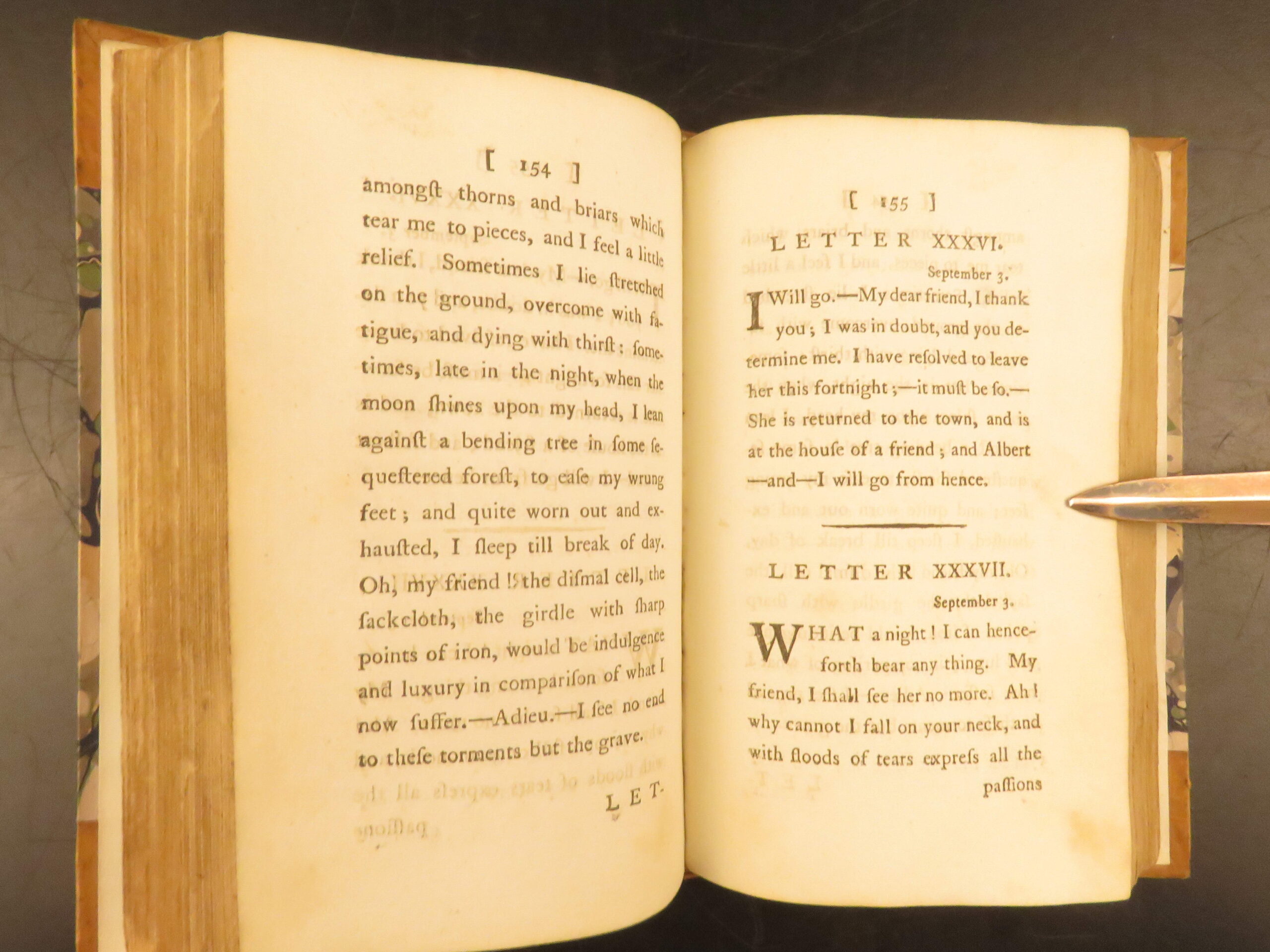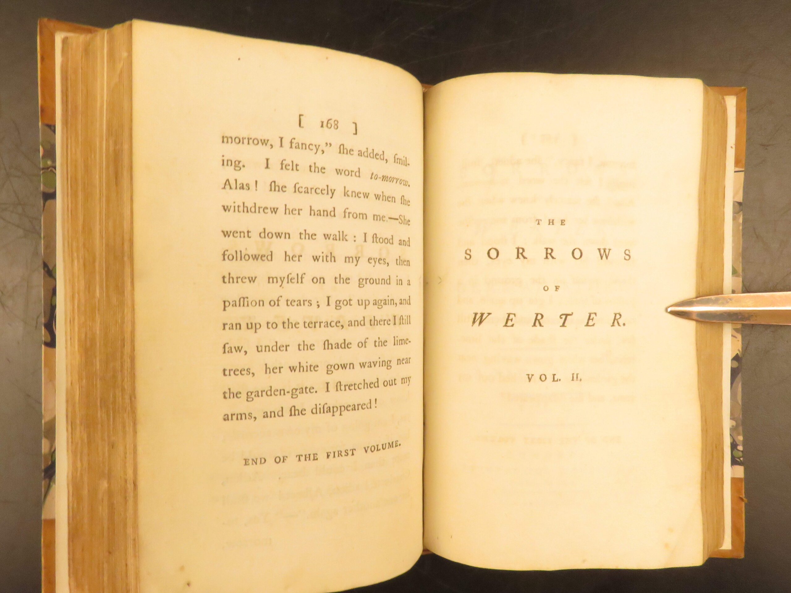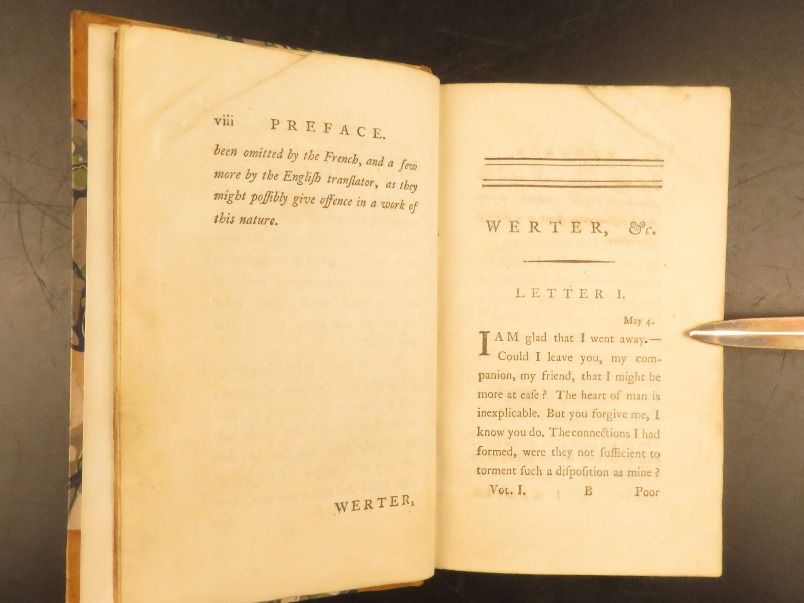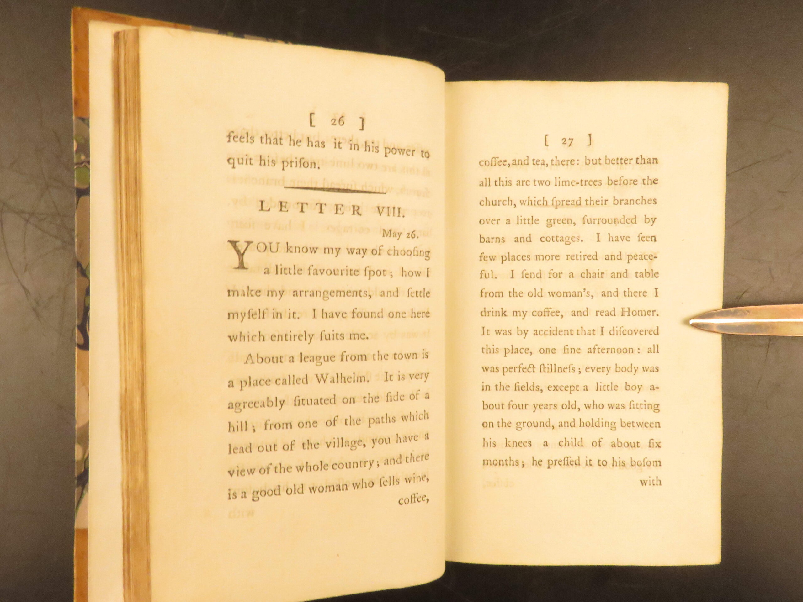 1784 English translation of Goethe’s Sorrows of Werter, issued in London in a two-volume-in-one format, bound in leather with marbled boards, a cornerstone of German Romantic literature in early English reception.