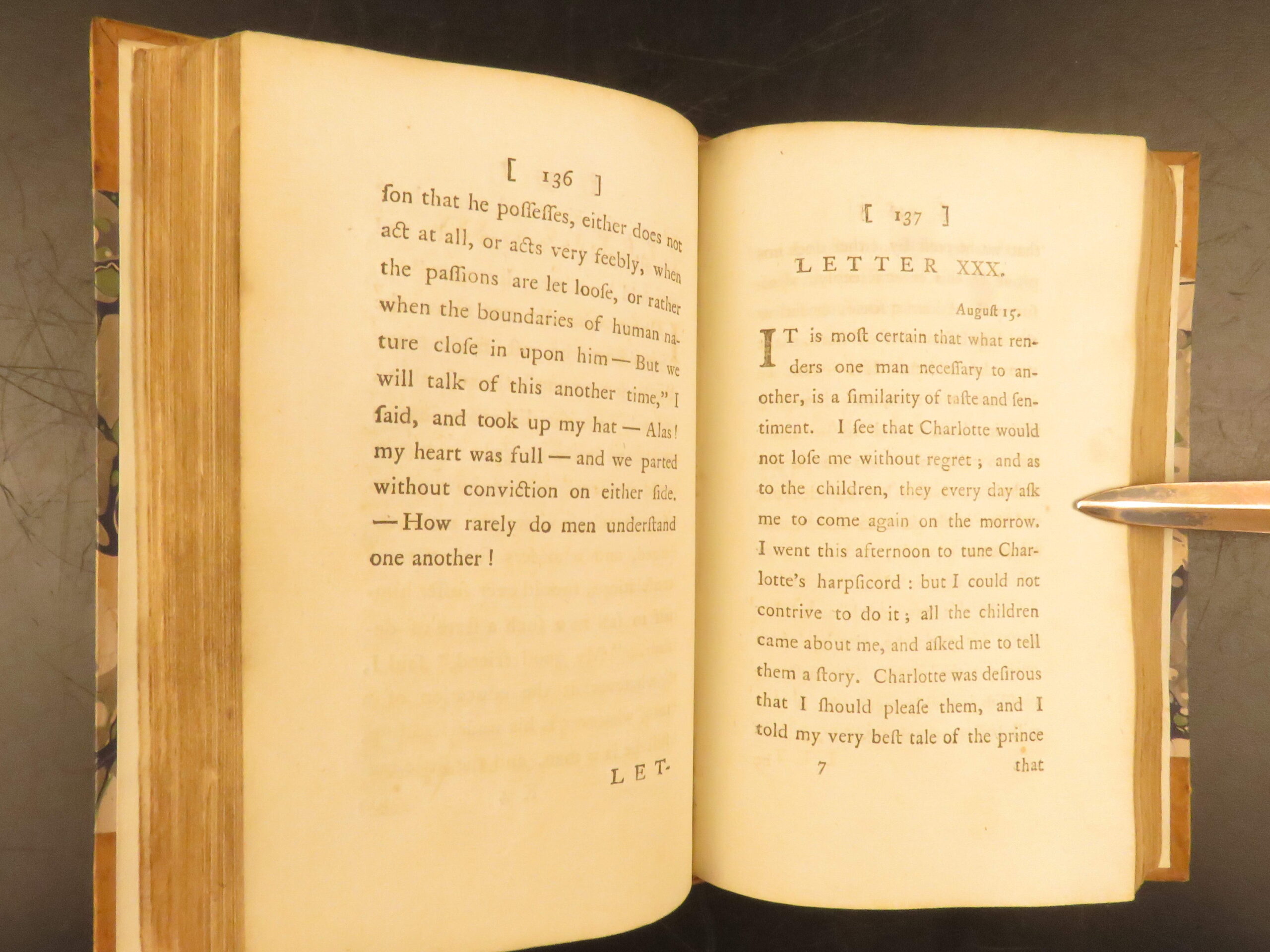 This 1784 English edition was translated by Richard Graves and is notable for being beautifully bound in gilt leather with marbled boards.