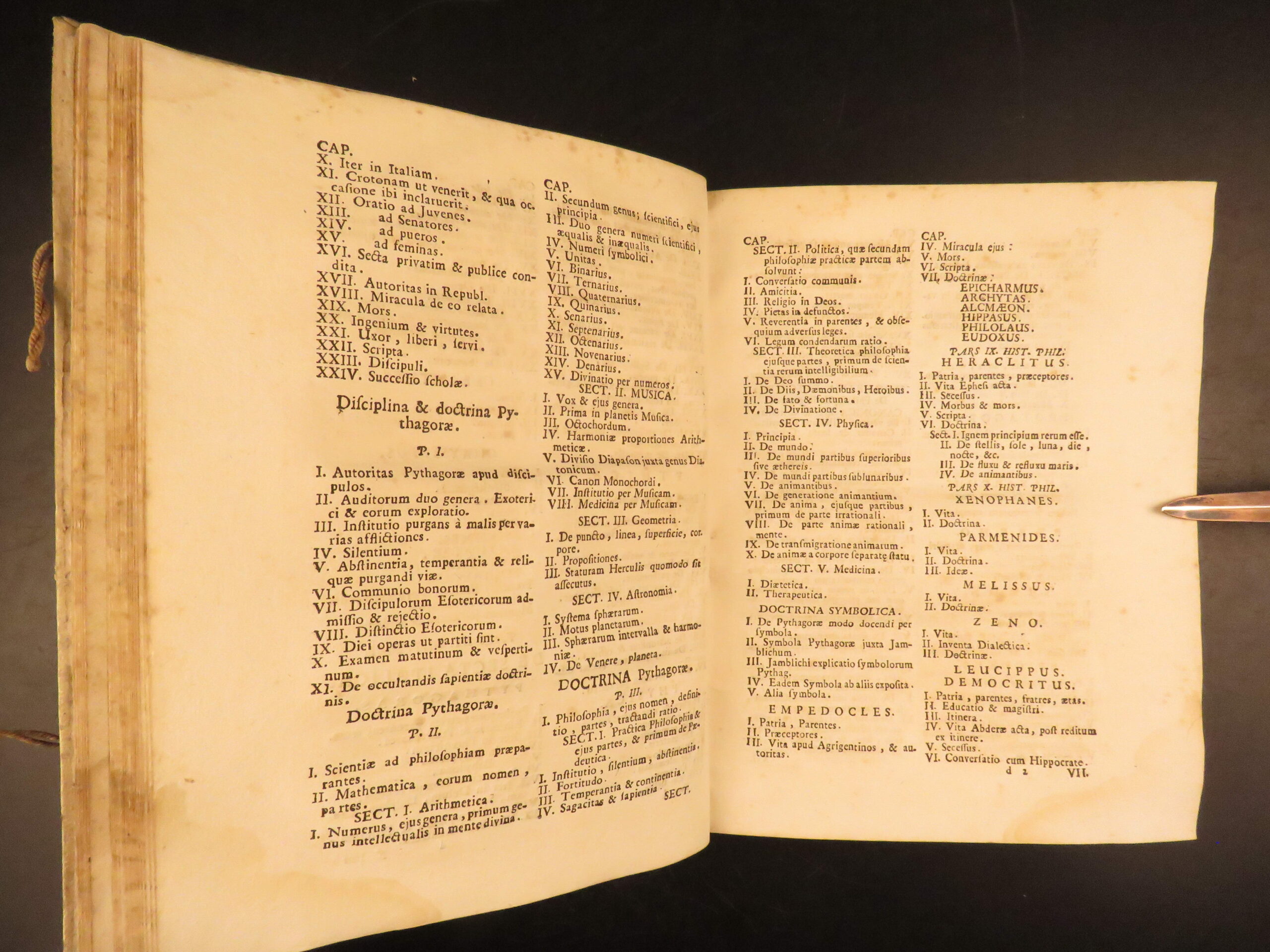 Thomas Stanley’s Historia philosophiae (1731), first Latin edition in three volumes printed in Venice, presents biographical accounts and teachings of classical Greek and Roman philosophers including Socrates, Plato, Aristotle, and Pythagoras.