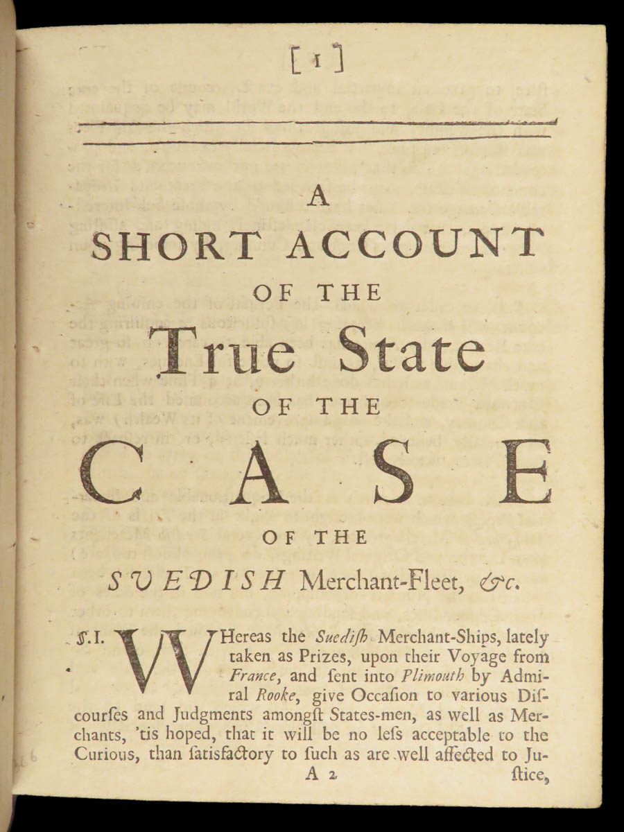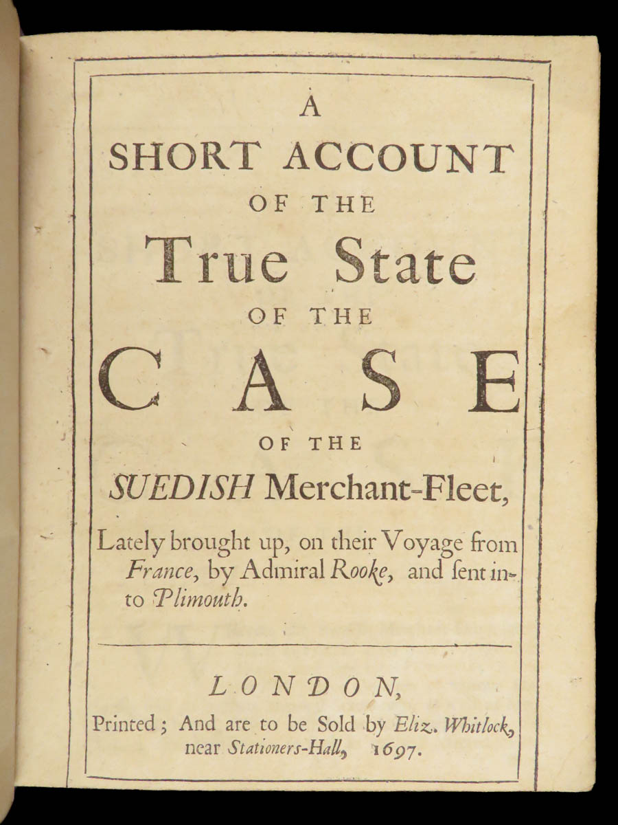A Short Account of the True State of the Case of the Suedish Merchant-Fleet is a 1697 first edition addressing the capture of a Swedish merchant-fleet on its return from France by George Rooke. This short work raised questions of maritime law, neutrality, and trade regulations at the end of the Nine Years’ War.