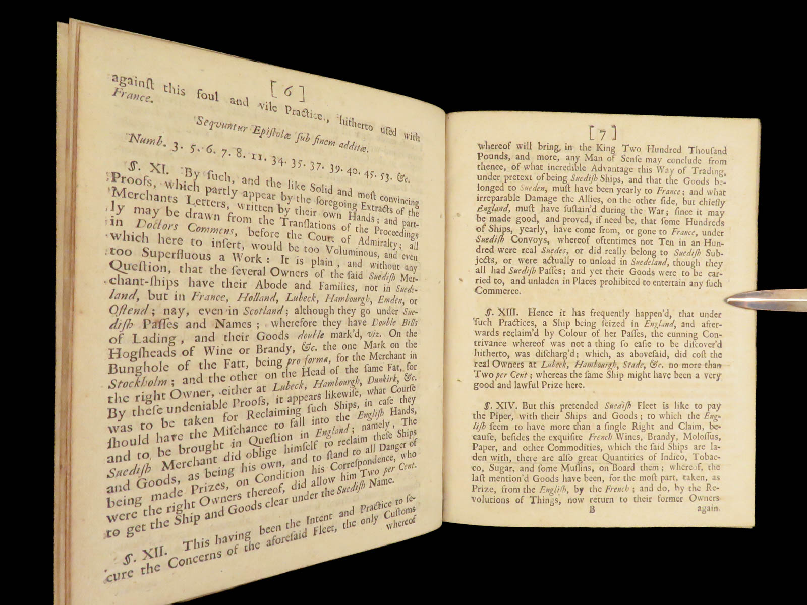 This work highlights accusations that Swedish and French merchants acted together in questionable commerce, with an appendix exposing how foreign merchants purchased and flew Swedish flags by paying a two percent fee.