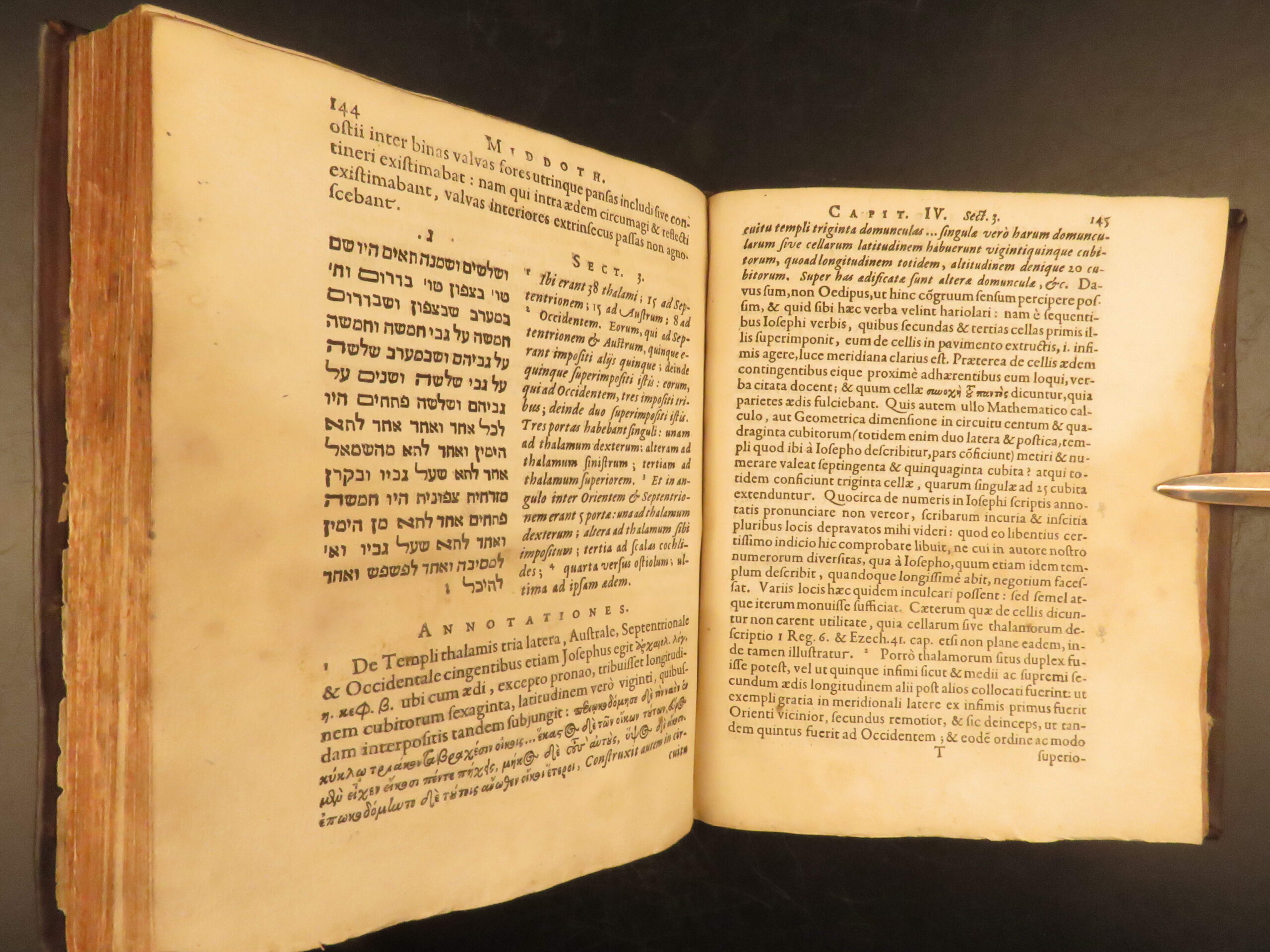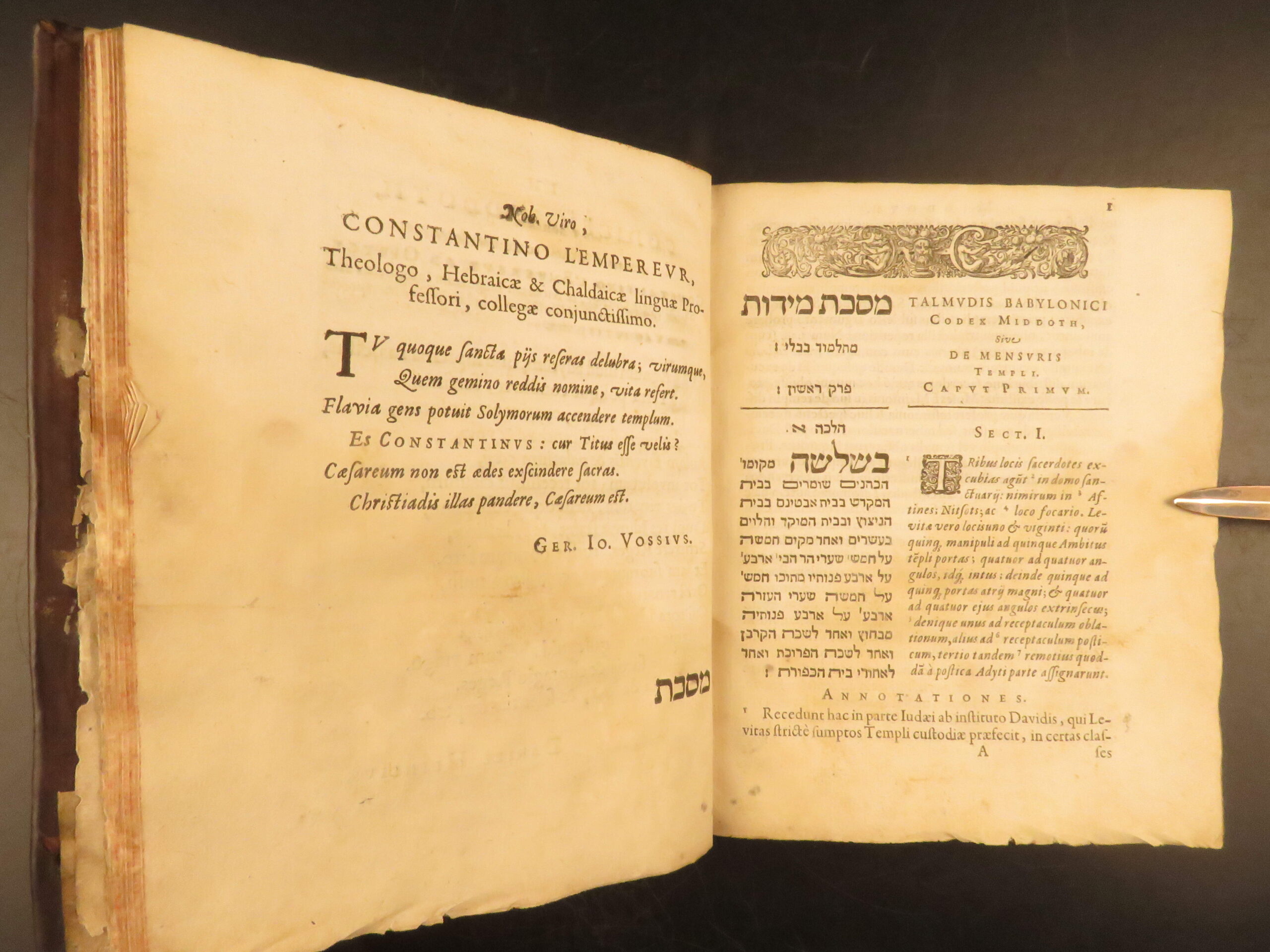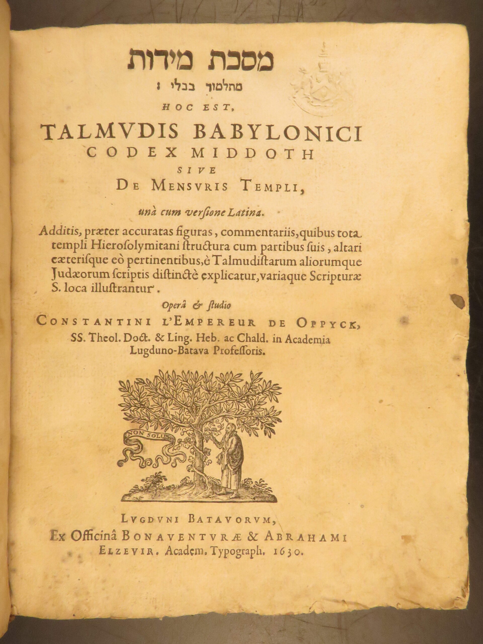 L’Empereur’s 1630 Latin-Hebrew edition of the Mishnah tractate Middot, printed by Elzevir in Leiden, highlights early Christian Hebraist scholarship and remains a key text in the study of Temple architecture.