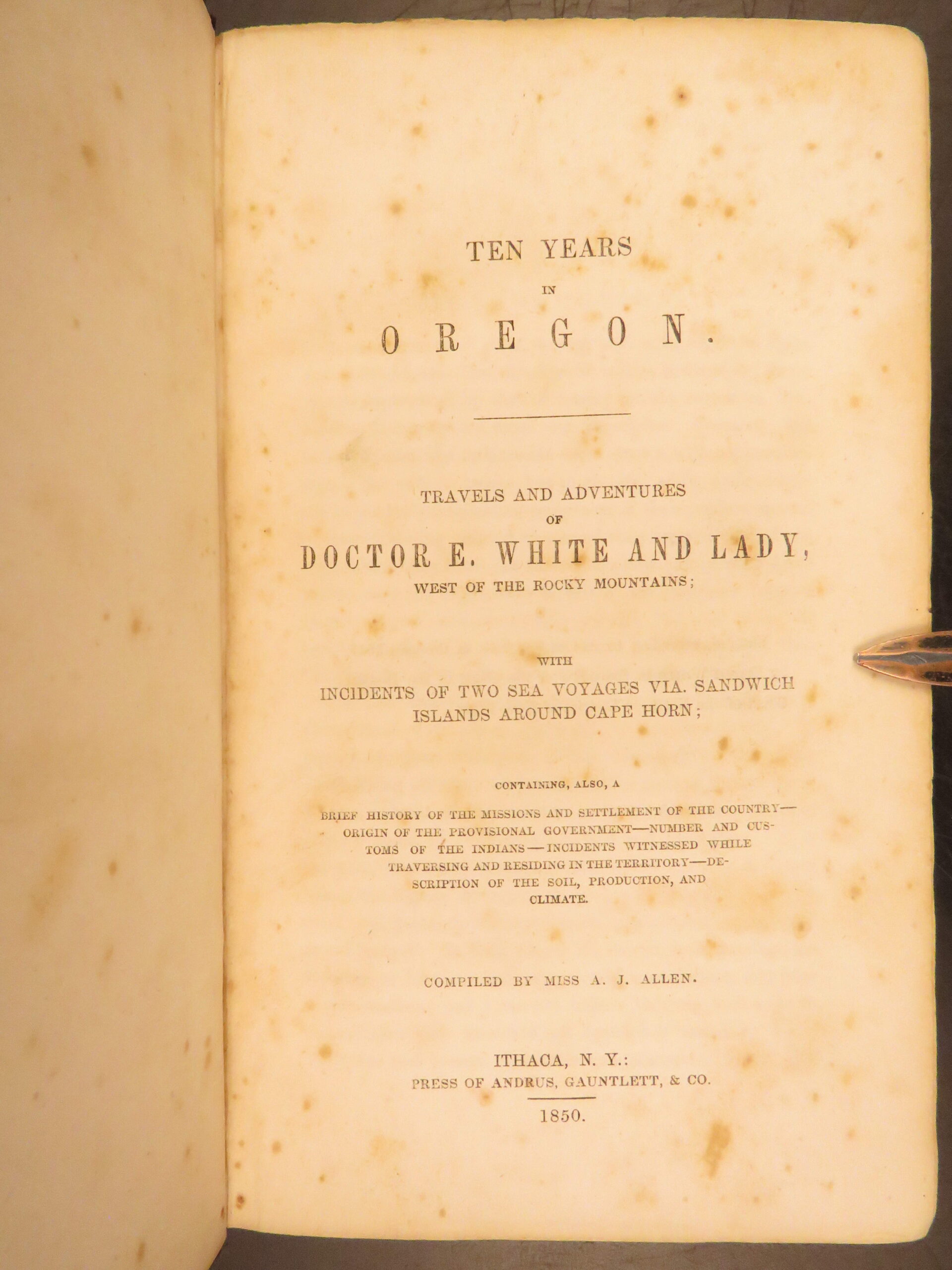 Ten Years in Oregon by A.J. Allen (1850) recounts overland and maritime travel west of the Rockies with reports on tribal customs, early Oregon governance, and encounters with wildlife.