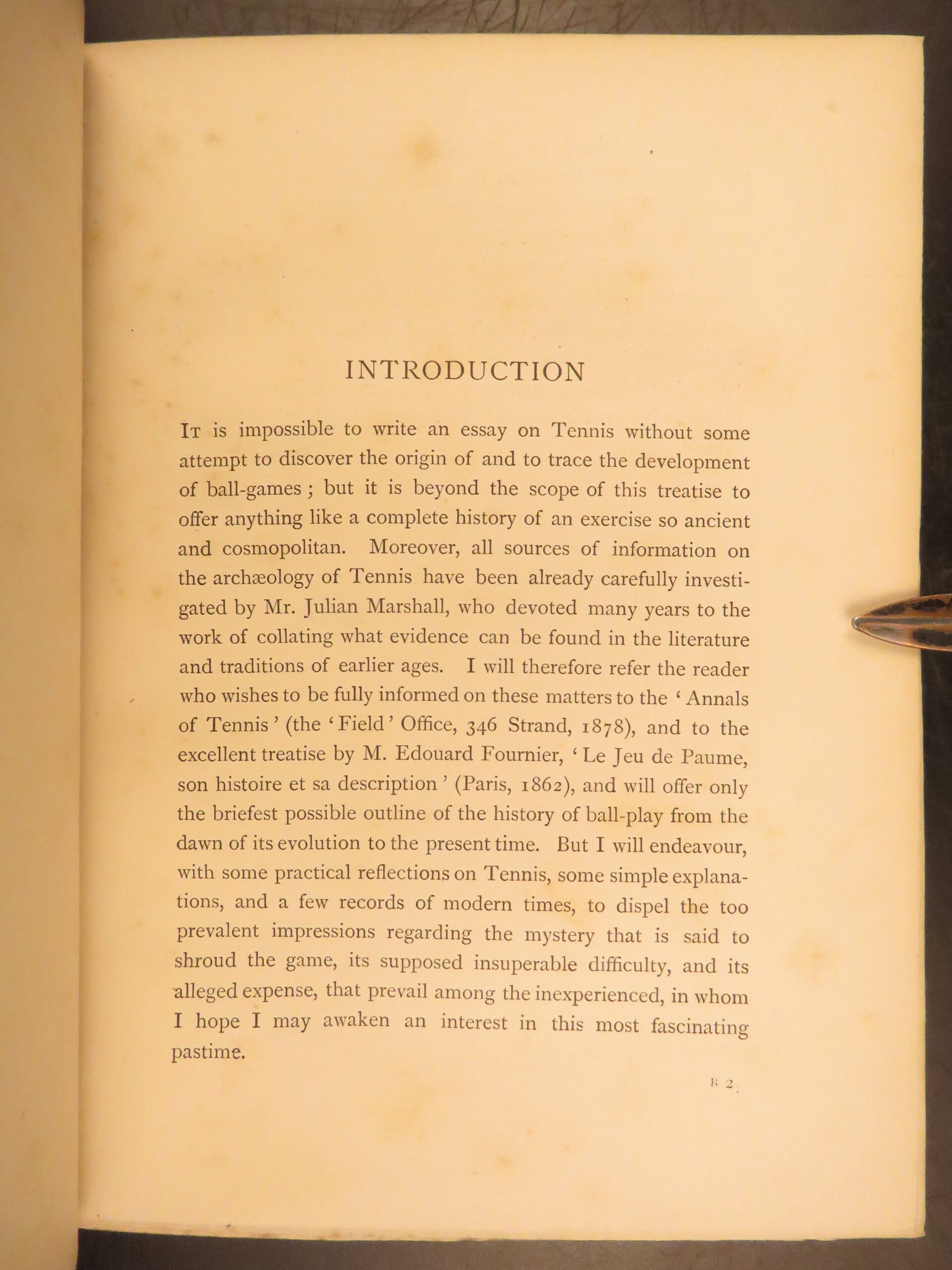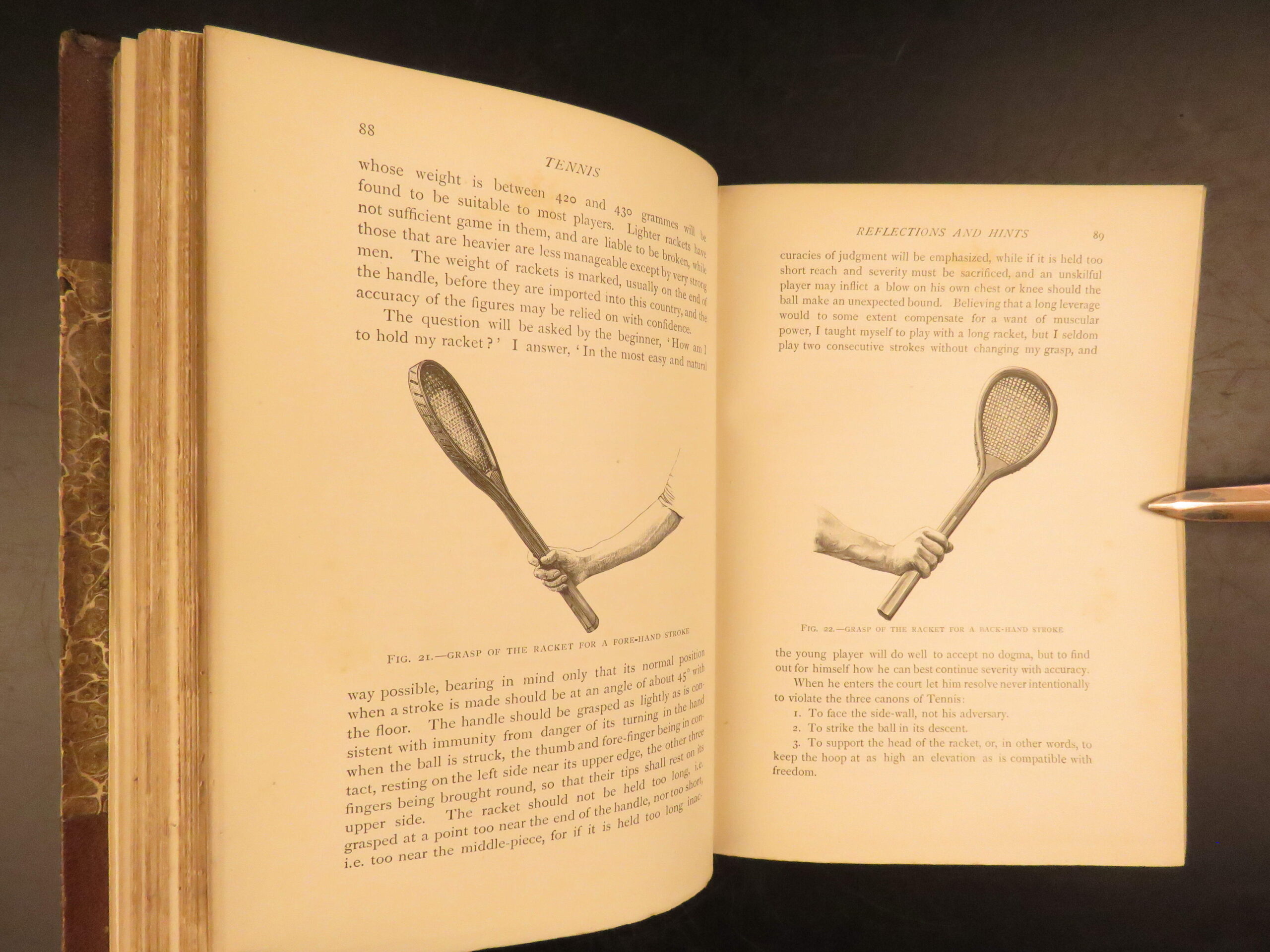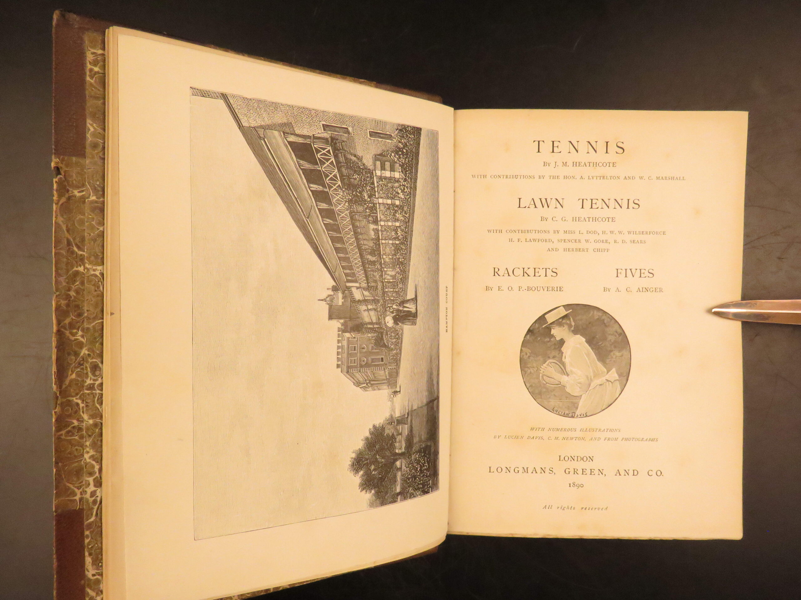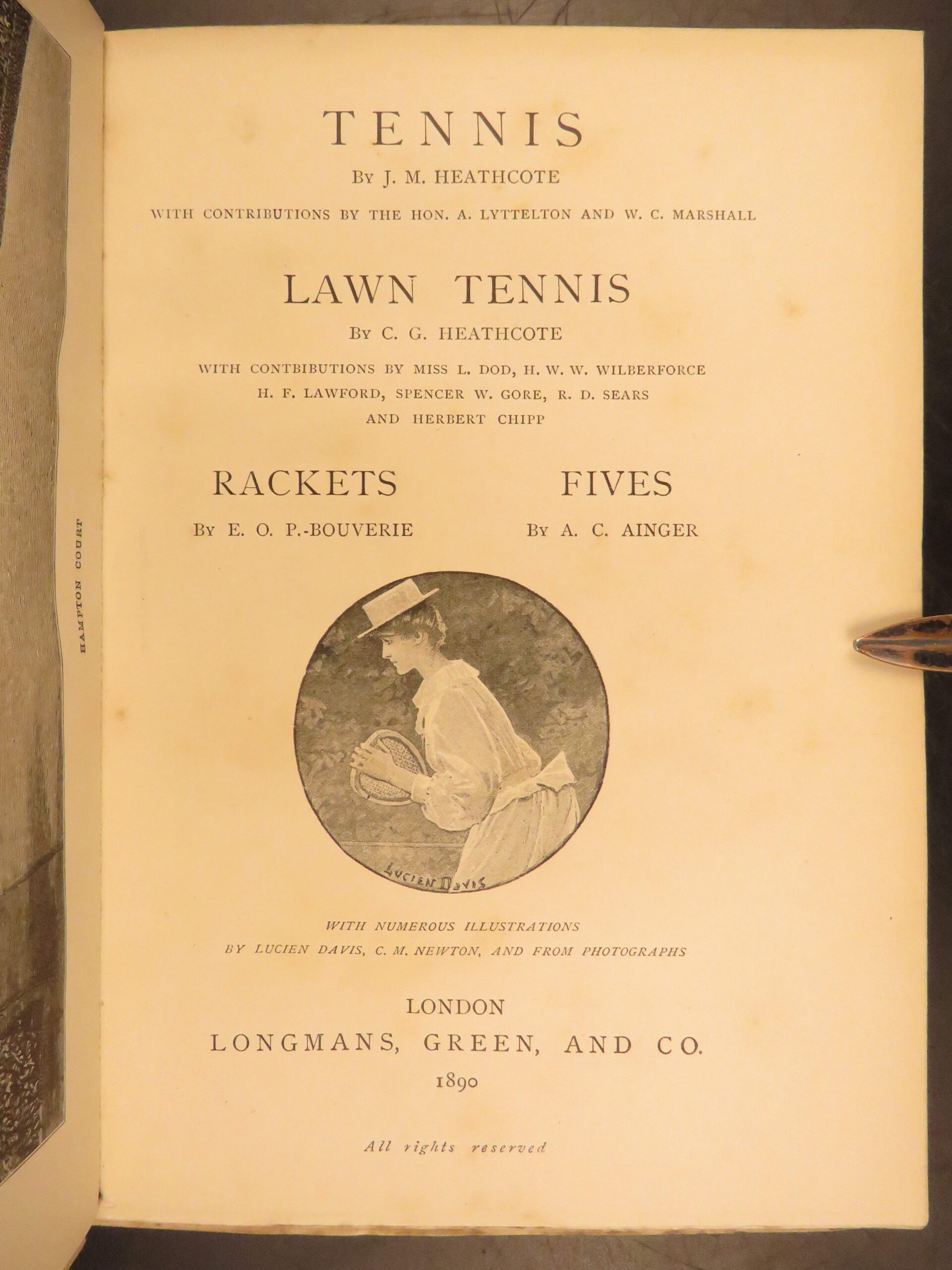 First edition of J. M. Heathcote’s Tennis: Lawn Tennis, Rackets, Fives (1890), a Victorian study of four racquet sports with illustrations and complete rules.