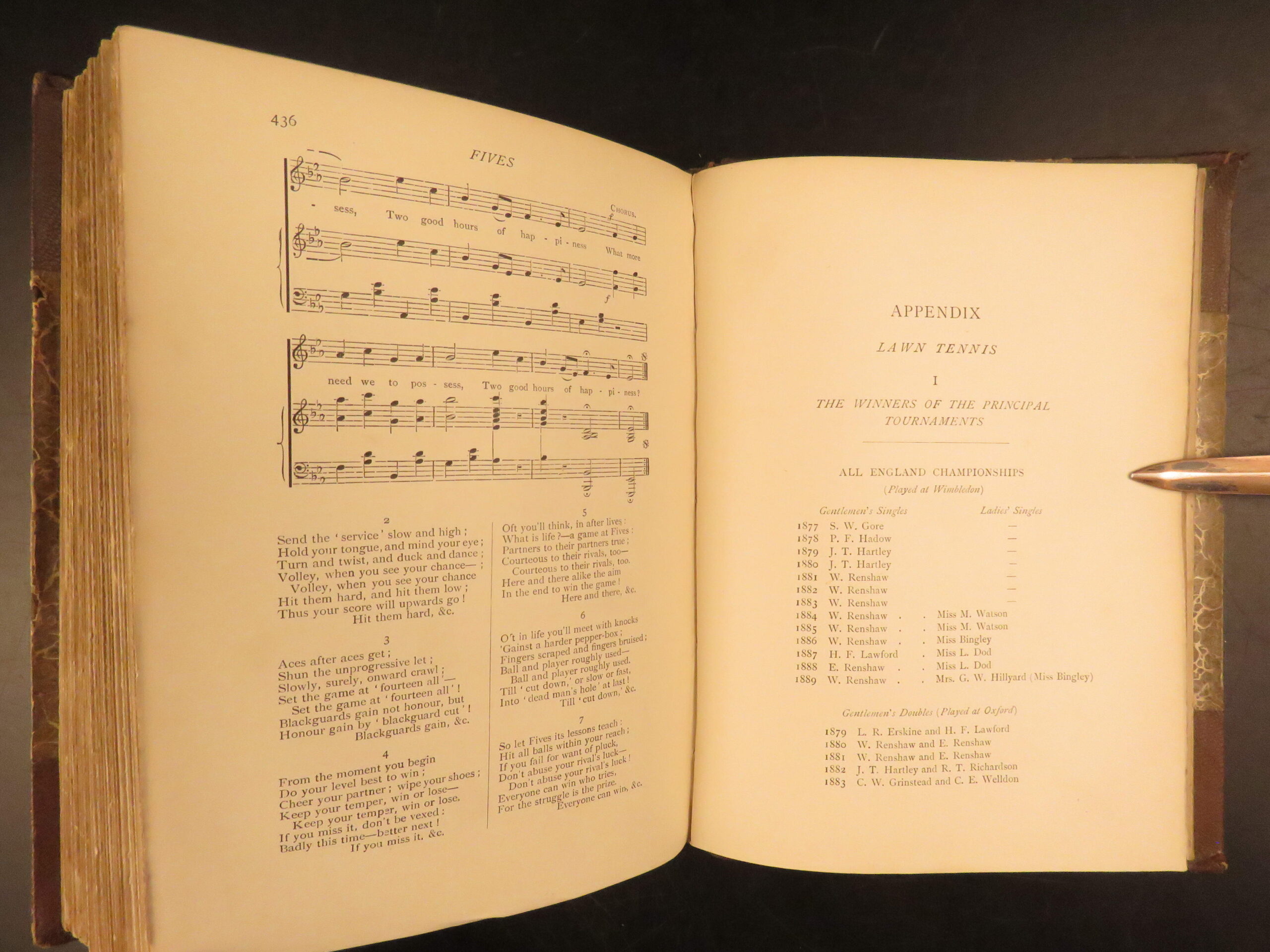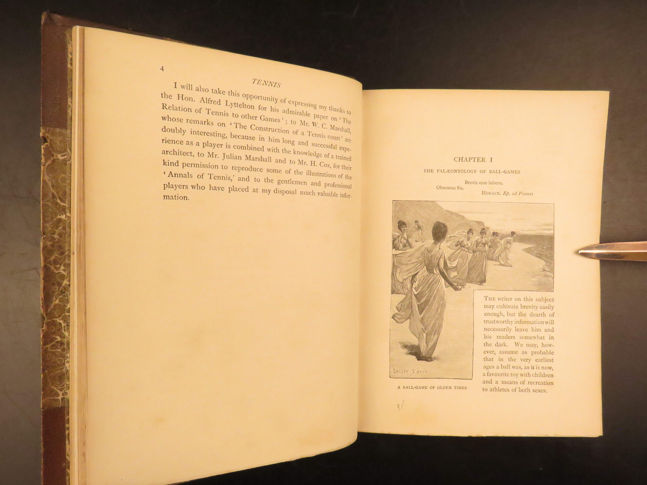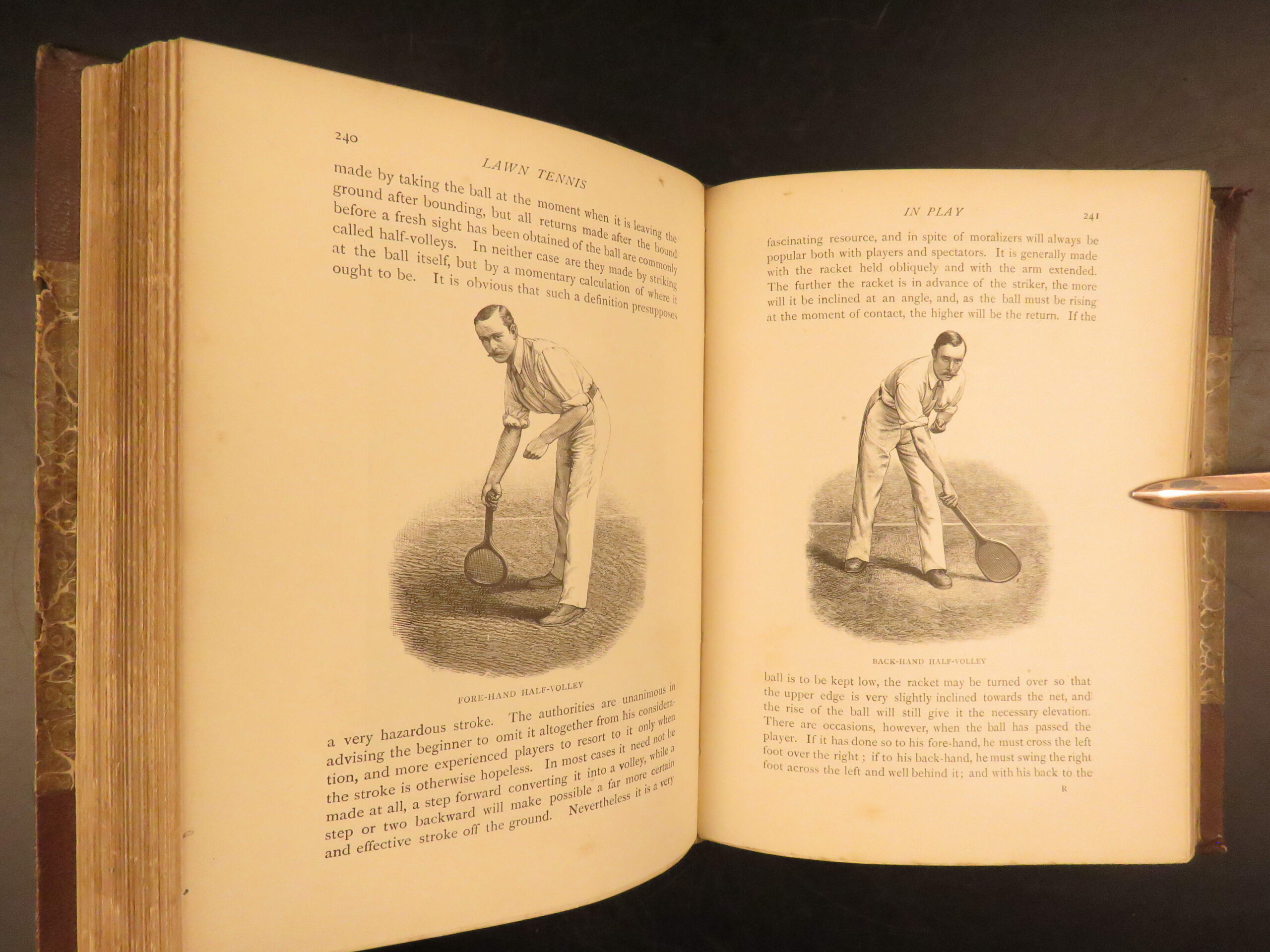 First edition of J. M. Heathcote’s Tennis: Lawn Tennis, Rackets, Fives (1890), a Victorian study of four racquet sports with illustrations and complete rules.