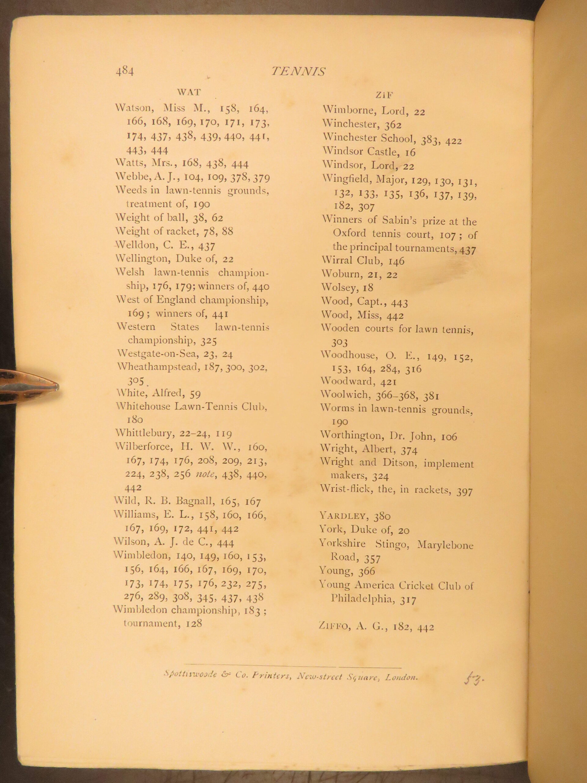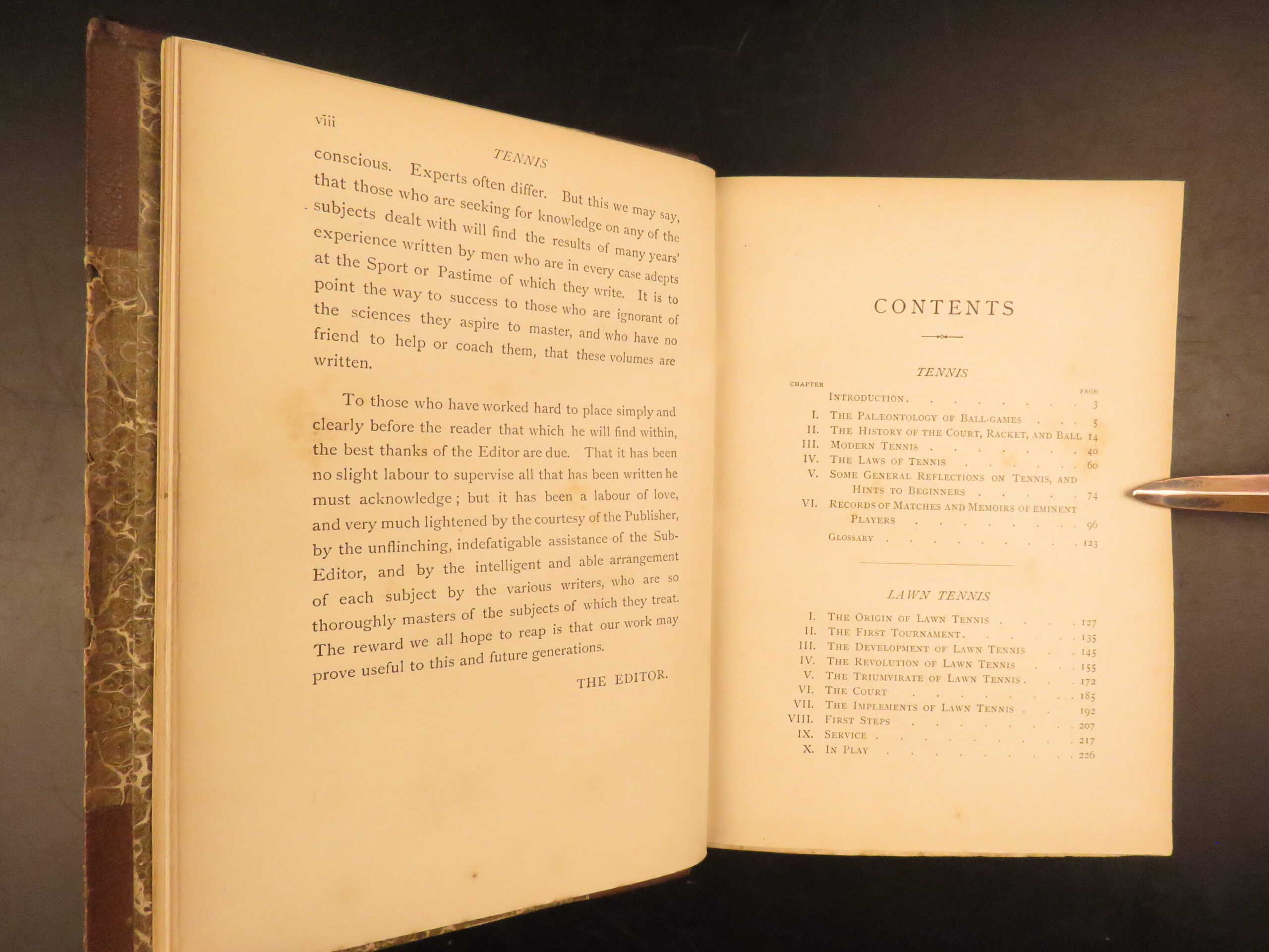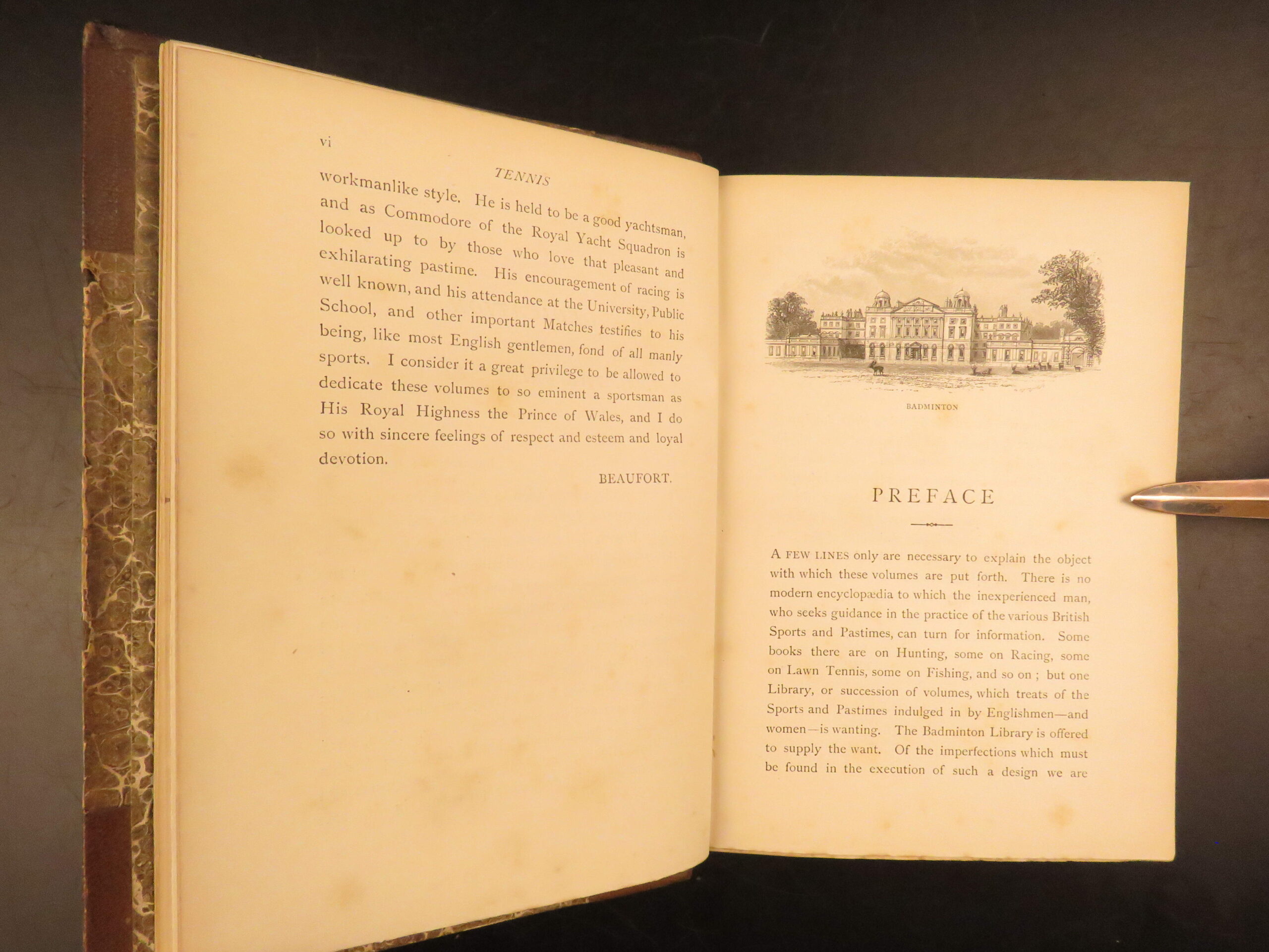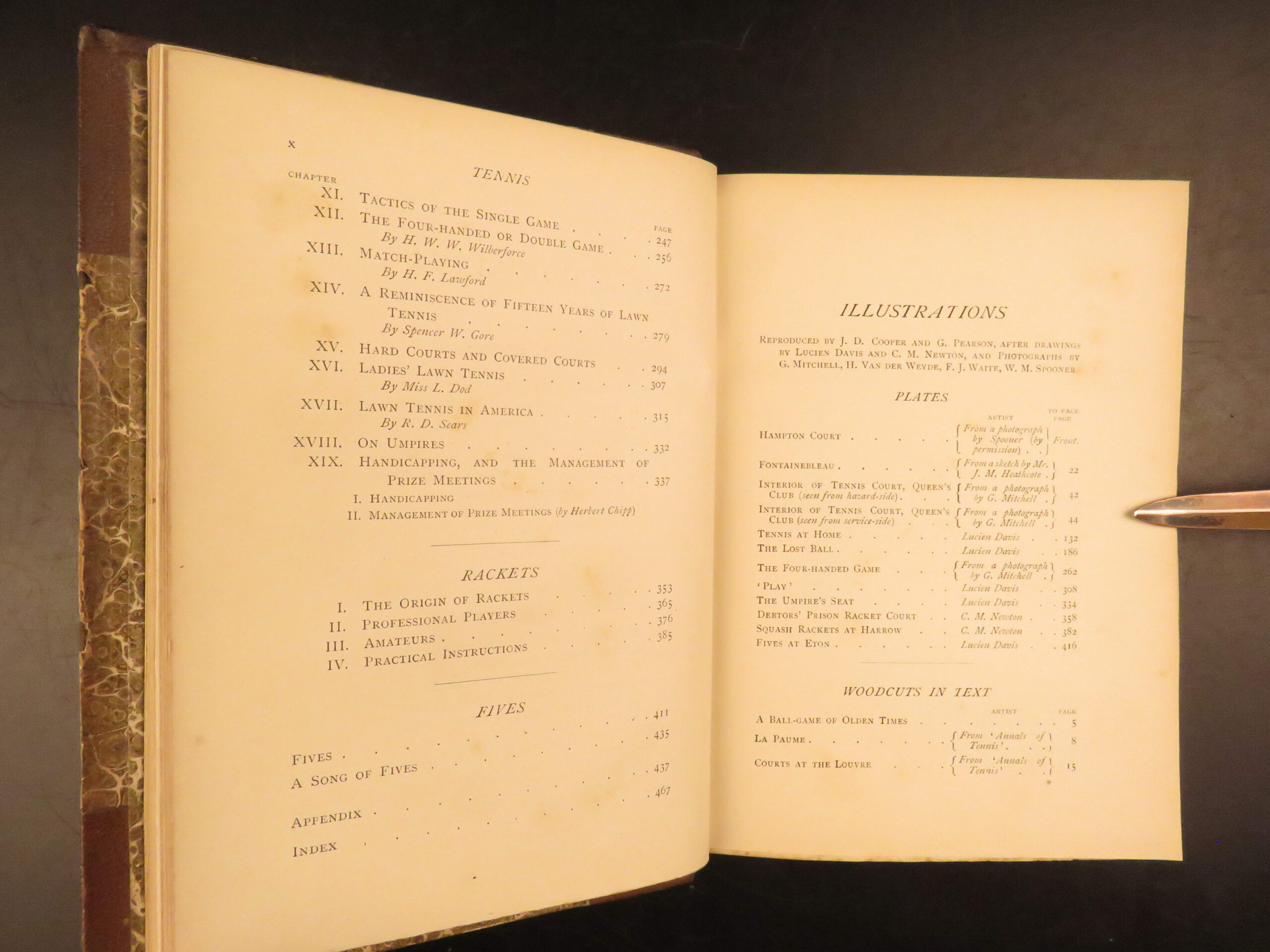 First edition of J. M. Heathcote’s Tennis: Lawn Tennis, Rackets, Fives (1890), a Victorian study of four racquet sports with illustrations and complete rules.