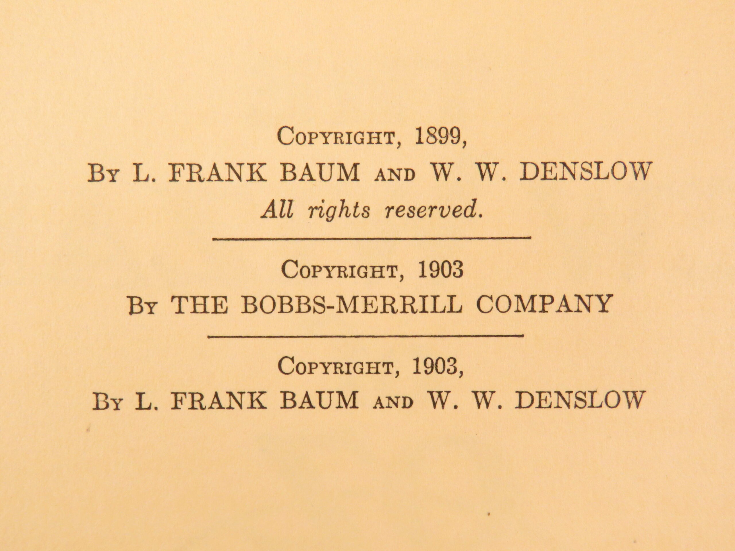 1903 Bobbs-Merrill reissue of The New Wizard of Oz by L. Frank Baum with 15 illustrations by W. W. Denslow, and facsimile dust jacket included.