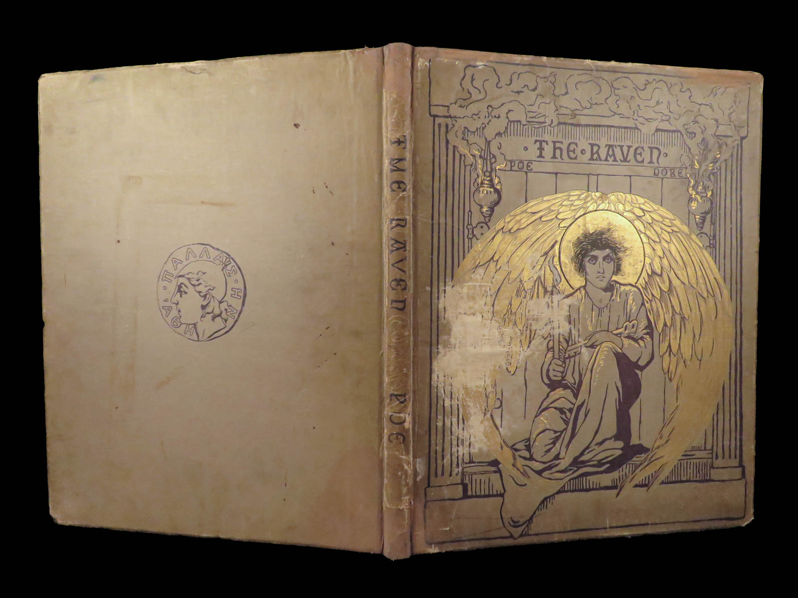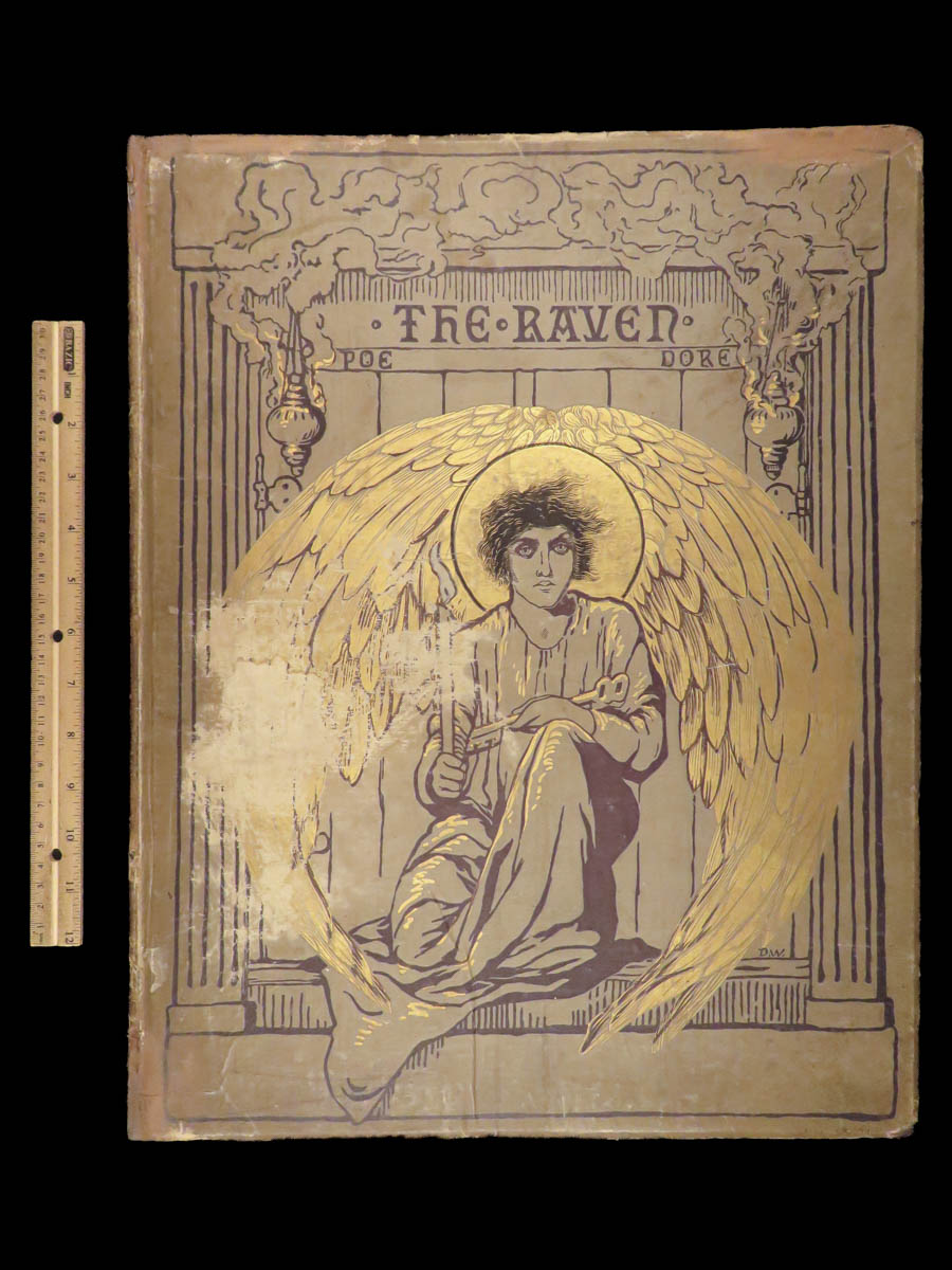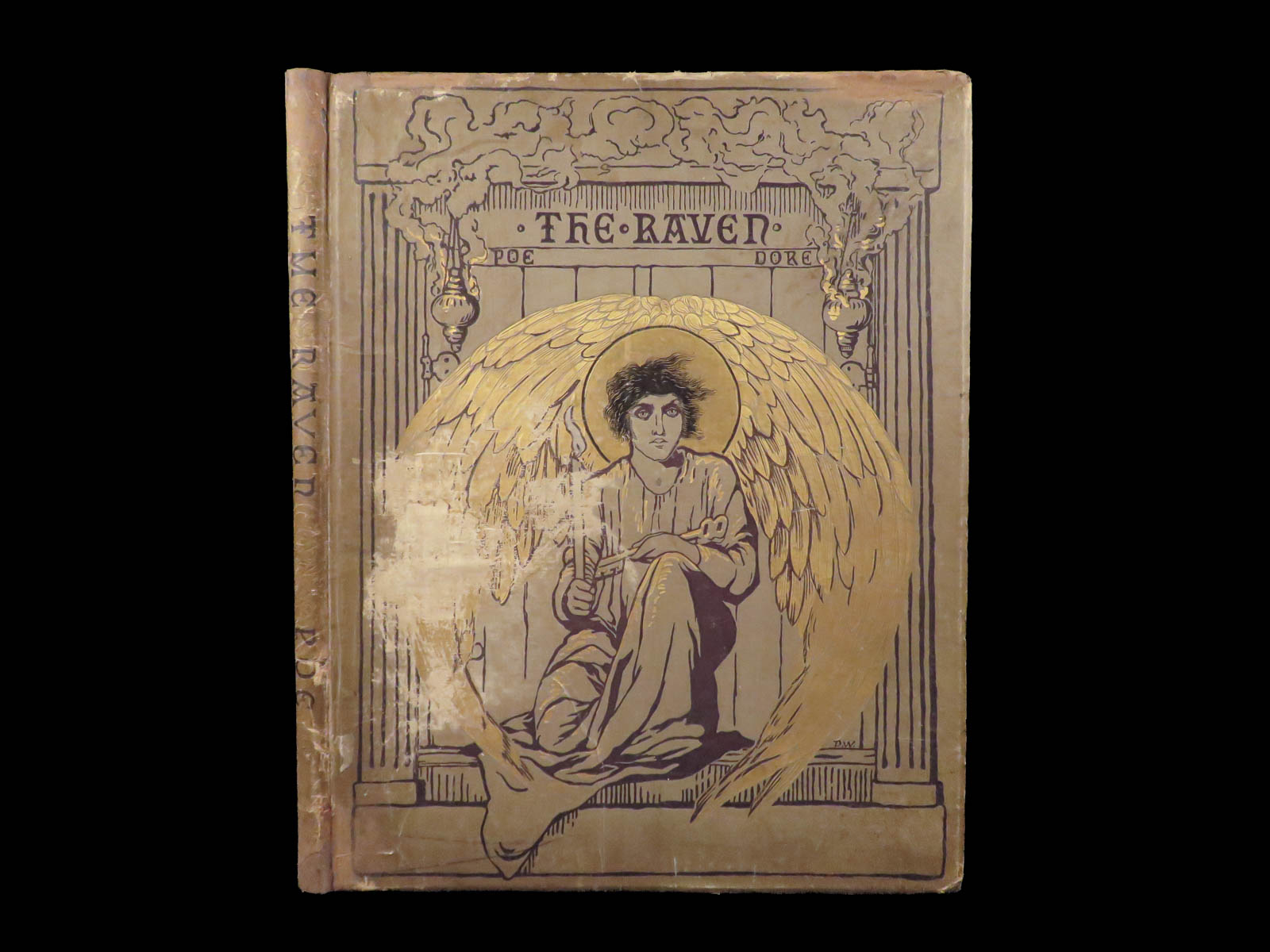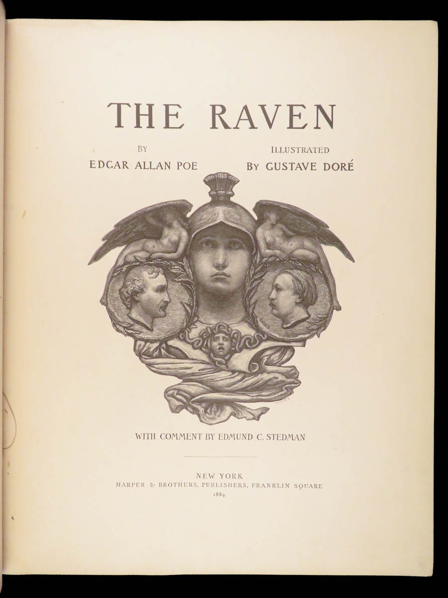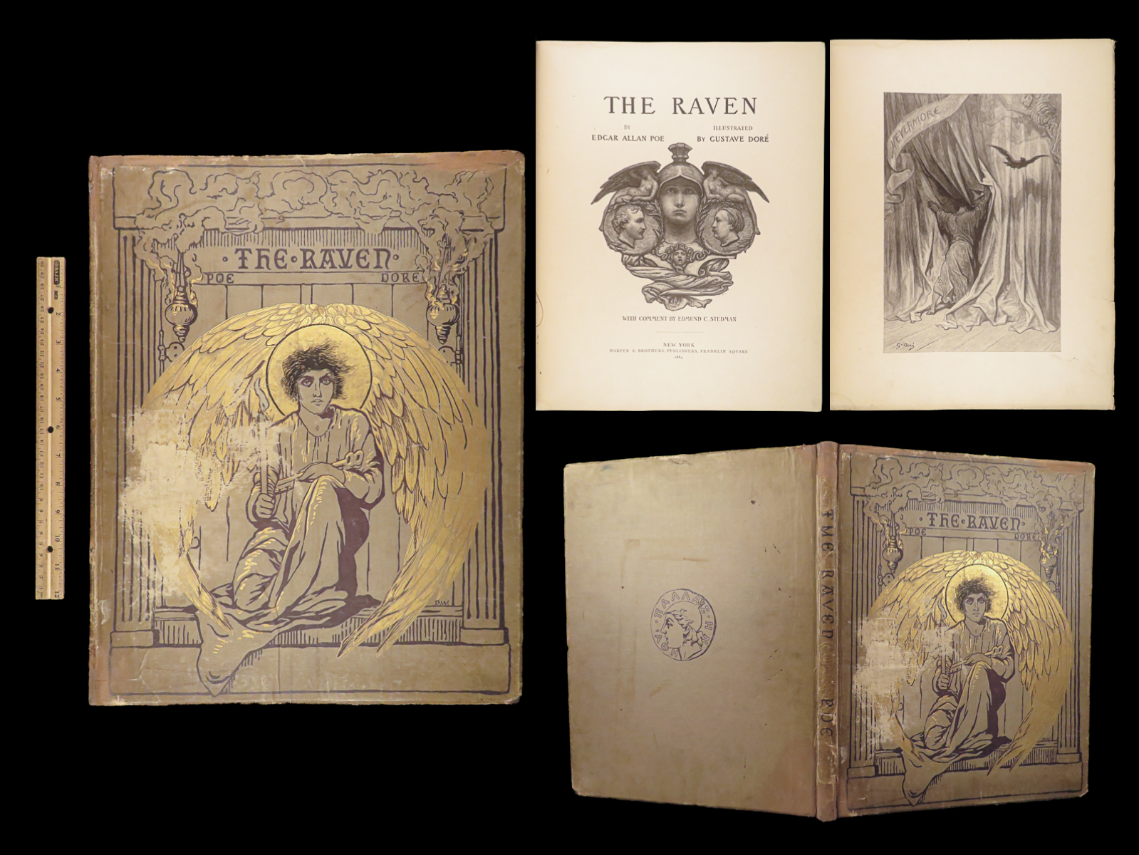 The Raven Poe Dore 1884 edition pairs Poe’s iconic poem with Gustave Doré’s steel engravings in a large Harper folio. First edition with Stedman’s commentary and rare Poe ephemera laid in. A scarce, oversized illustrated classic from the late 19th century.