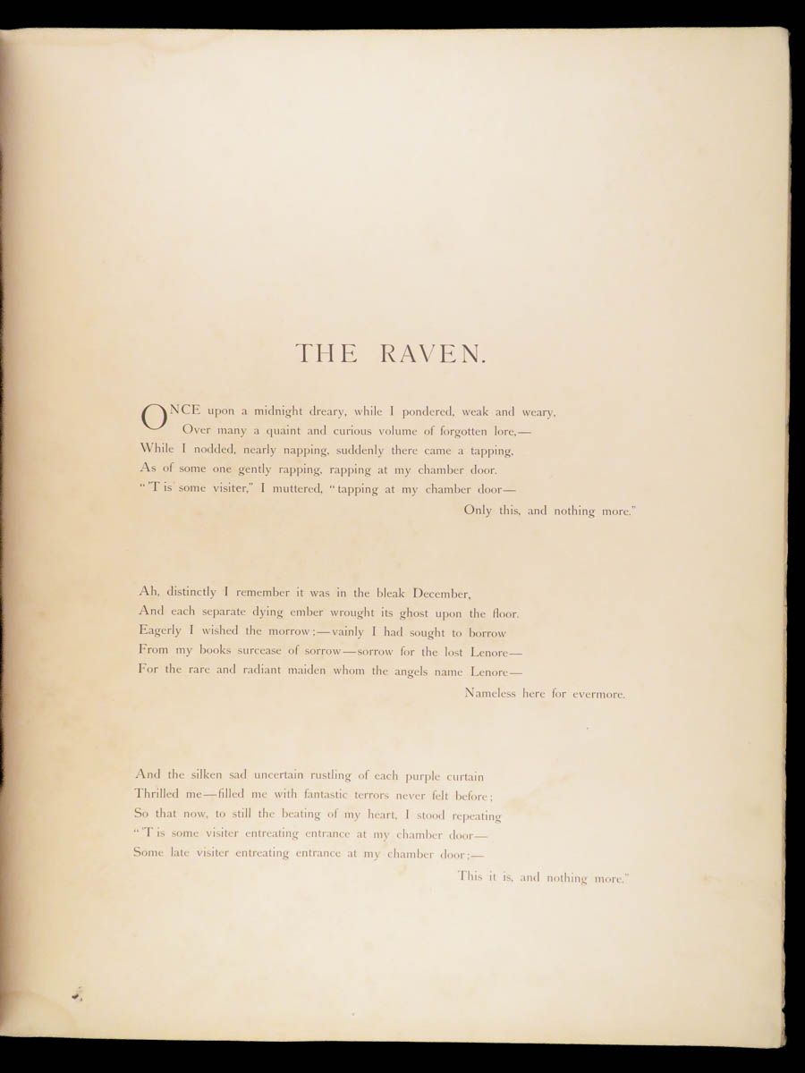 ‘The Raven’ is perhaps Poe’s most famous and well-recognized work, a poem that tells a tale of a raven’s mysterious visit to a distraught lover, tracing the man’s slow fall into madness. The poem makes use of folk, mythological, religious, and classical references.