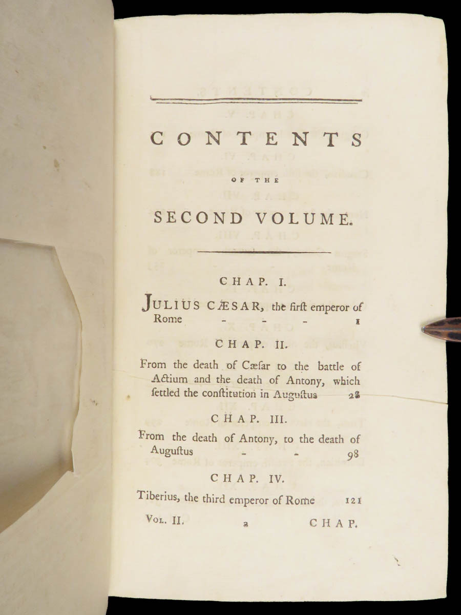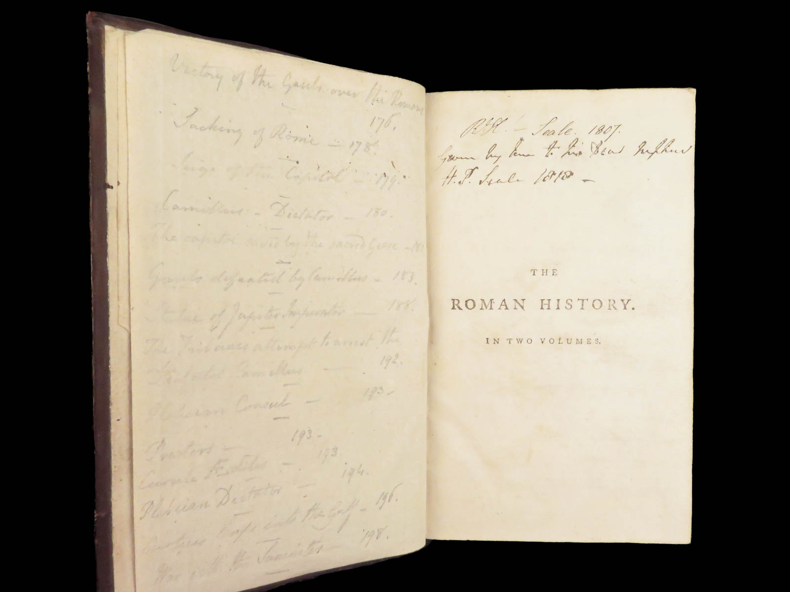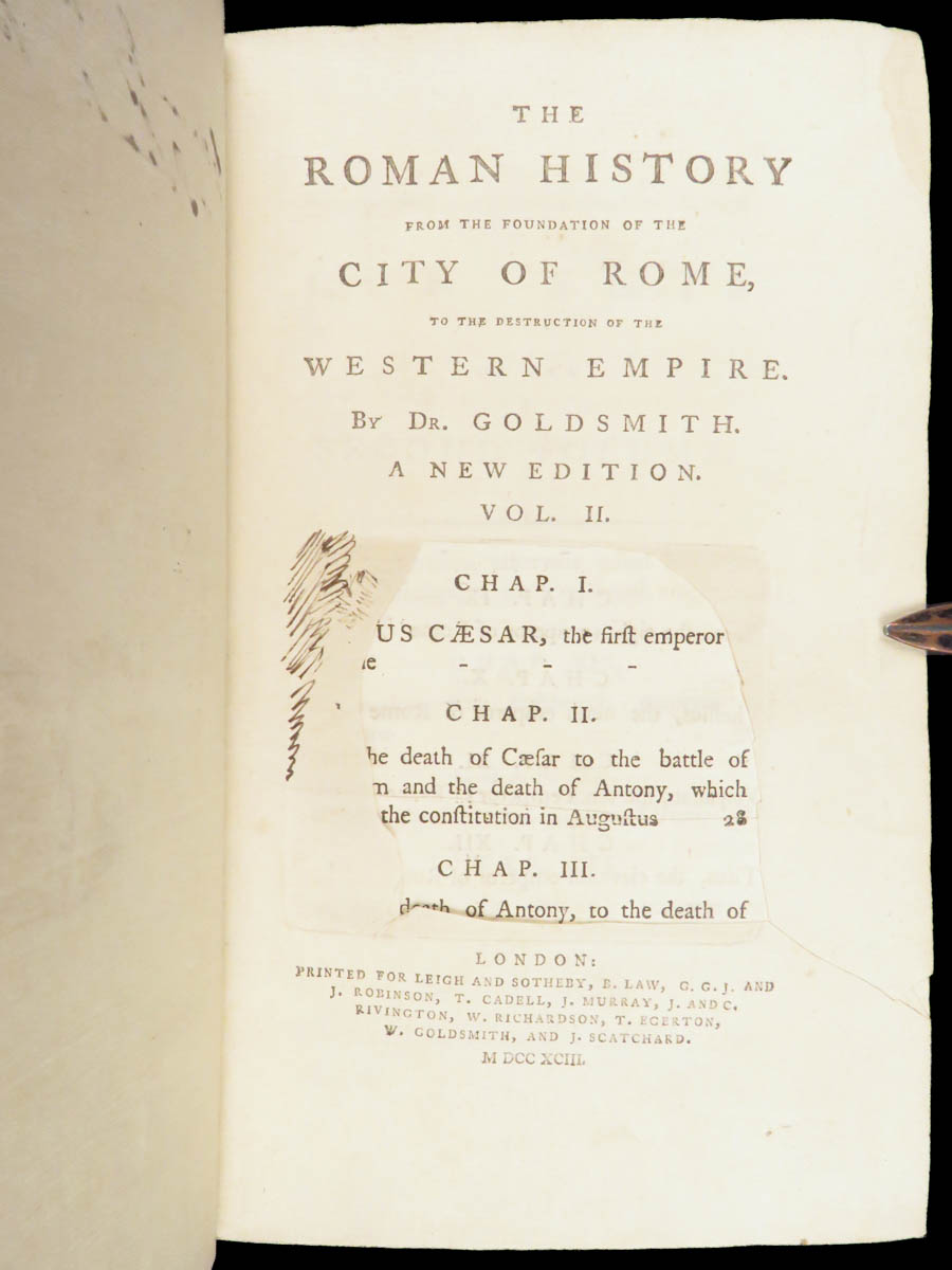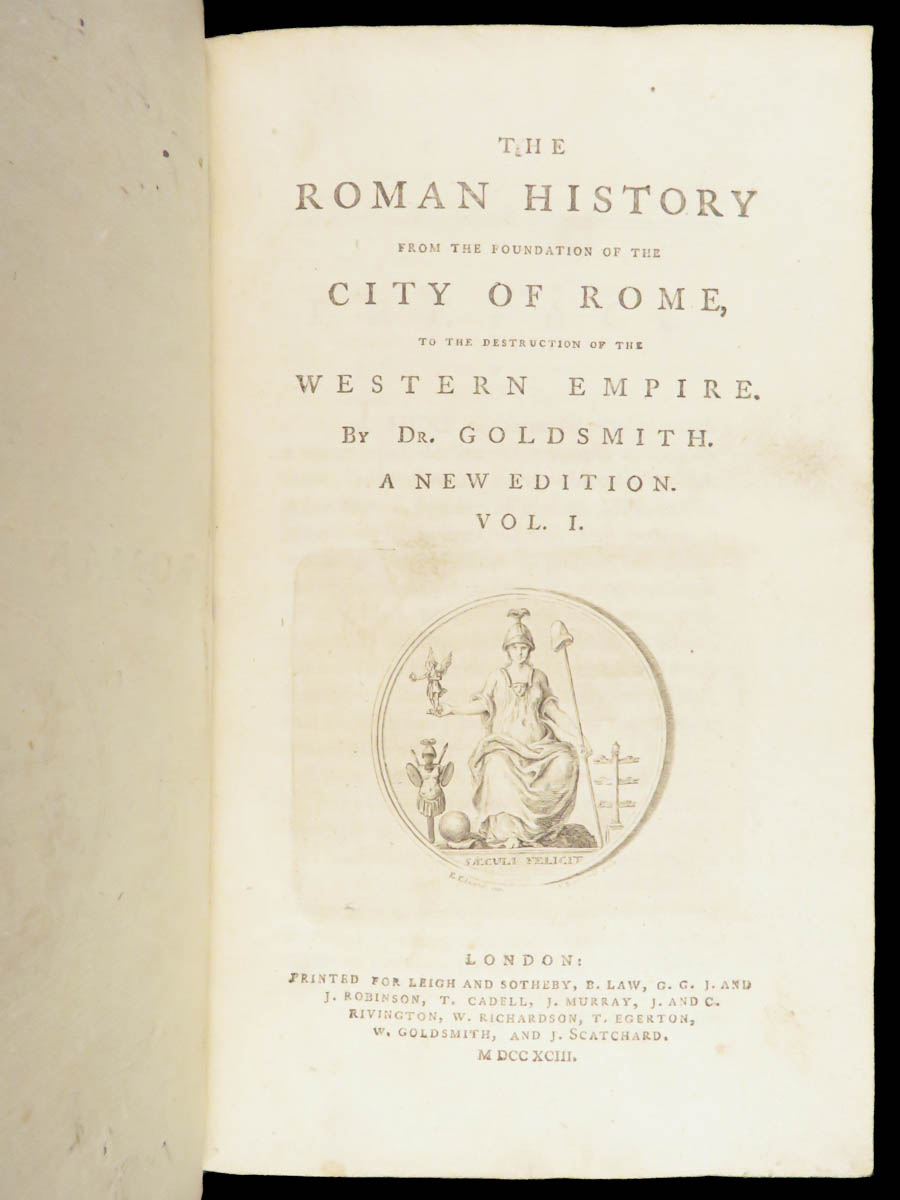 Oliver Goldsmith’s poetry was popular throughout the 19th- and early 20th-centuries. One of his lesser-known historical works was The Roman History, a historical treatise on the foundation of Rome and its rise to world power. Like many other histories of Rome, Goldsmith’s covers the lives and reigns of Julius Caesar, Augustus Caesar, Tiberius, Marc Antony, and Constantine.