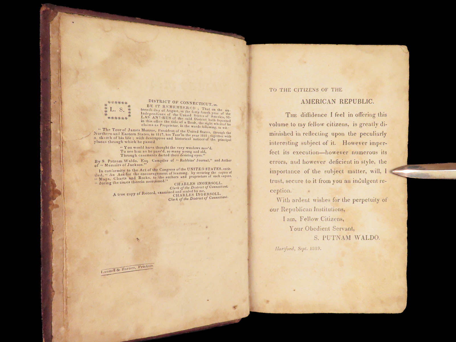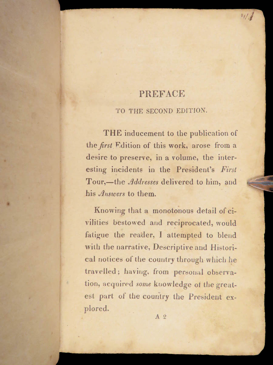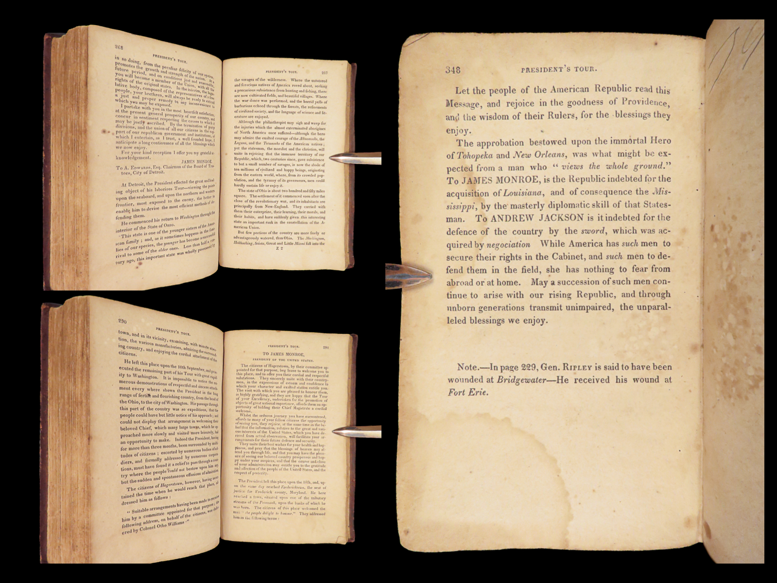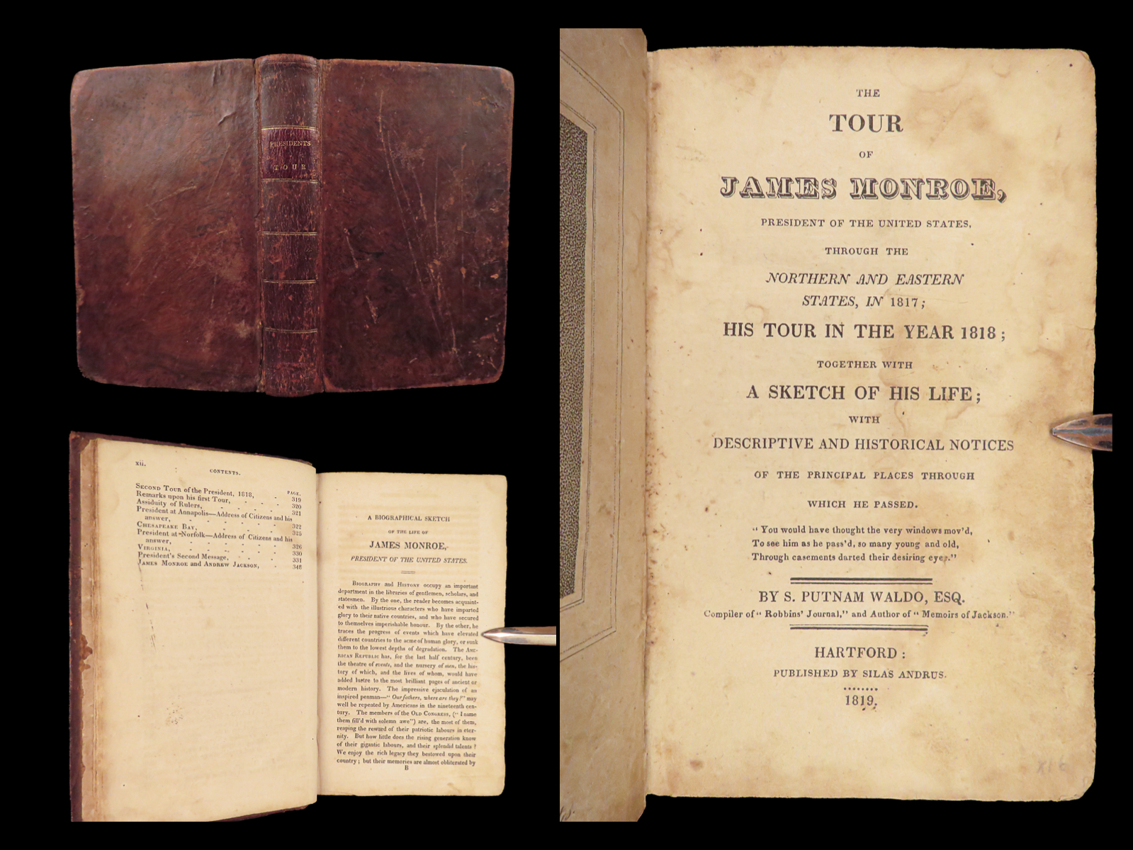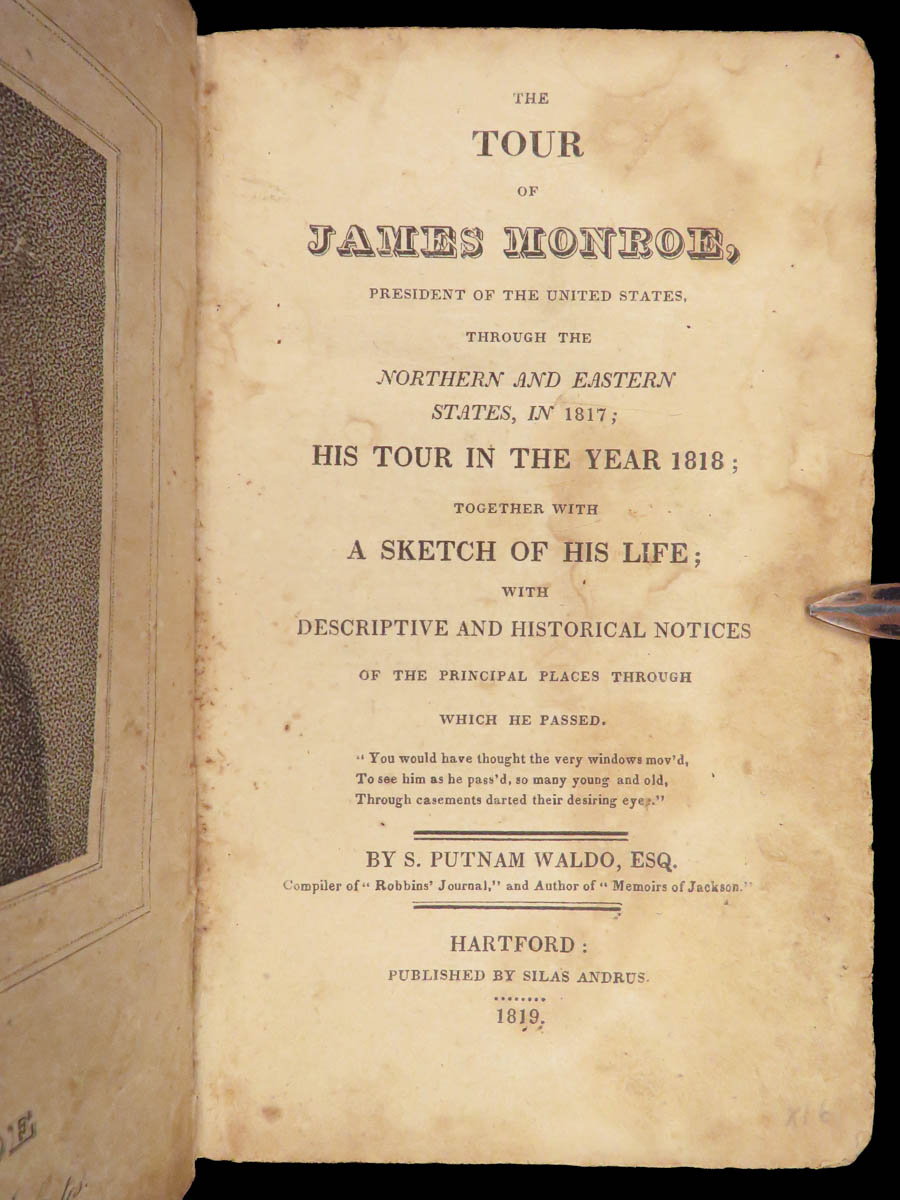 Samuel Waldo’s The Tour of James Monroe, President of the United States, in the Year 1817 (Hartford: Silas Andrus, 1819) recounts Monroe’s journey through the northern states during the early Era of Good Feelings.