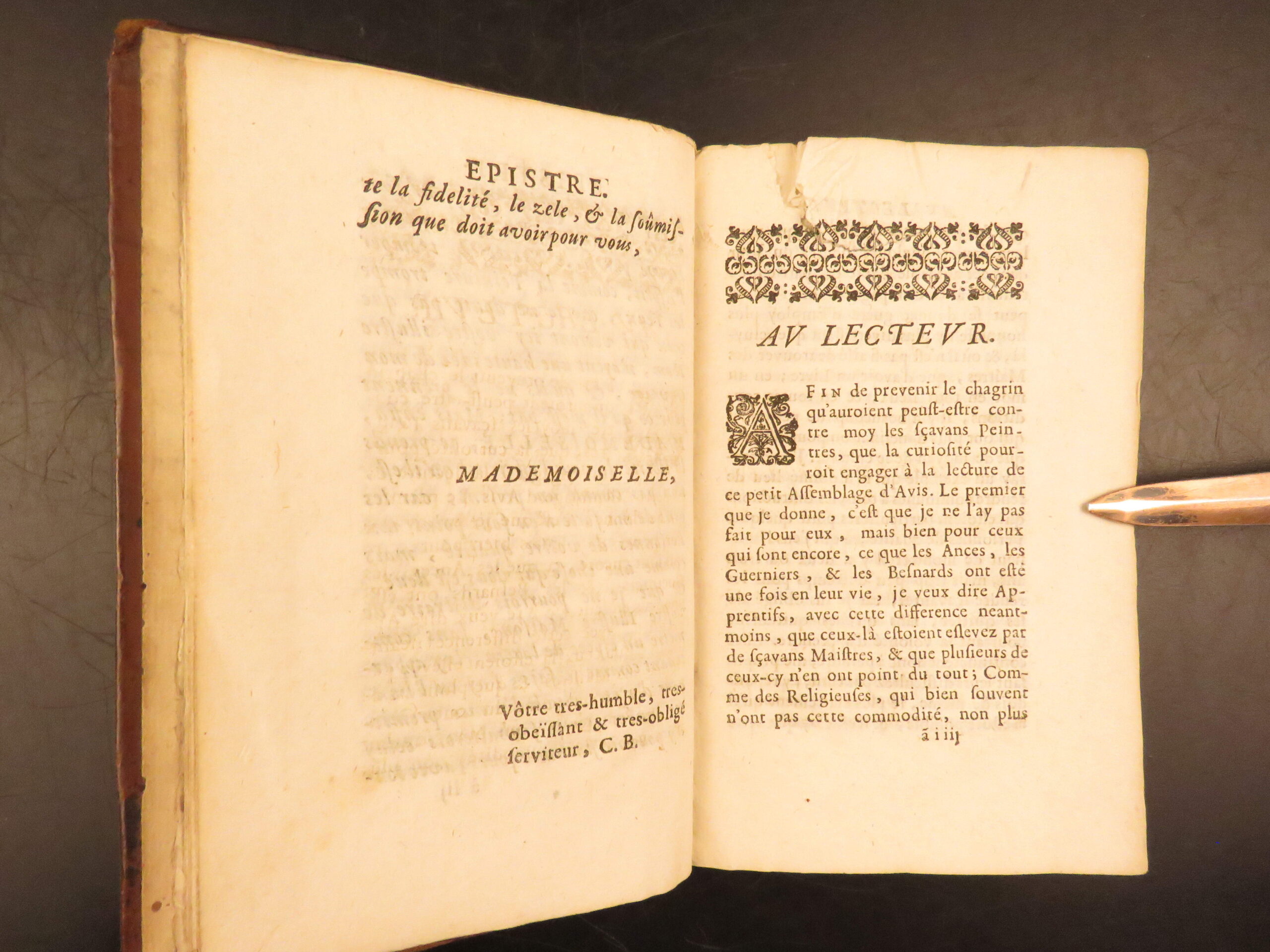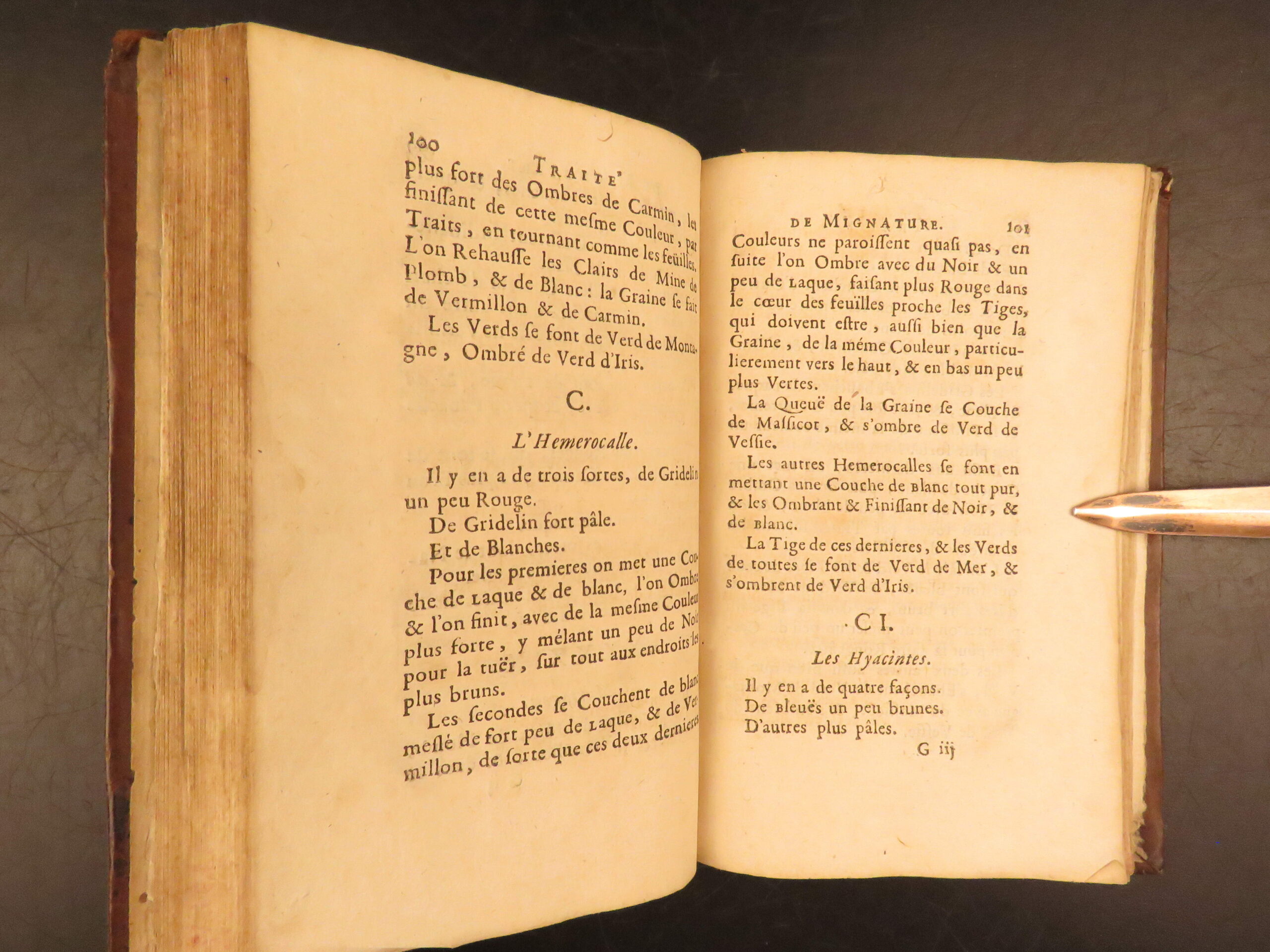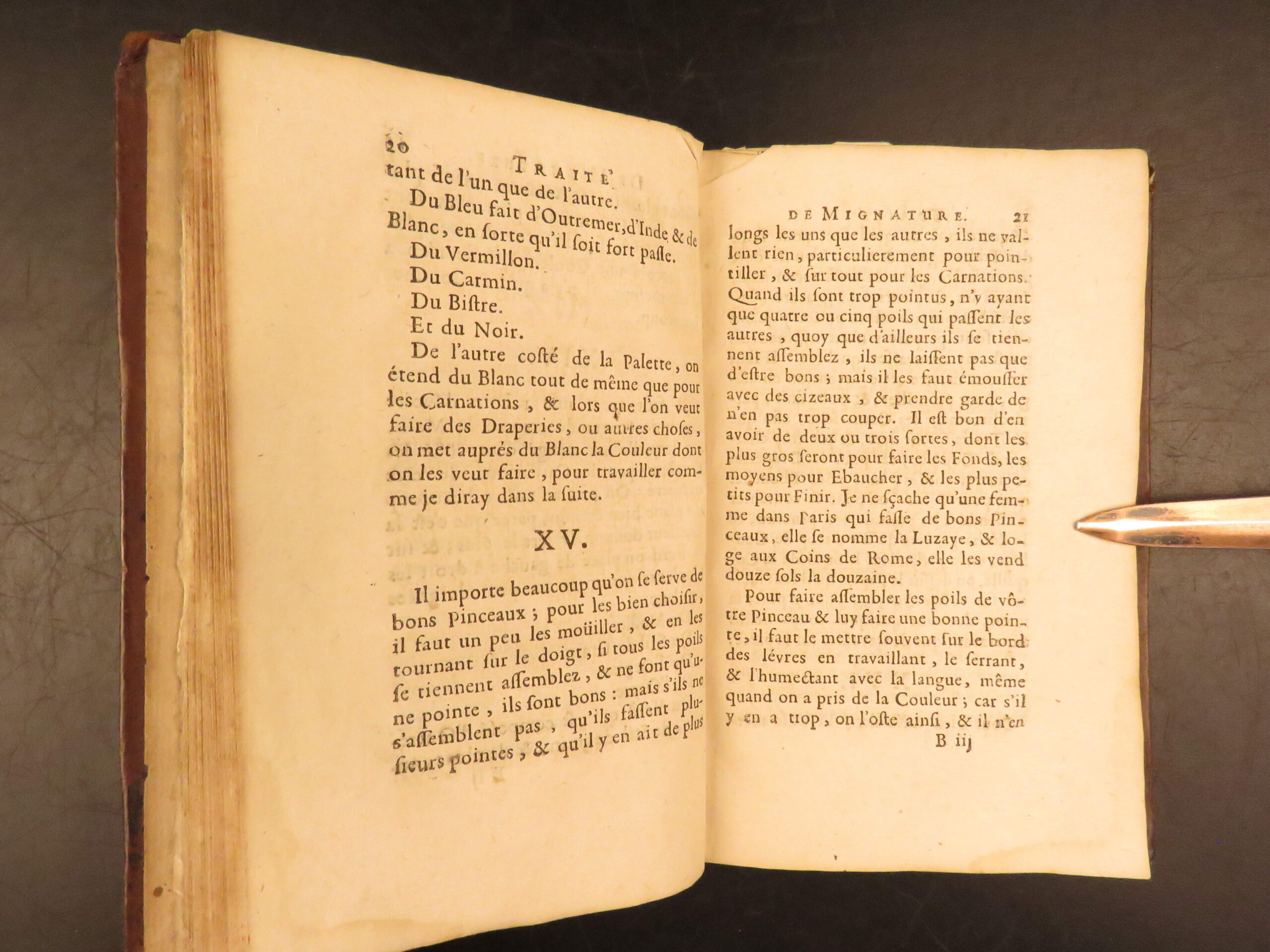 Claude Boutet’s Traité de Mignature is a rare French manual on miniature painting. Written for amateur painters without teachers, this book outlines practical methods used in 17th-century paint shops. It addresses color-making and surface preparation (surfaces such as vellum, parchment, and even ivory) and techniques on how to paint certain difficult objects like the sun. It also contains brush-stroke patterns and instruction on fine-scale production.