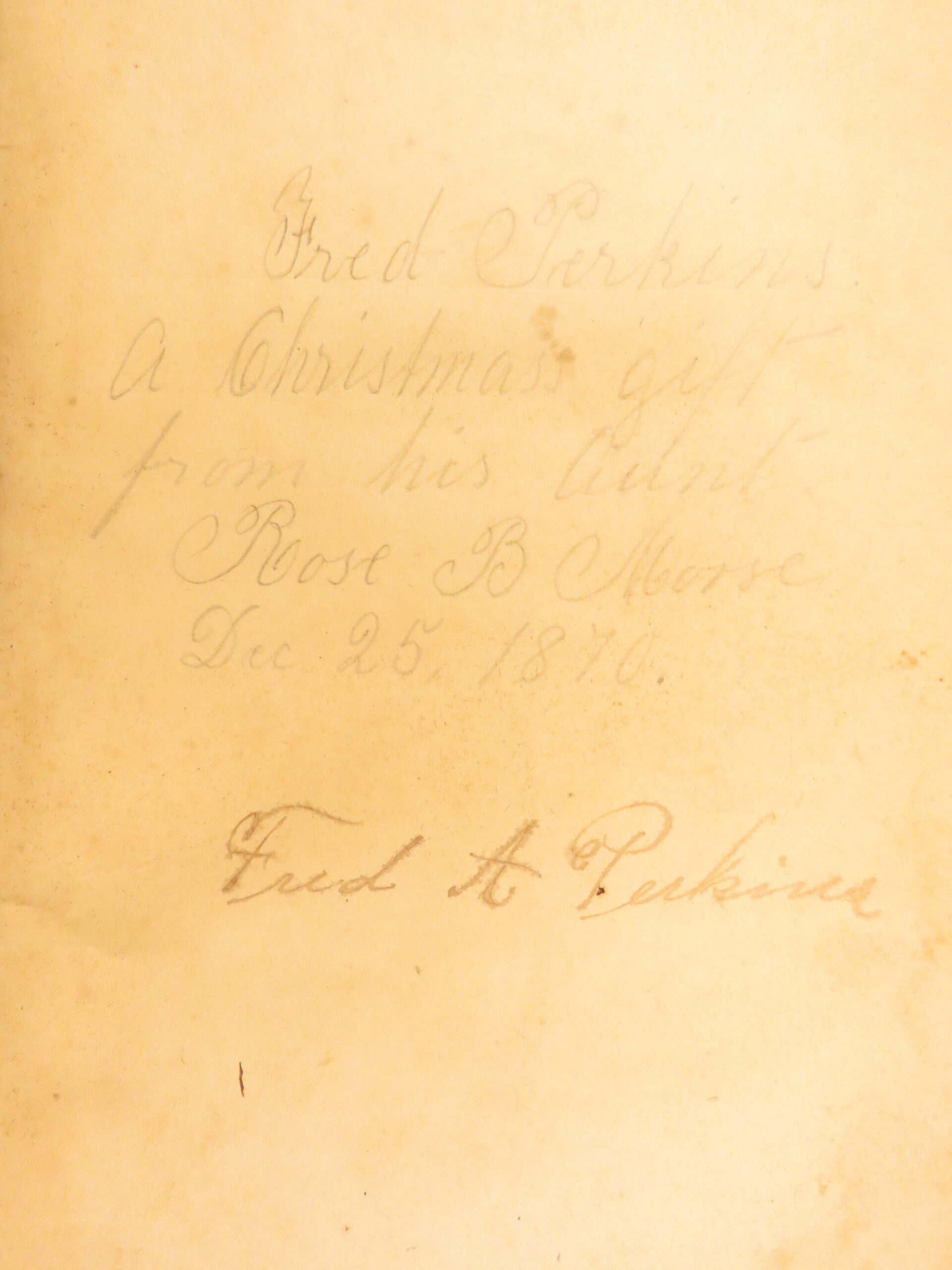- Provenance: Handwritten inscription to Fred A. Perkins; “a Christmas gift from his aunt Rose B. Morse, Dec. 25, 1870”