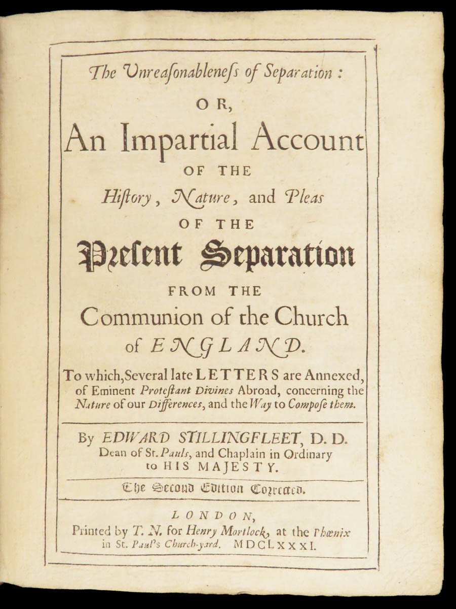 1681 second edition of Edward Stillingfleet’s controversial anti-separatist tract The Unreasonableness of Separation, printed in London and complete with European Protestant correspondence.
