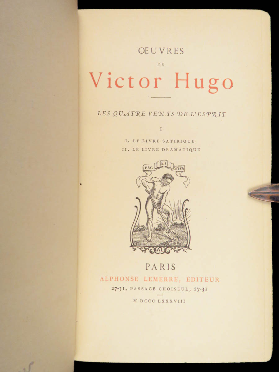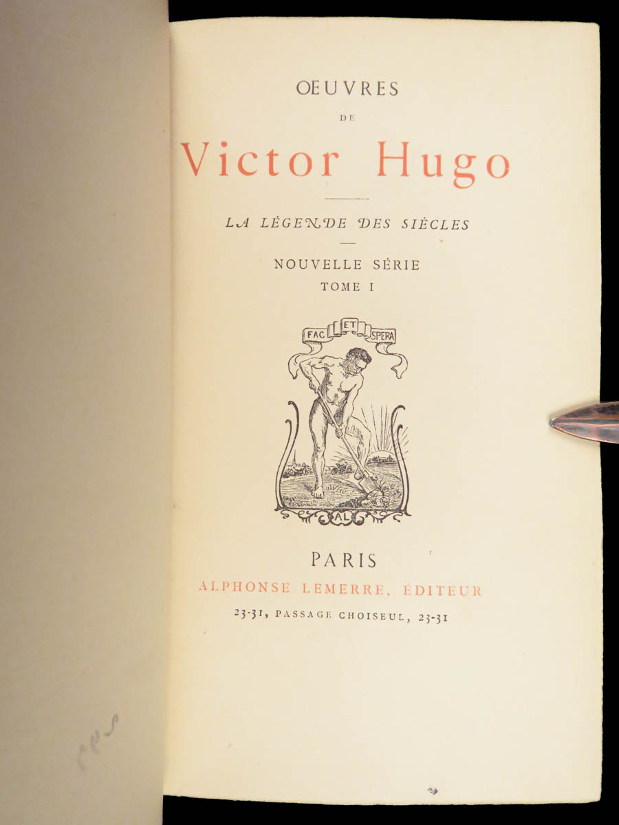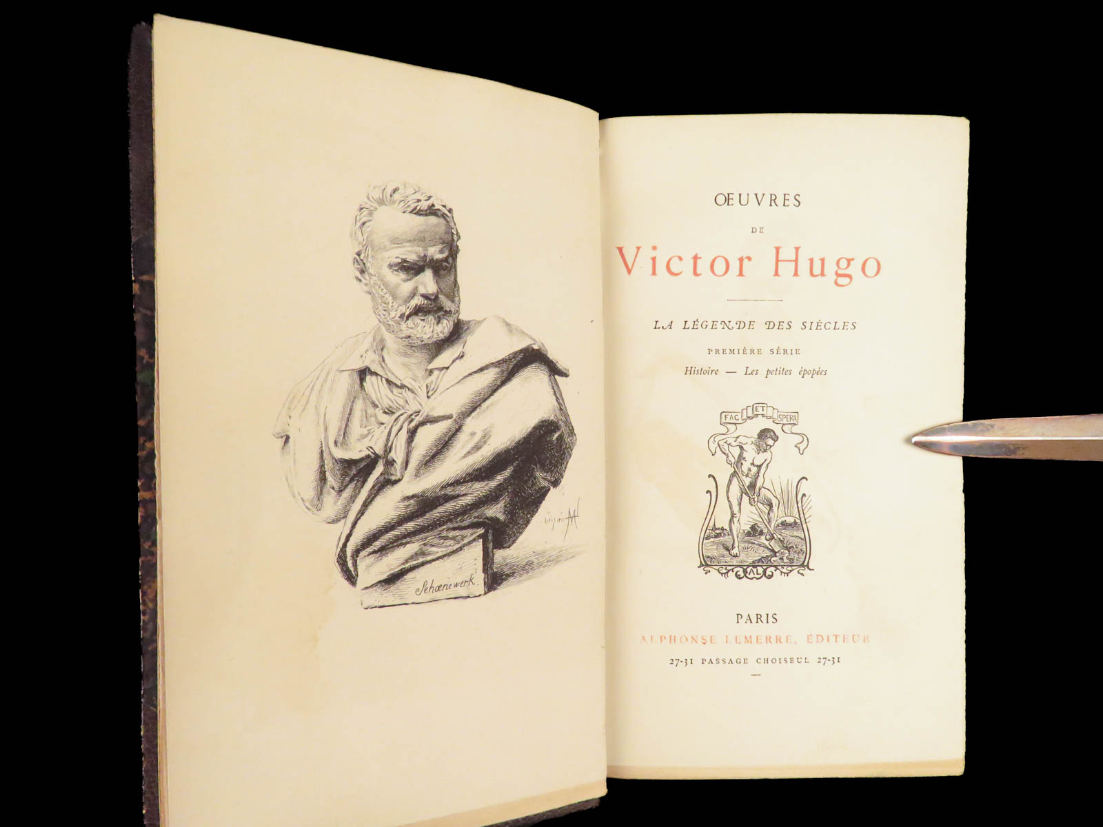 This set of Oeuvres de Victor Hugo presents the poetic works of the famous author in their original French. While best known for his dramatic novels Les Misérables and The Hunchback of Notre Dame, Hugo also extensively wrote poetry that encapsulated the tenants of the Romantic era of literature, with themes of idealizing the past and emphasizing individualism, particularly through the originality of artists. Much of his poetry was political in nature, and several of his collections, including Les Contemplations and La Legend des Siècles, were composed while Hugo was in political exile after publicly calling Napoleon III a traitor to France. These works, as well as several other poetry collections such as Le Pape, La Pitié Suprême, and L’Art d’être Grand-père, are included in this sixteen-volume set of the author’s poetry, published in Paris by Alphonse Lamerre.