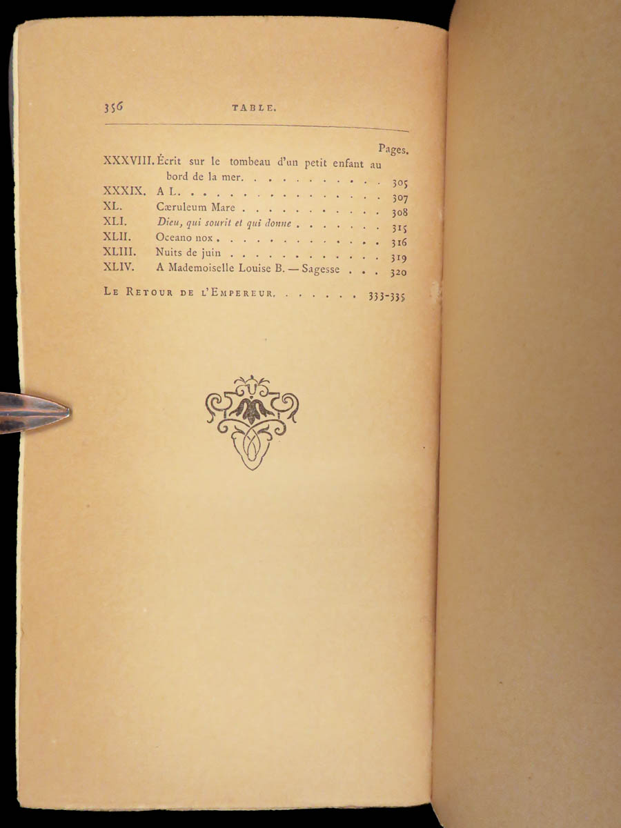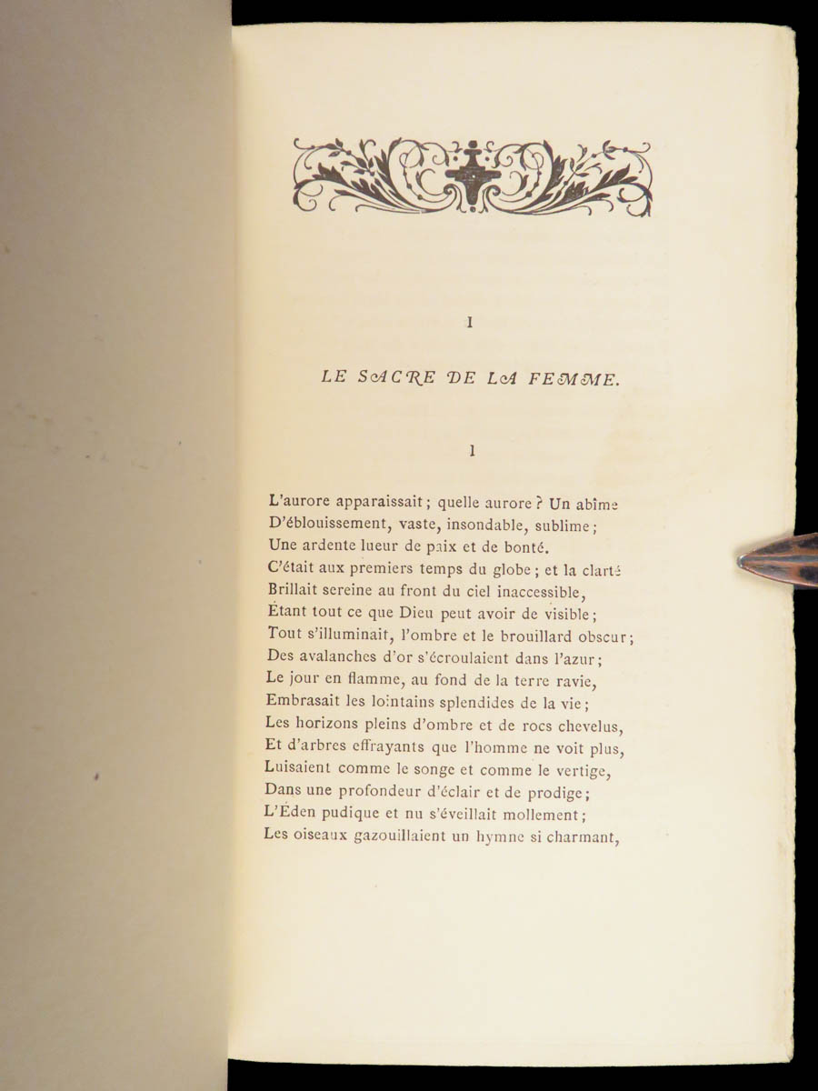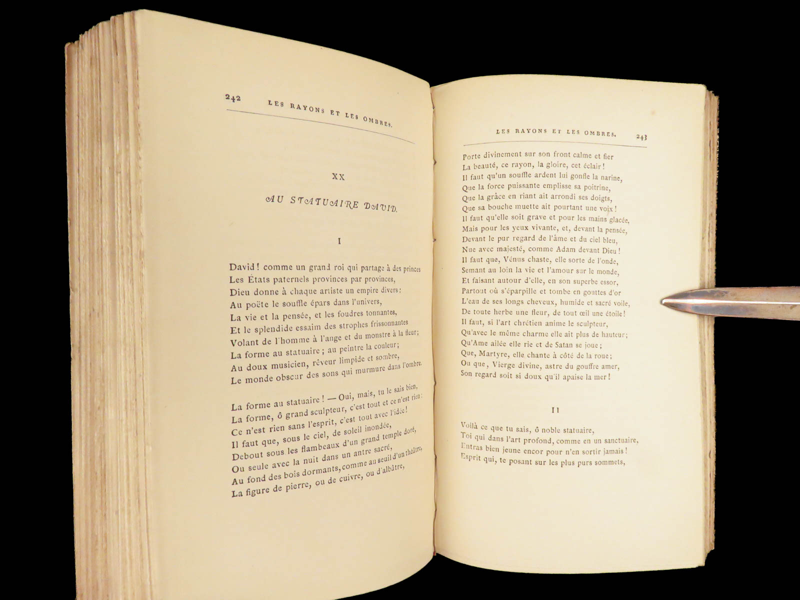 This set of Oeuvres de Victor Hugo presents the poetic works of the famous author in their original French. While best known for his dramatic novels Les Misérables and The Hunchback of Notre Dame, Hugo also extensively wrote poetry that encapsulated the tenants of the Romantic era of literature, with themes of idealizing the past and emphasizing individualism, particularly through the originality of artists. Much of his poetry was political in nature, and several of his collections, including Les Contemplations and La Legend des Siècles, were composed while Hugo was in political exile after publicly calling Napoleon III a traitor to France. These works, as well as several other poetry collections such as Le Pape, La Pitié Suprême, and L’Art d’être Grand-père, are included in this sixteen-volume set of the author’s poetry, published in Paris by Alphonse Lamerre.