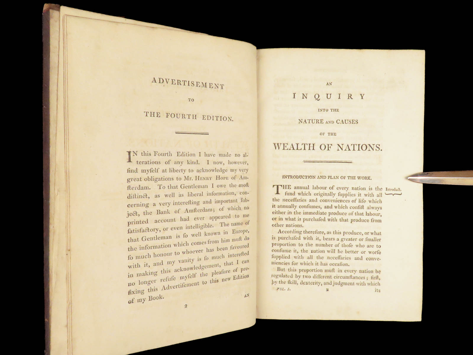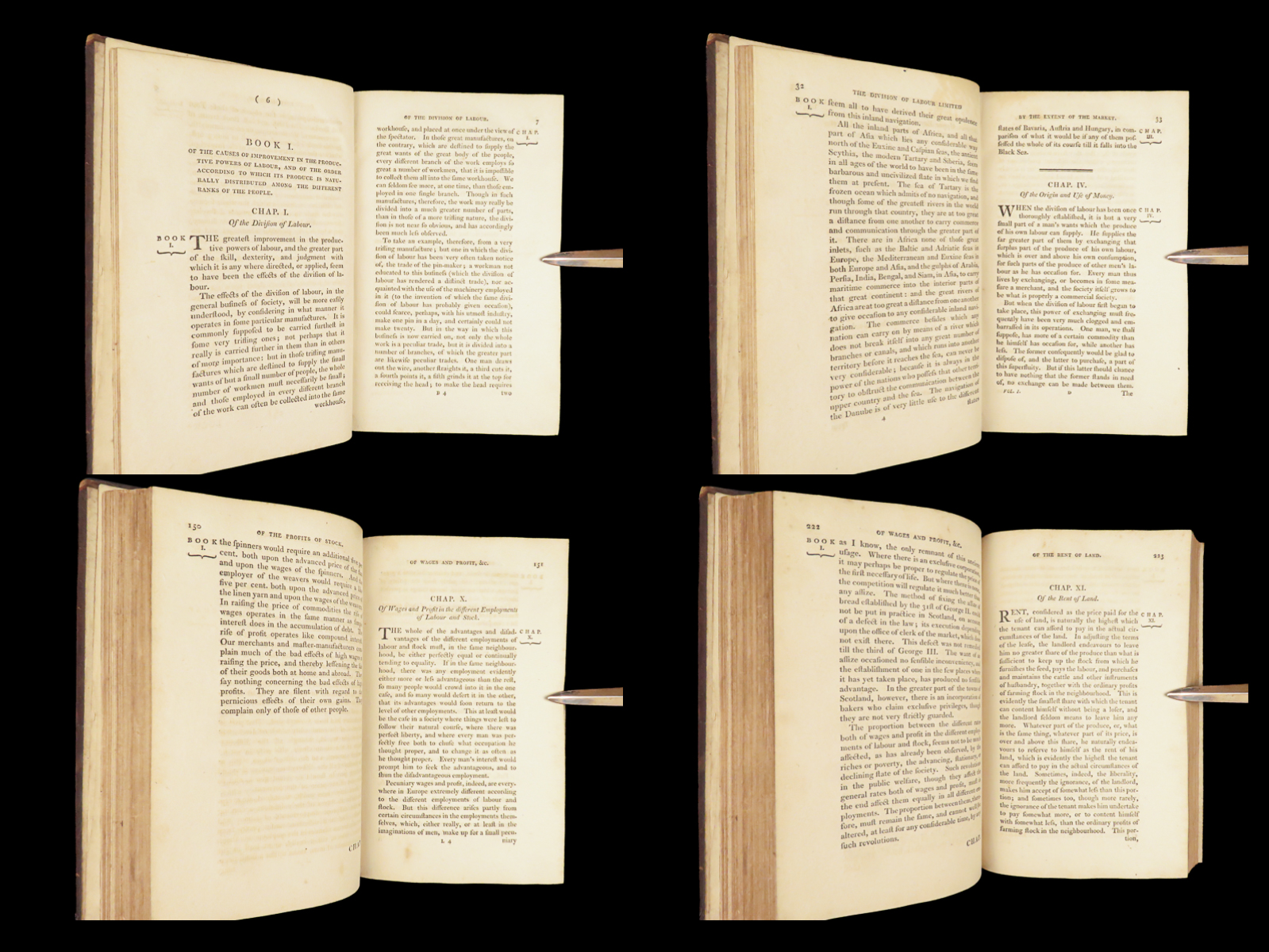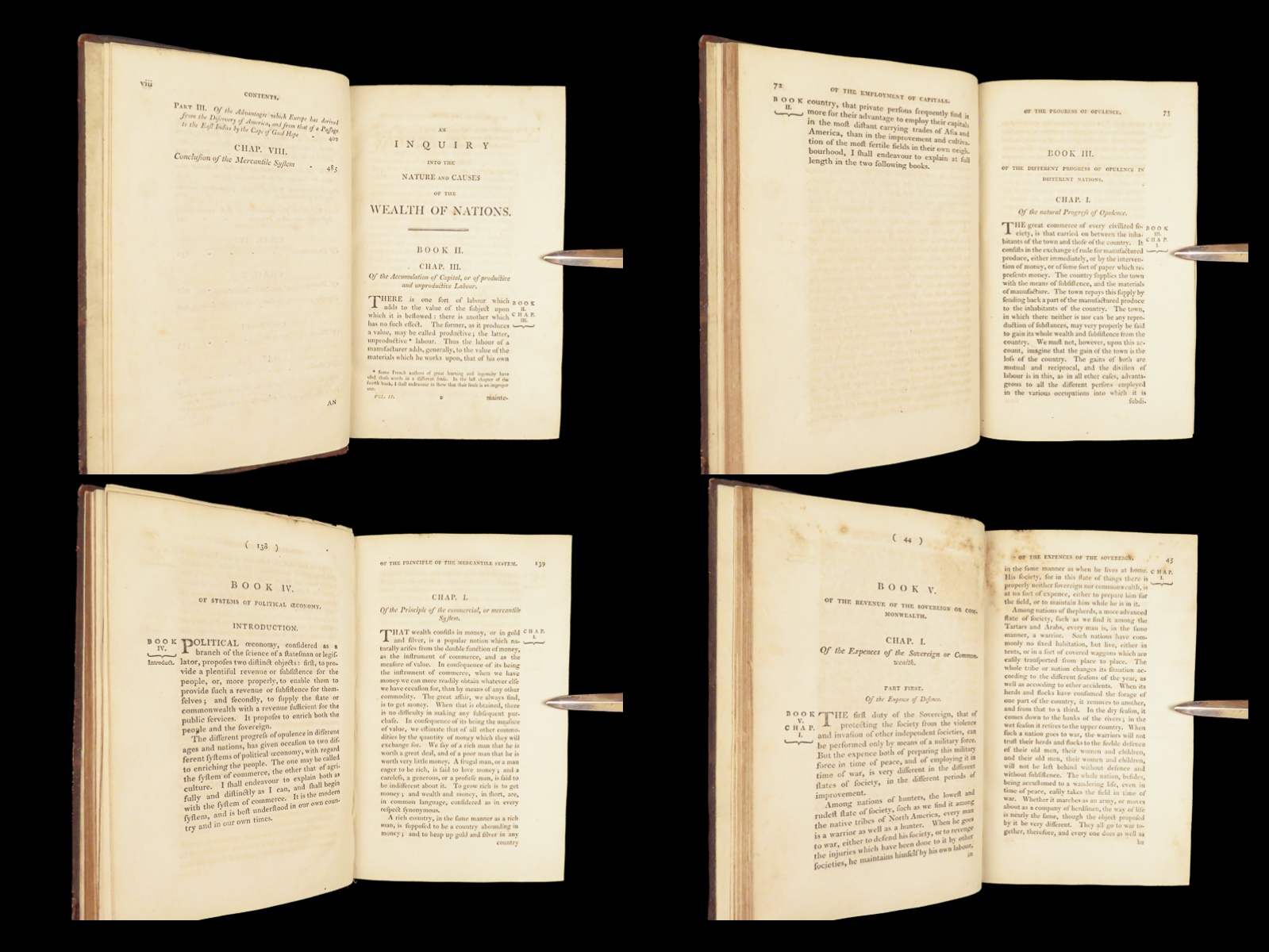 A rare, early 1812 edition of the famous Wealth of Nations by Adam Smith. Wealth of Nations was one of the world’s first collected descriptions of what builds a nations’ economy, wealth, and capitalism. Smith begins this landmark work by stating that the source of a nation’s wealth comes from the labor of the people. Throughout the rest of the work, Smith shows how productivity and financial exchanges are the root of a working economy.