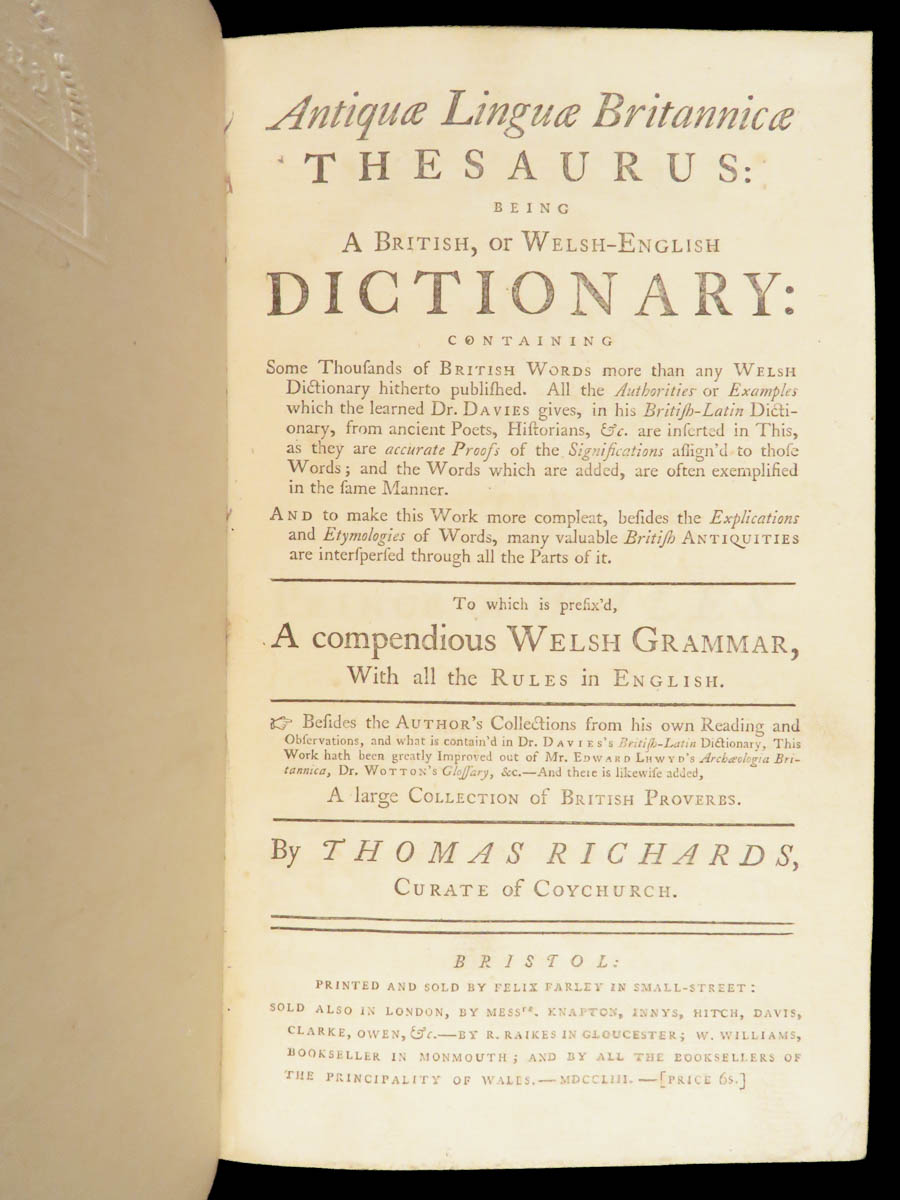 First edition of Thomas Richards’s 1753 Welsh-English dictionary, complete with grammar and a large selection of Welsh proverbs, an important contribution to 18th-century language study.