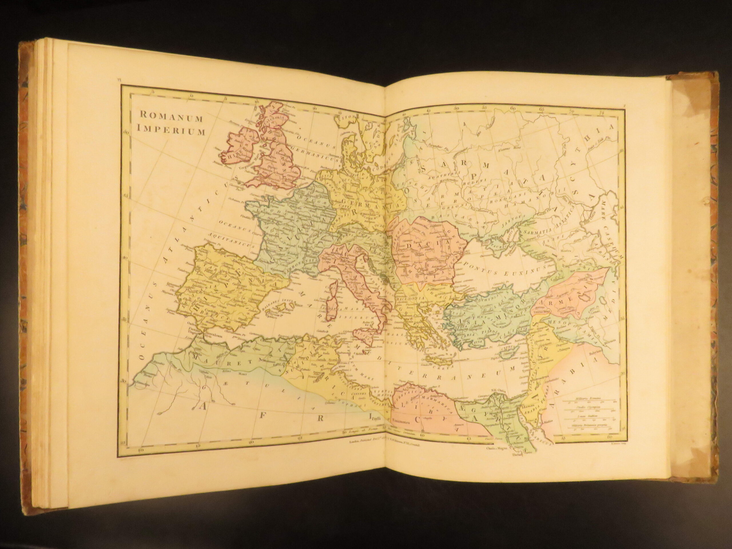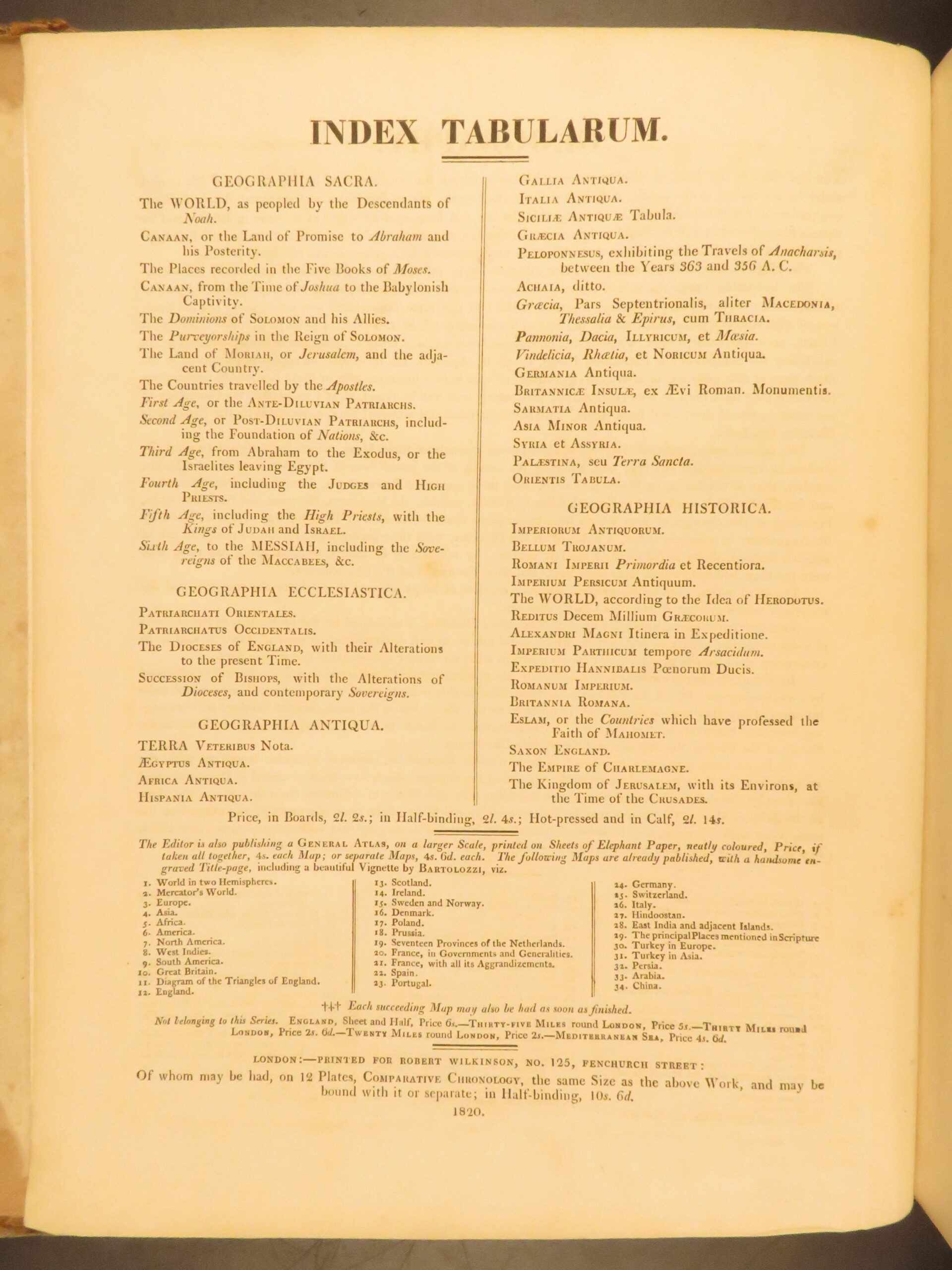 Robert Wilkinson’s Atlas Classica (London, 1820) includes 46 hand-colored maps showing historical regions such as Ancient Greece, Egypt, Britain, and the Holy Land.