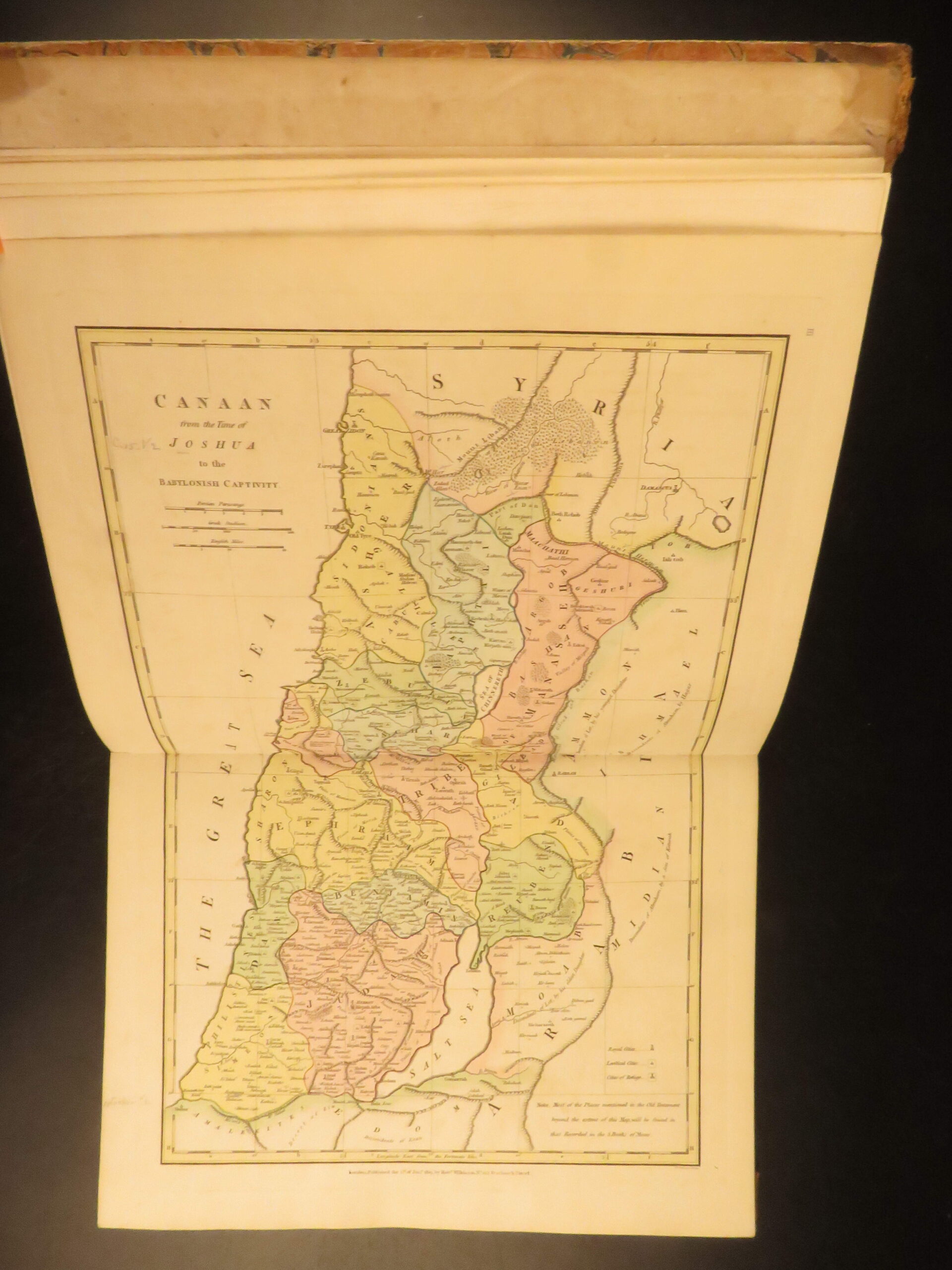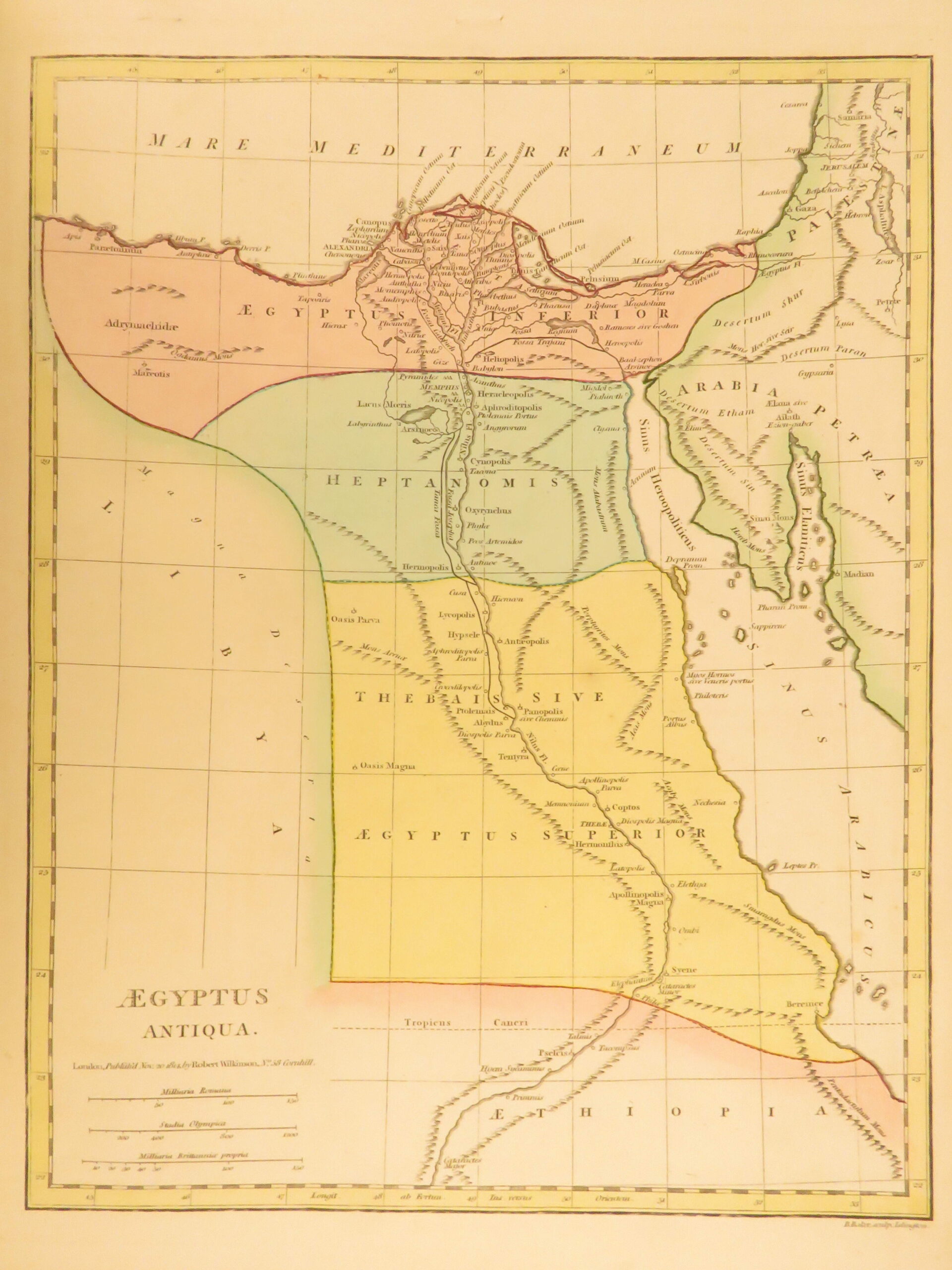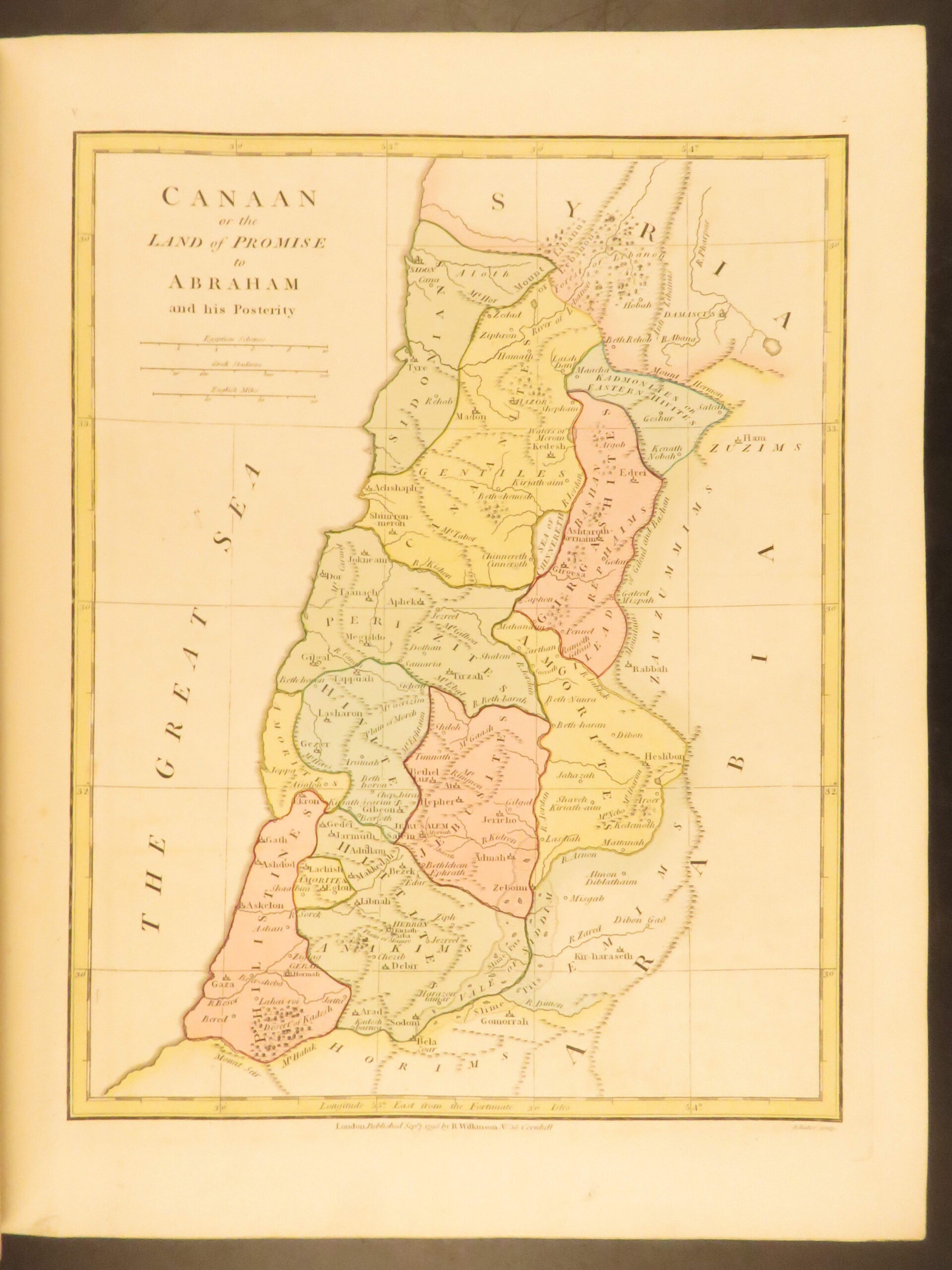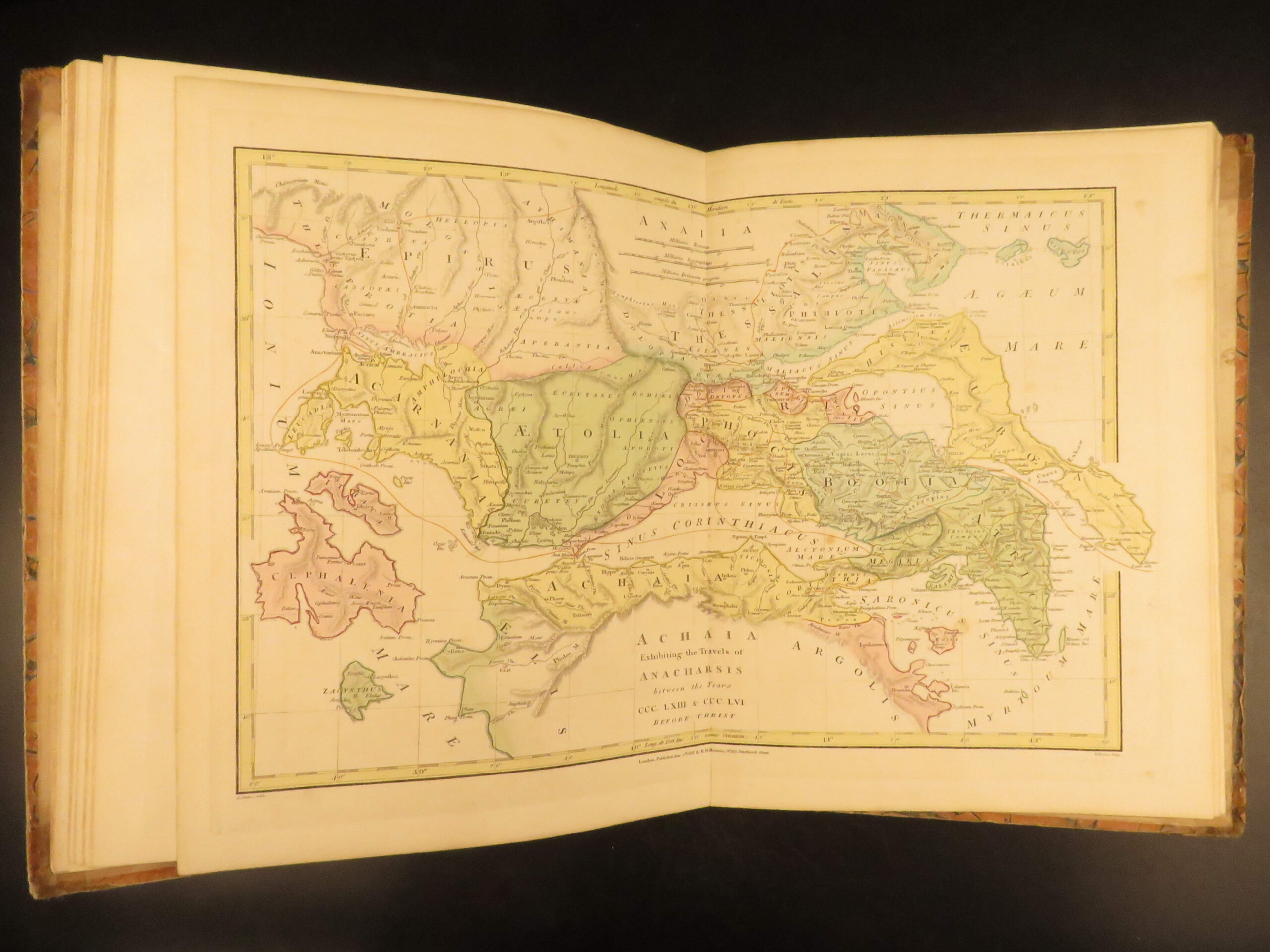 Atlas Classica by Robert Wilkinson is a folio-sized atlas published in London 1820. It includes 46 engraved maps, each beautifully hand-colored. This collection of maps includes views of Ancient Egypt, Greece, and Britain, as well as a map of the travels of Anacharsis. It also contains numerous maps of the Holy Land as it was at different points throughout the Bible.