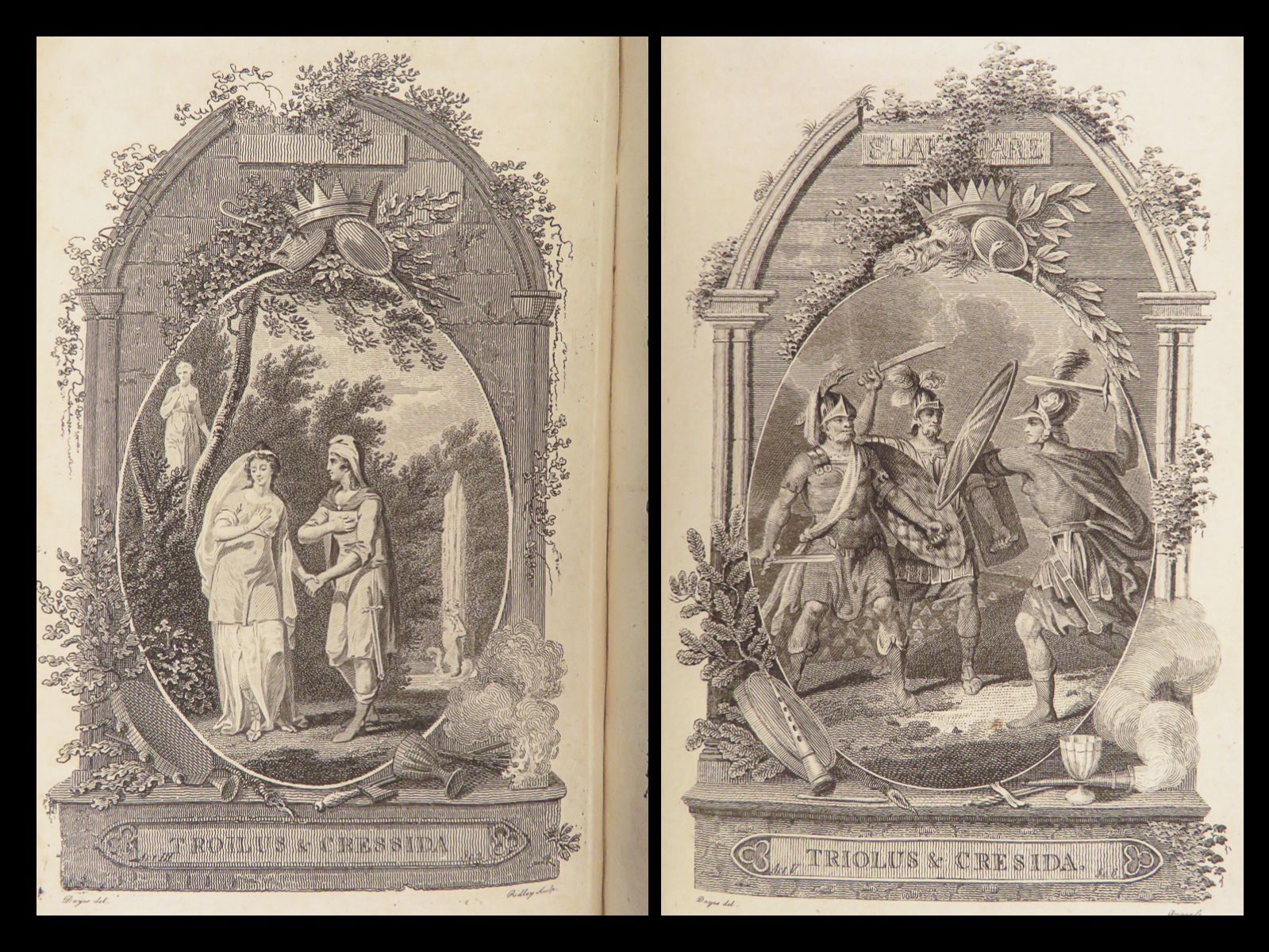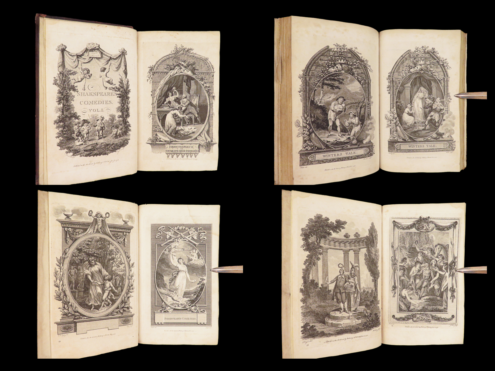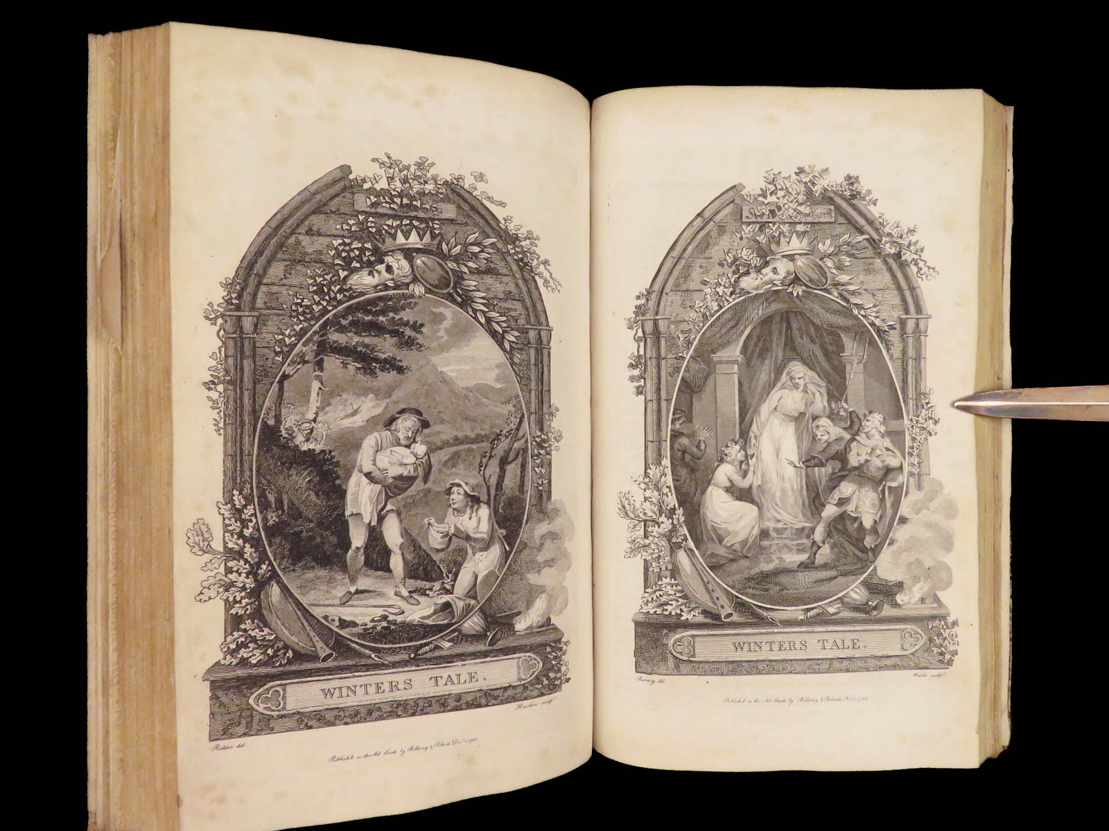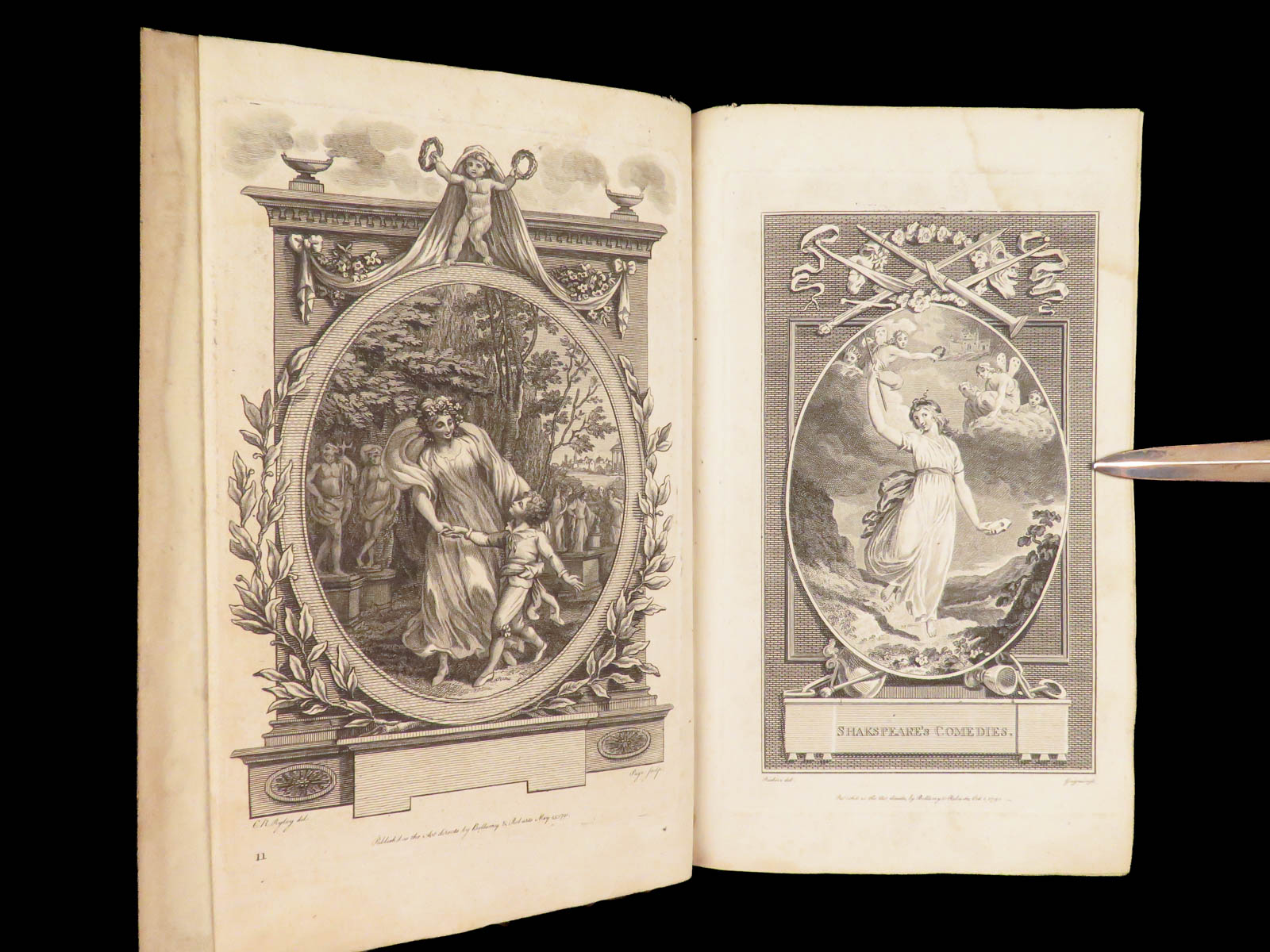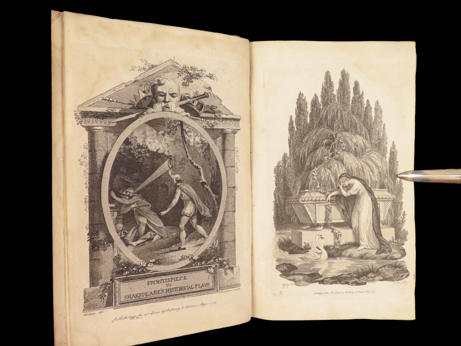 The Plays of William Shakspeare published in 1796 in London was an impressive and highly collectable set of the complete plays of Shakespeare. This set featured numerous allegorical engravings as well as illustrations depicting scenes from the plays themselves.