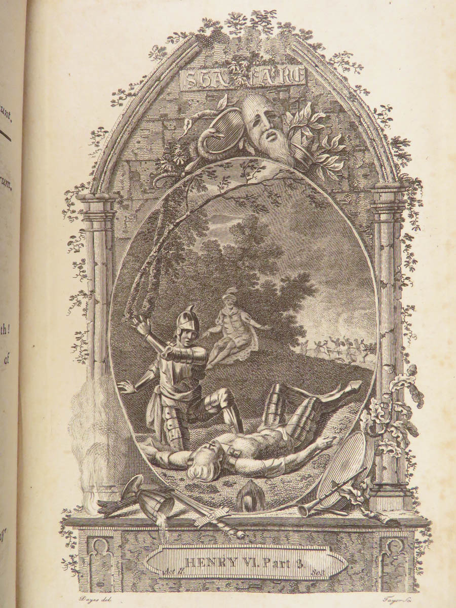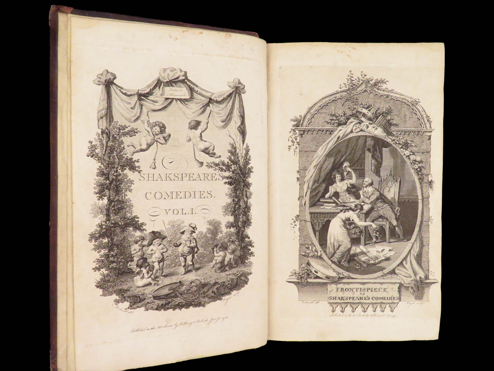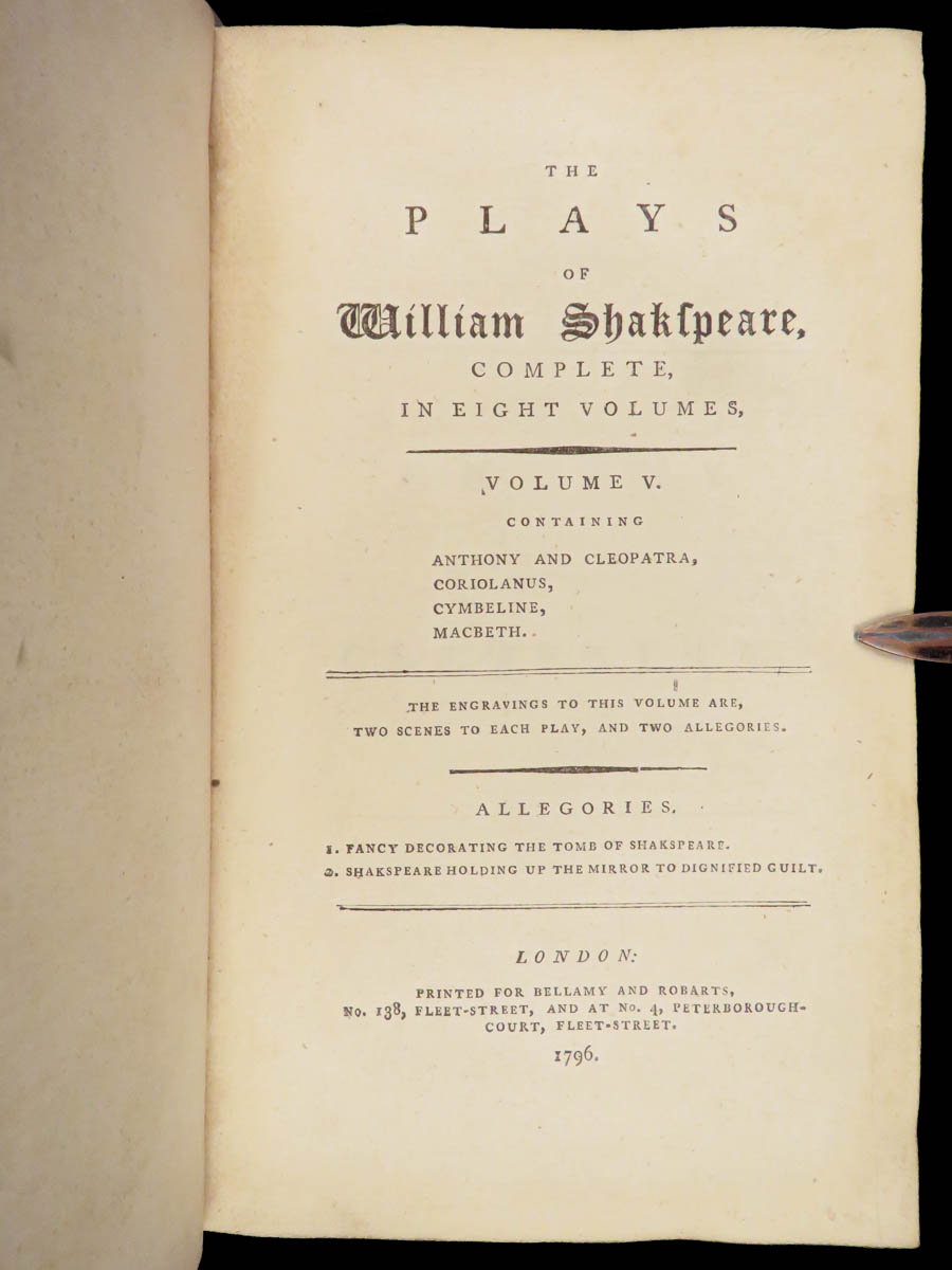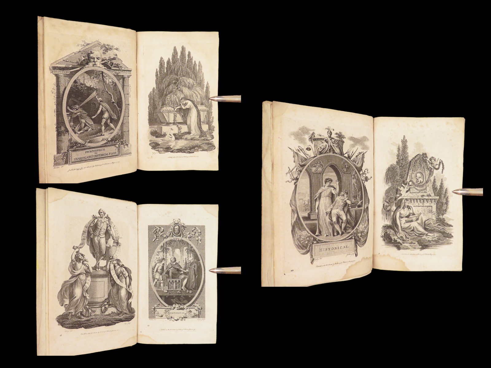 The Plays of William Shakspeare published in 1796 in London was an impressive and highly collectable set of the complete plays of Shakespeare. This set featured numerous allegorical engravings as well as illustrations depicting scenes from the plays themselves.