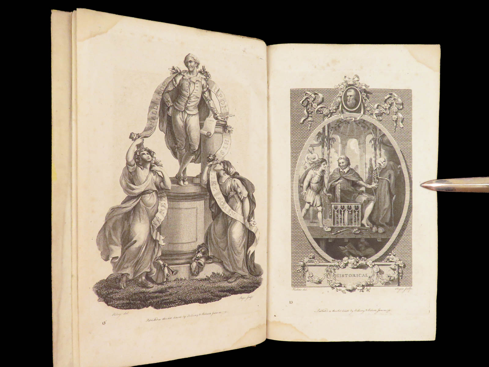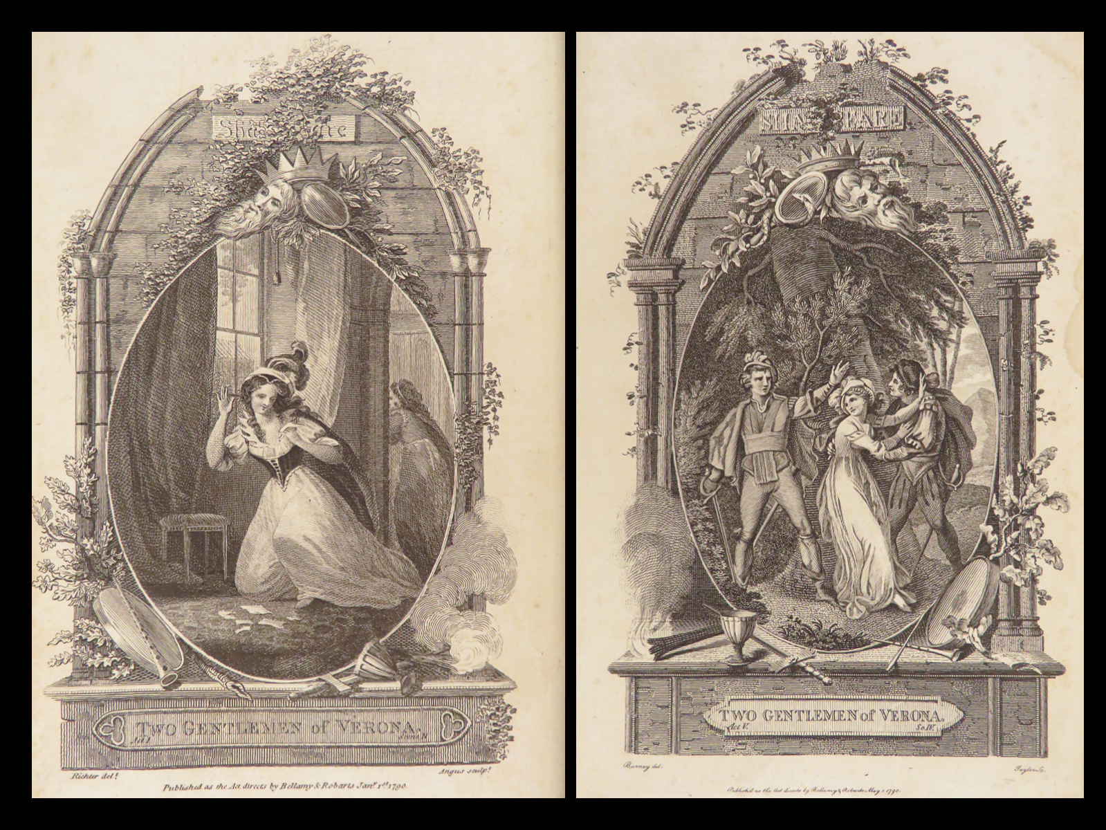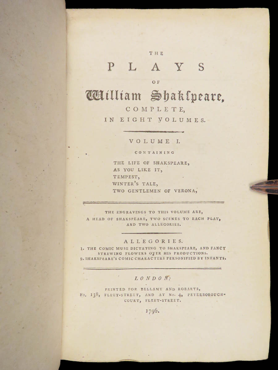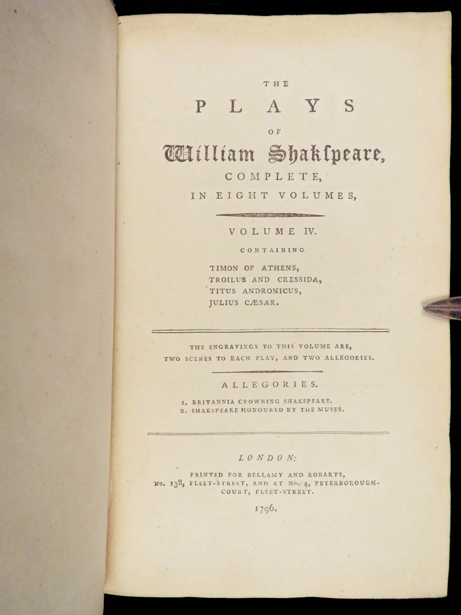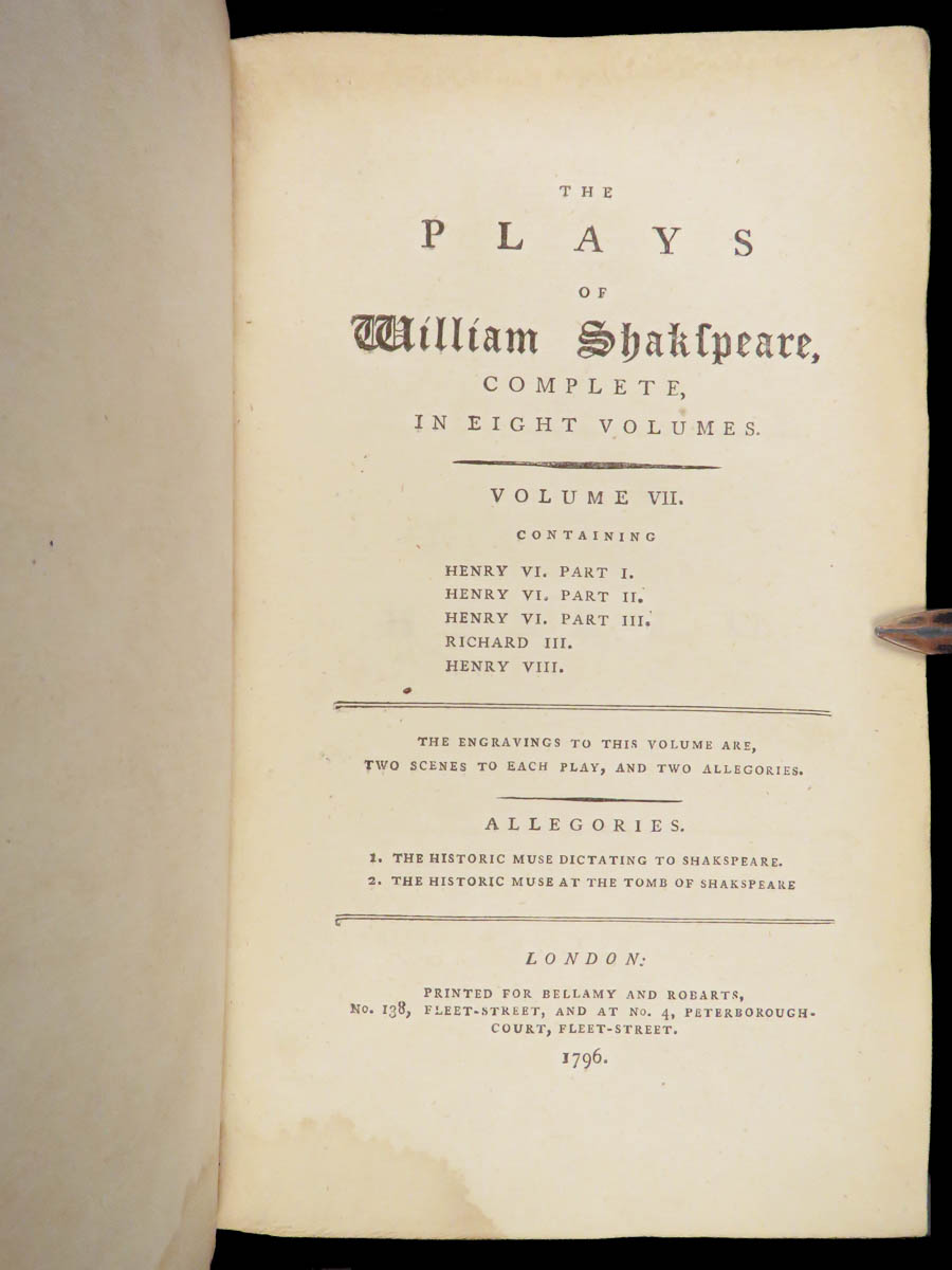 The Plays of William Shakspeare published in 1796 in London was an impressive and highly collectable set of the complete plays of Shakespeare. This set featured numerous allegorical engravings as well as illustrations depicting scenes from the plays themselves.