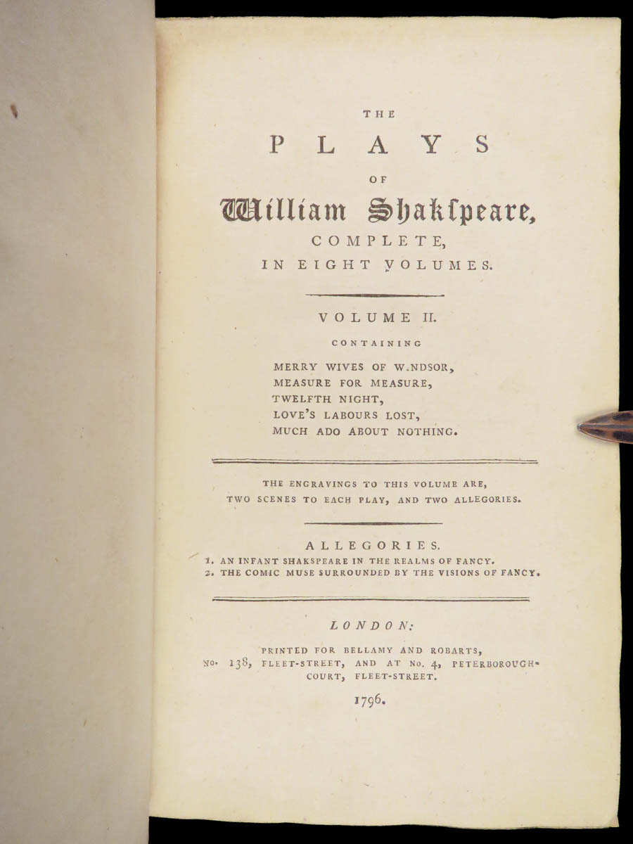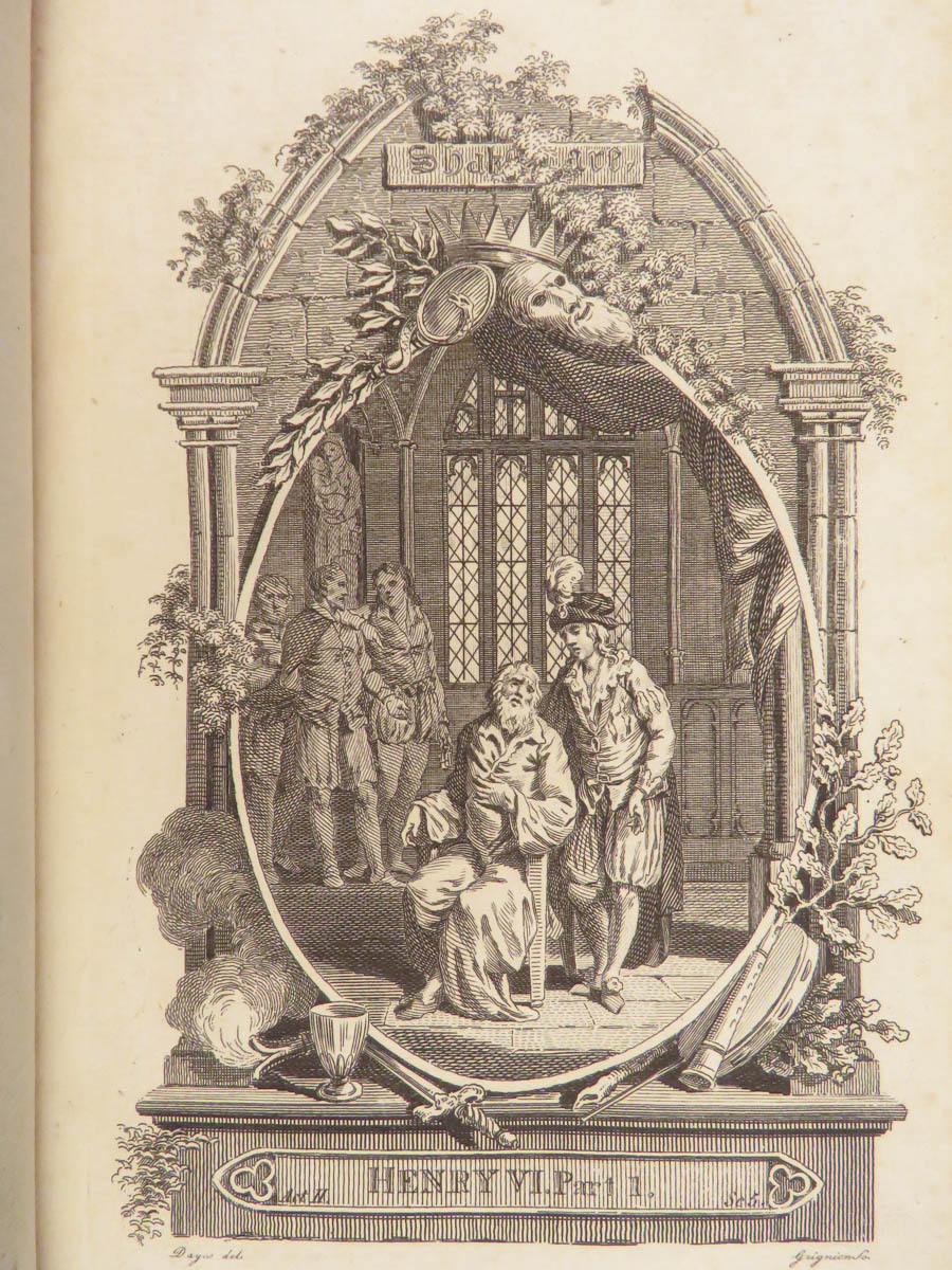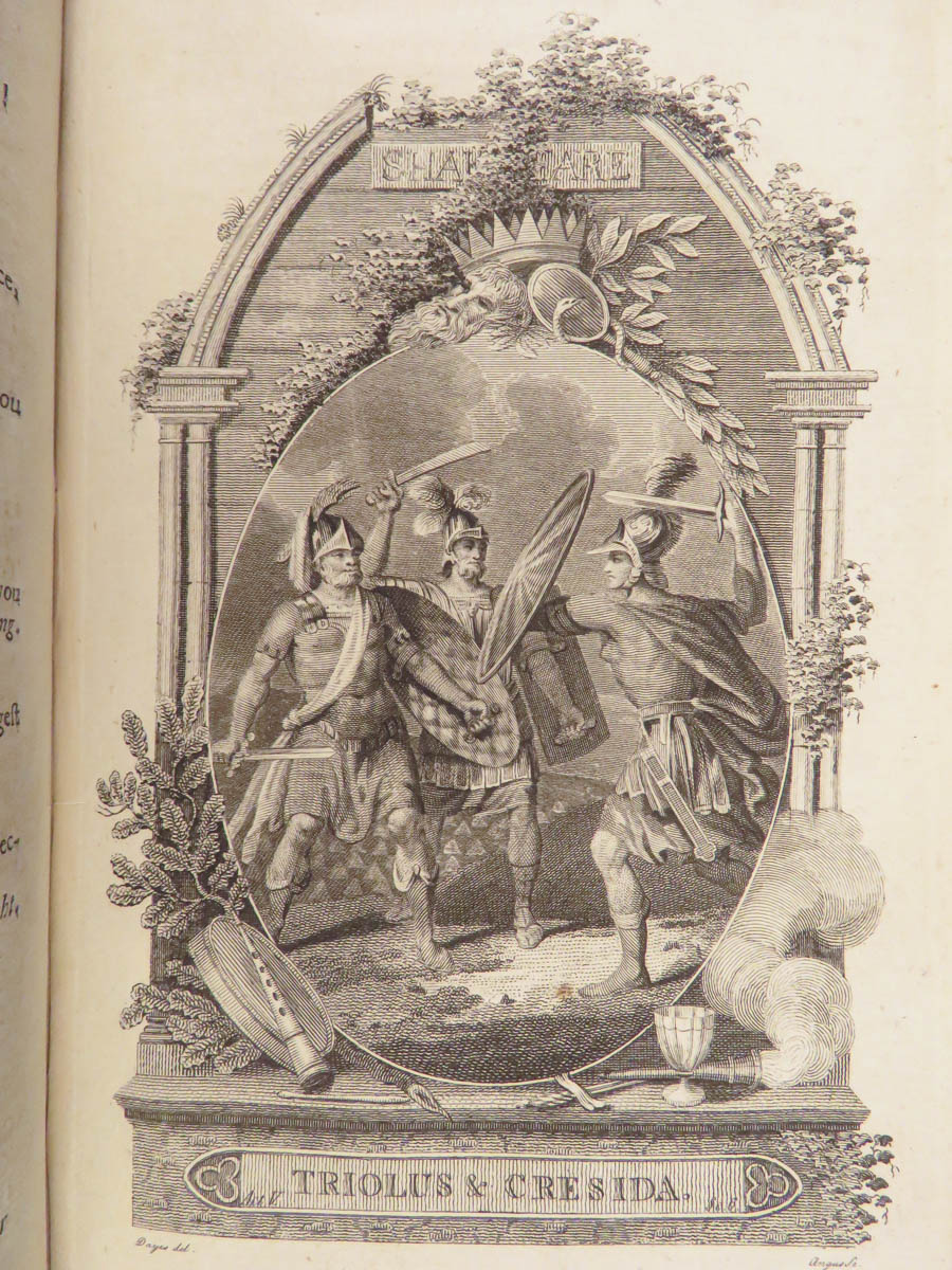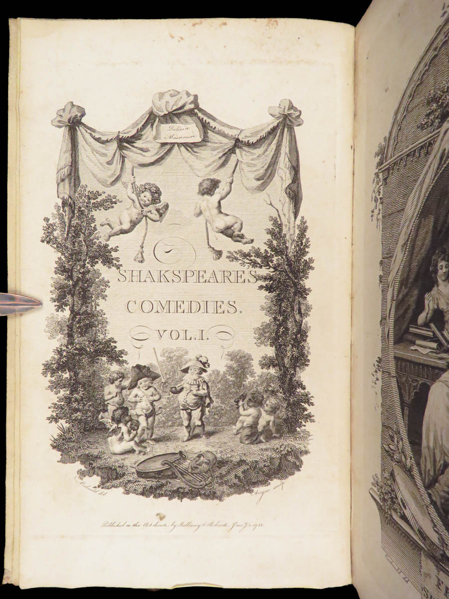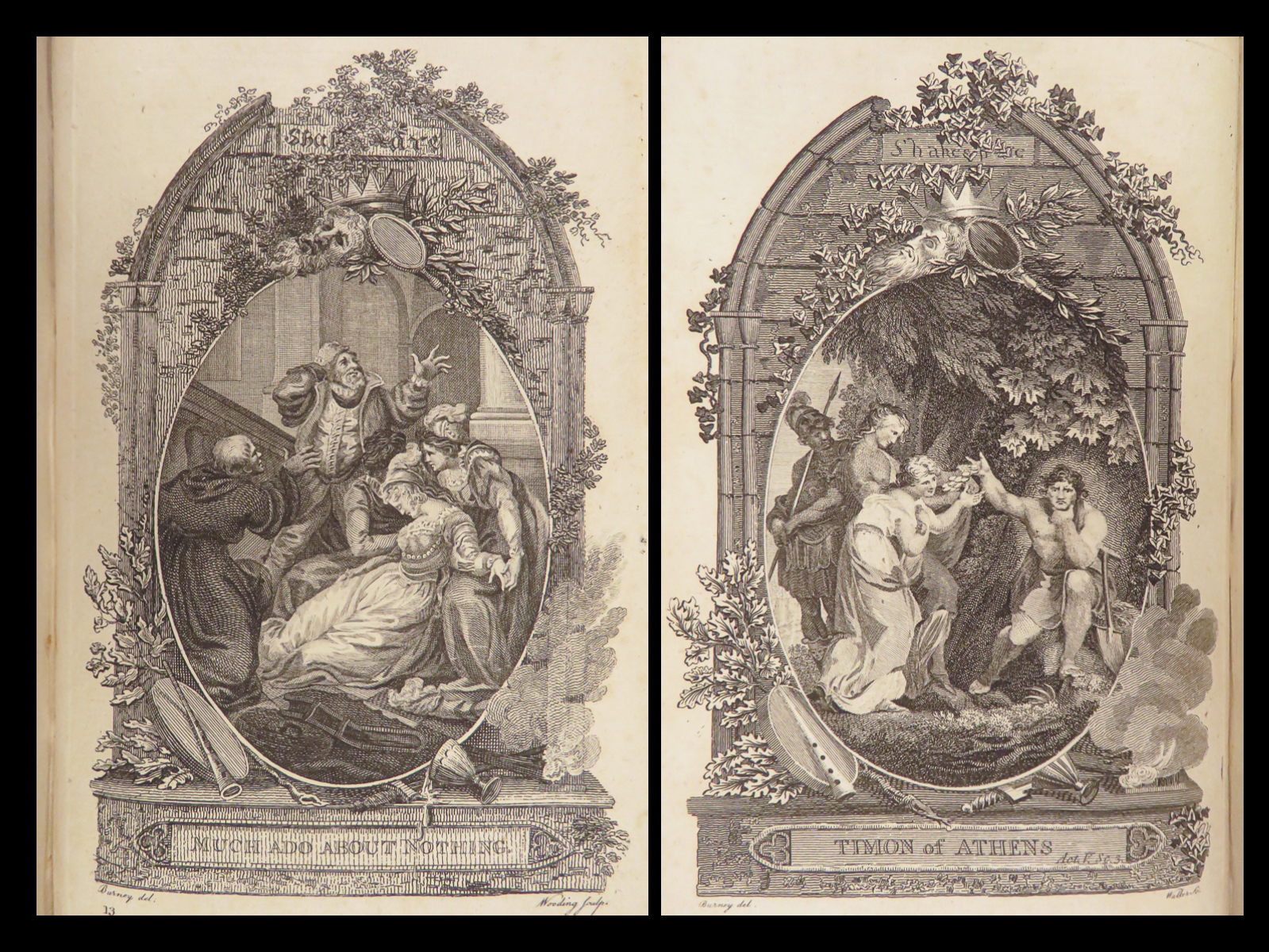 The Plays of William Shakspeare published in 1796 in London was an impressive and highly collectable set of the complete plays of Shakespeare. This set featured numerous allegorical engravings as well as illustrations depicting scenes from the plays themselves.