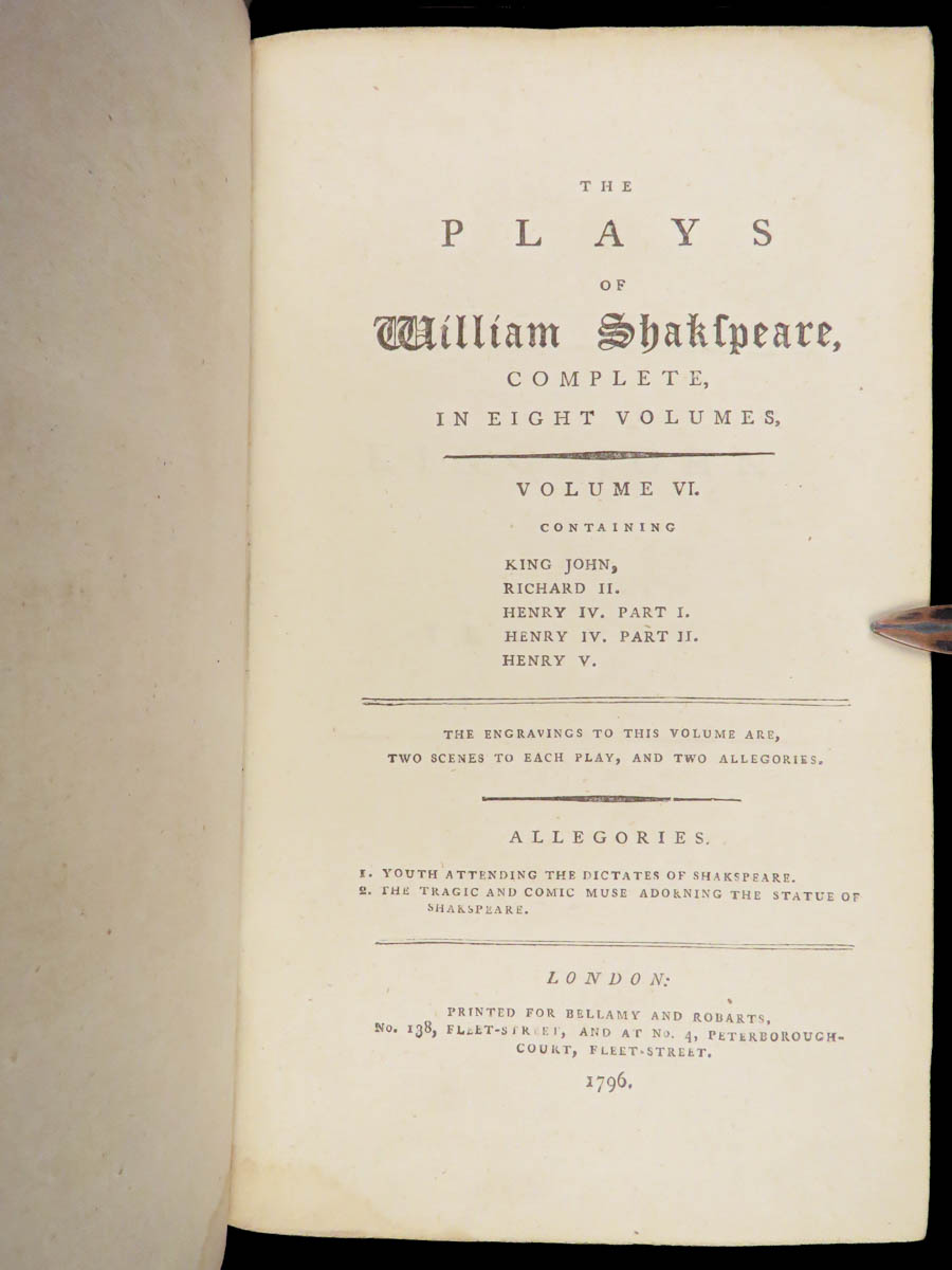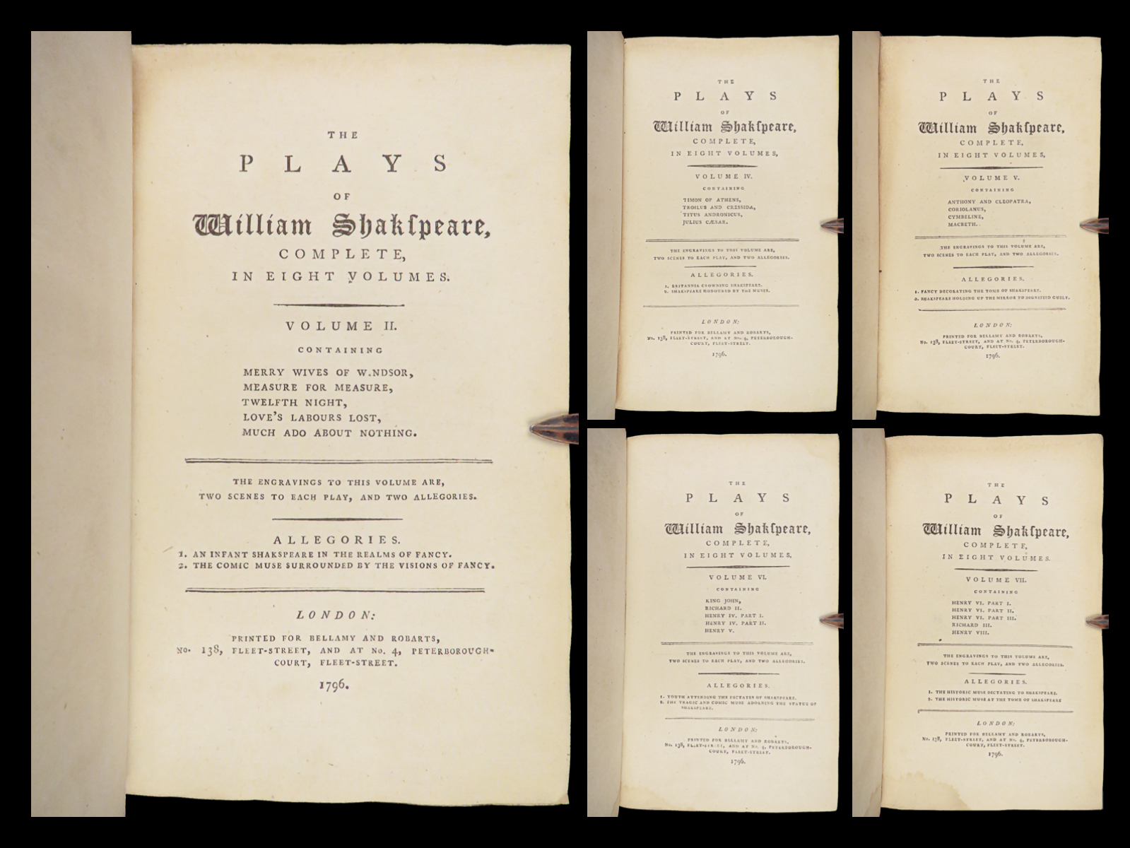 The plays of william shakespeare – 1796 | english, illustrated 6 volumes | six-volume partial 1796 bellamy and robarts edition of the plays of william shakspeare, with allegorical engravings and divisional titles, bound in uniform full leather.