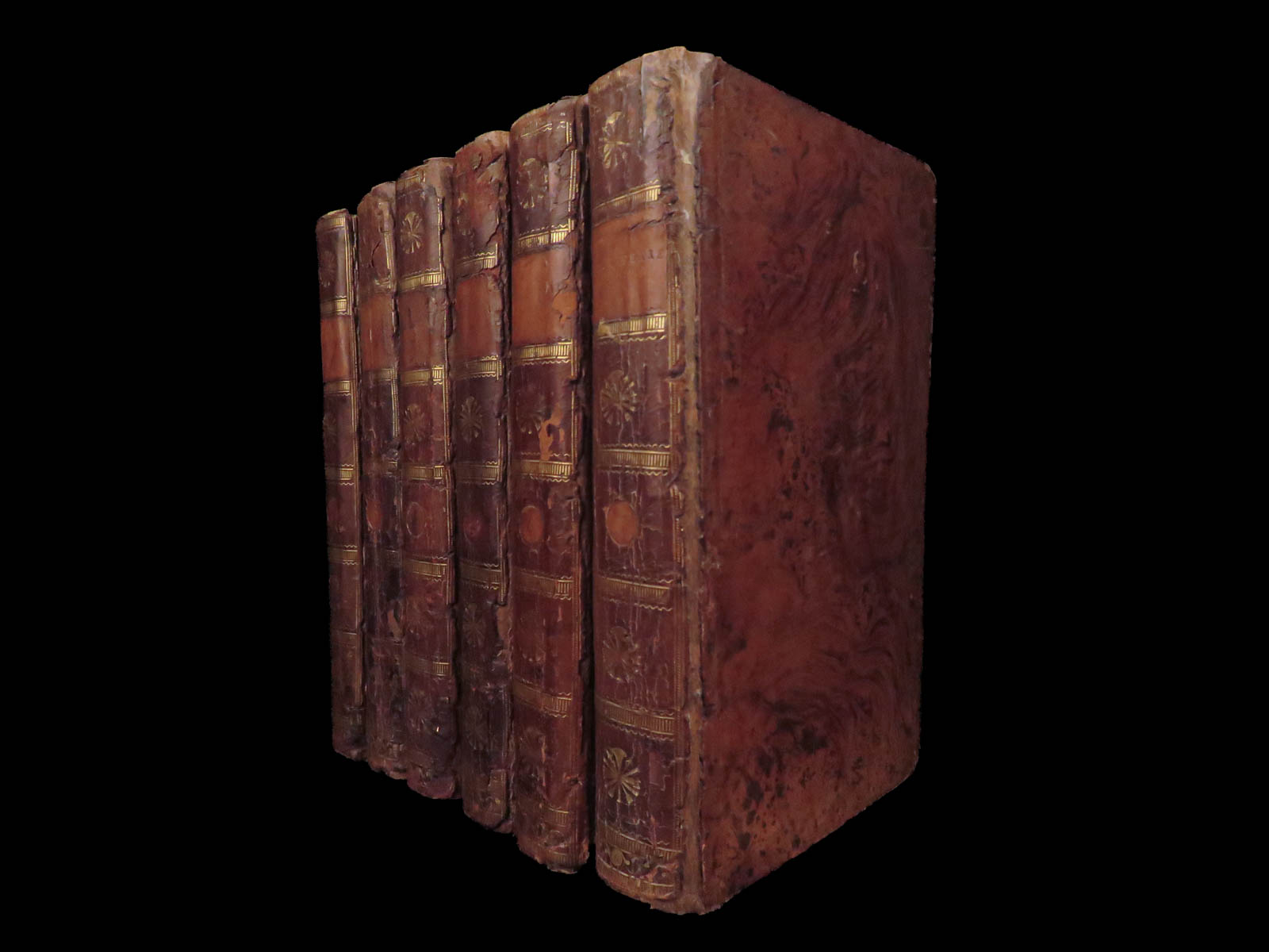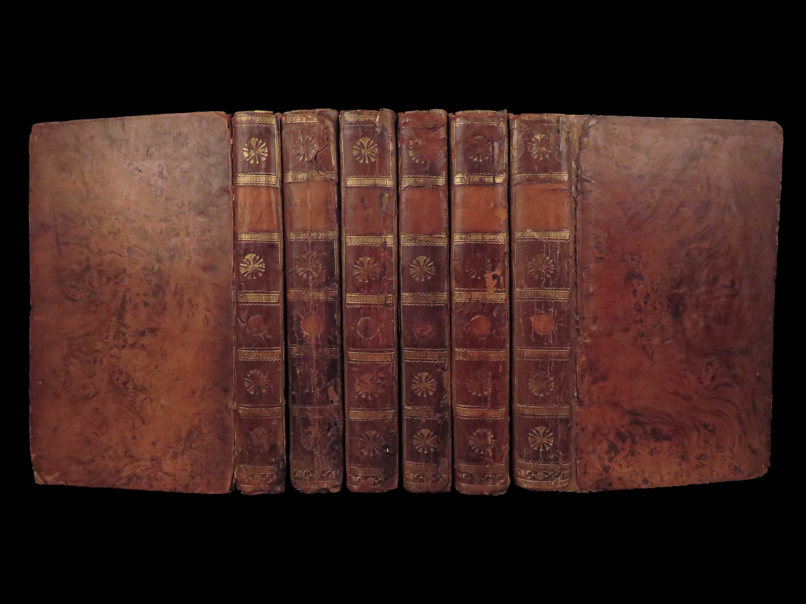 Six-volume partial 1796 Bellamy and Robarts edition of The Plays of William Shakspeare, with allegorical engravings and divisional titles, bound in uniform full leather.
