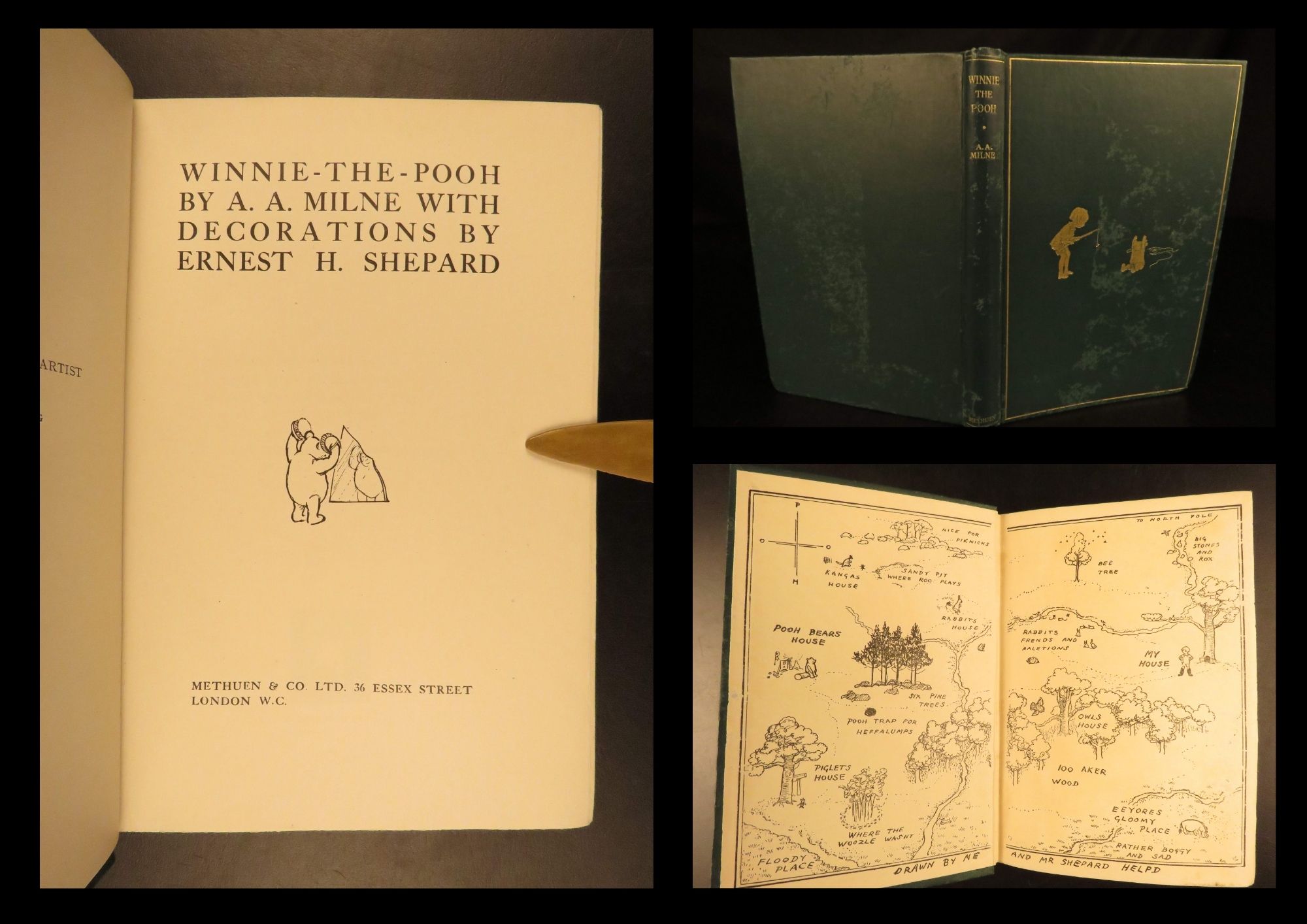 This is the first printing, confirmed by the lack of edition statement on the title page and no month on the copyright. The book Bound in original green cloth with a gilt illustration on the cover and gilt titles on the spine. Illustrated throughout by E.H. Shepard, including endpapers with scenes of the Hundred Acre Wood.