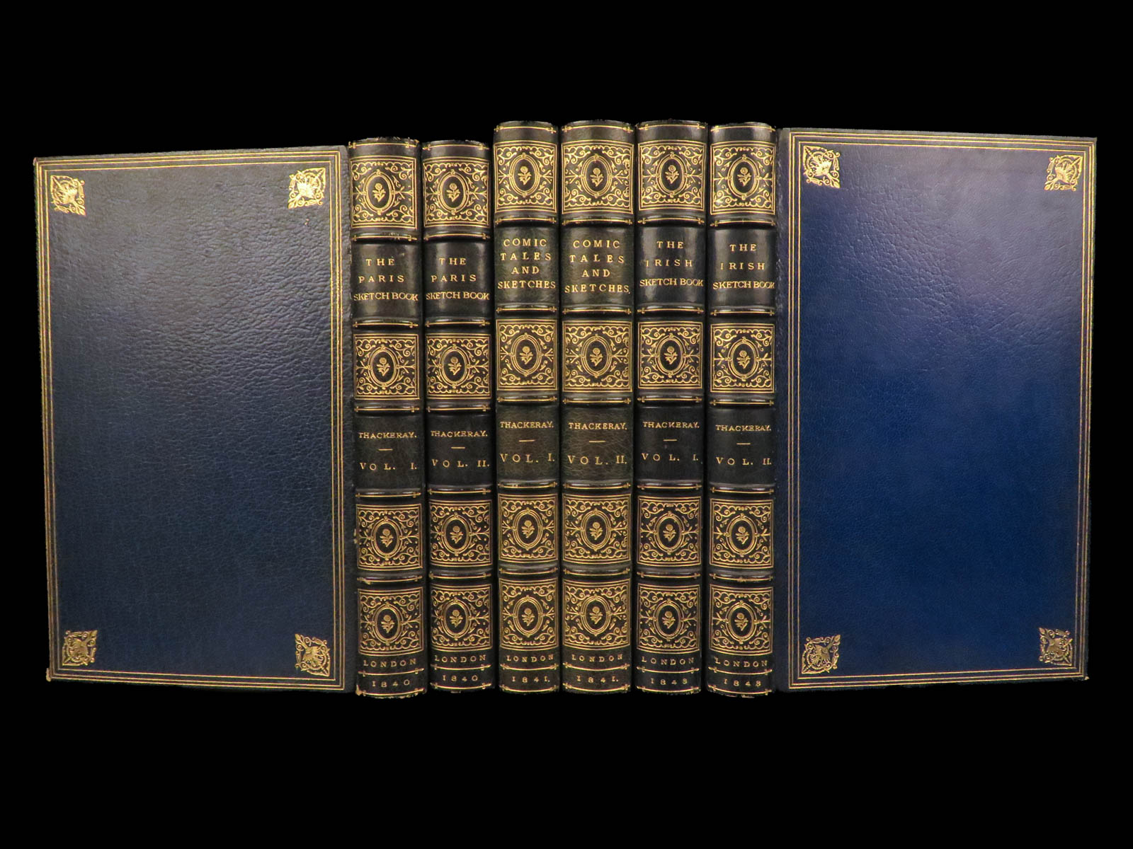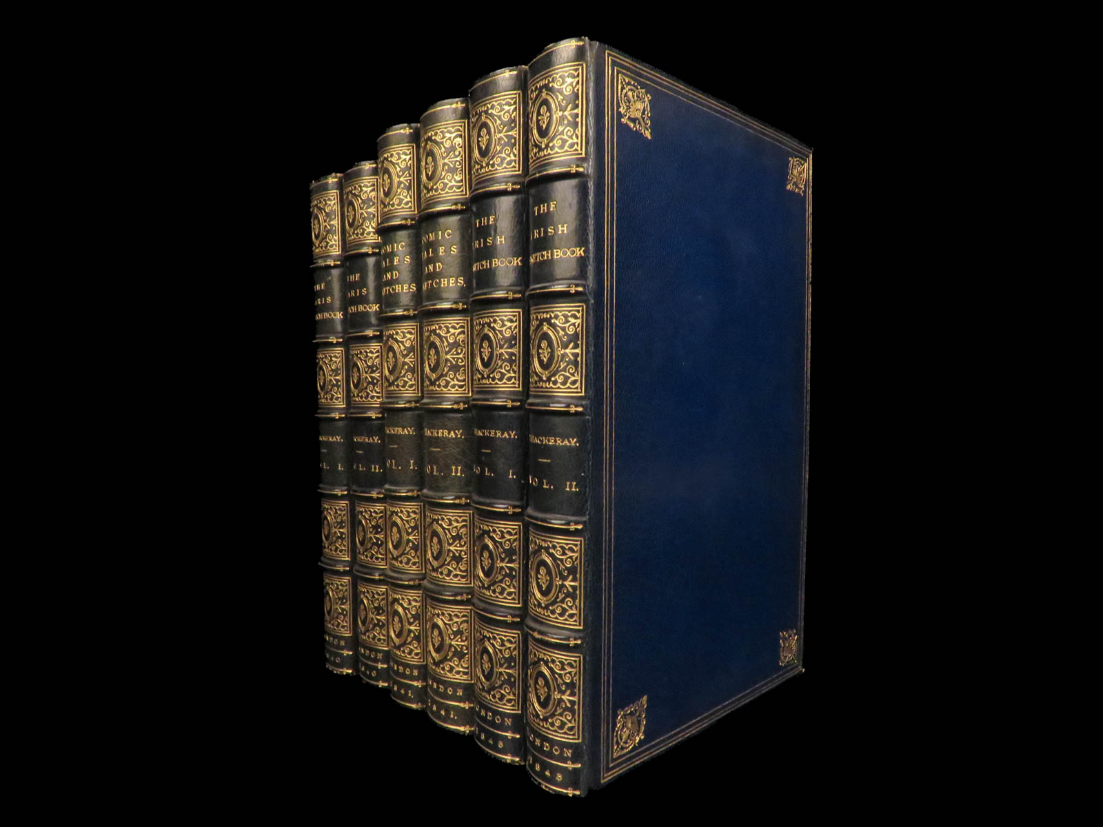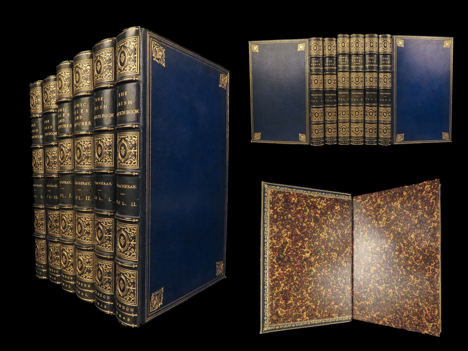Collected Works of W. M. Thackeray (1843), complete in six volumes, bound in blue Moroccan leather with marbled boards and gilt decoration, published in London.