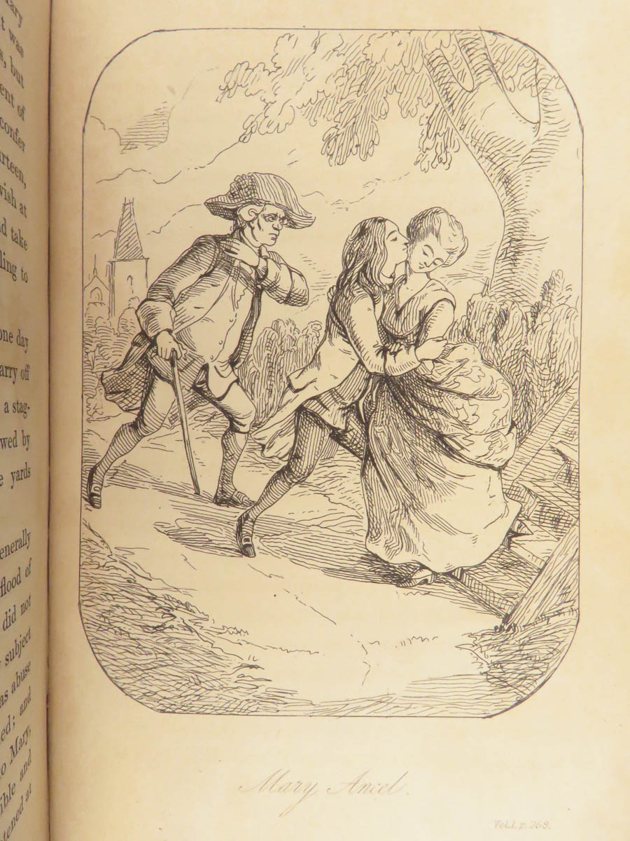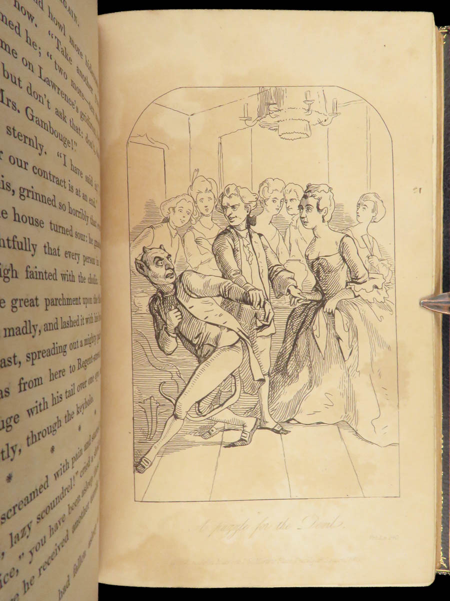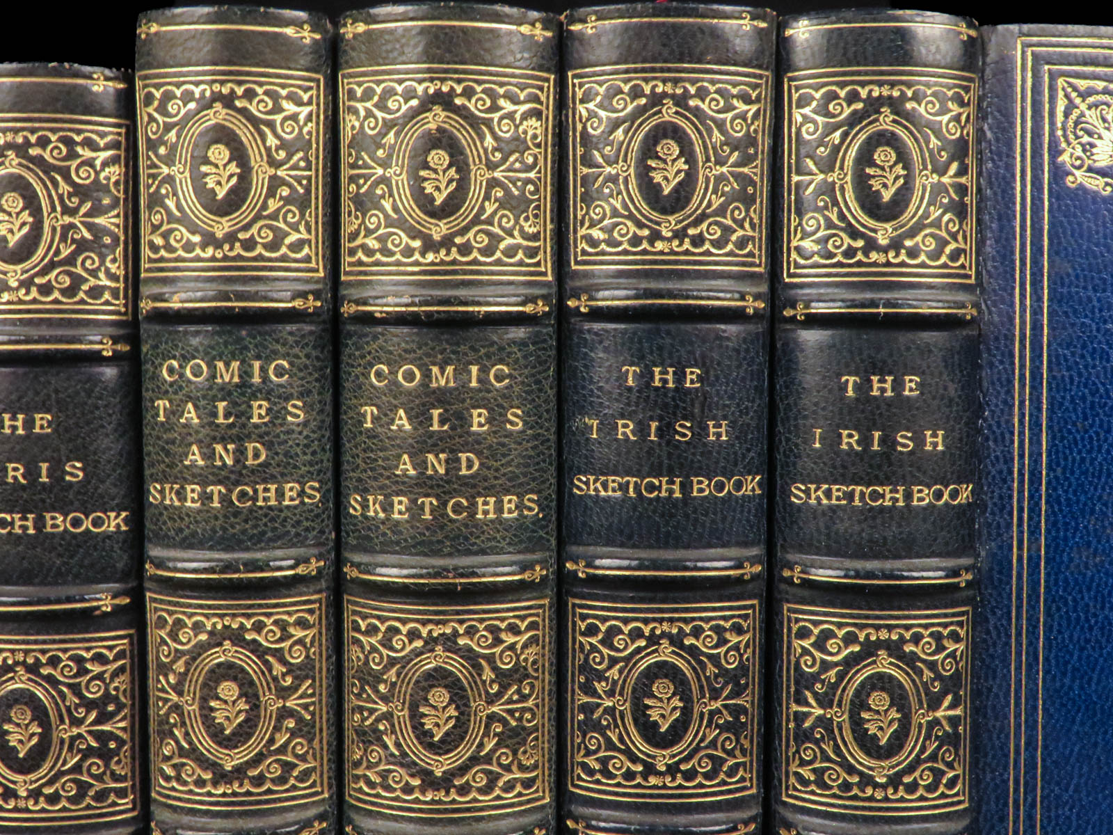 Collected Works of W. M. Thackeray (1843), complete in six volumes, bound in blue Moroccan leather with marbled boards and gilt decoration, published in London.