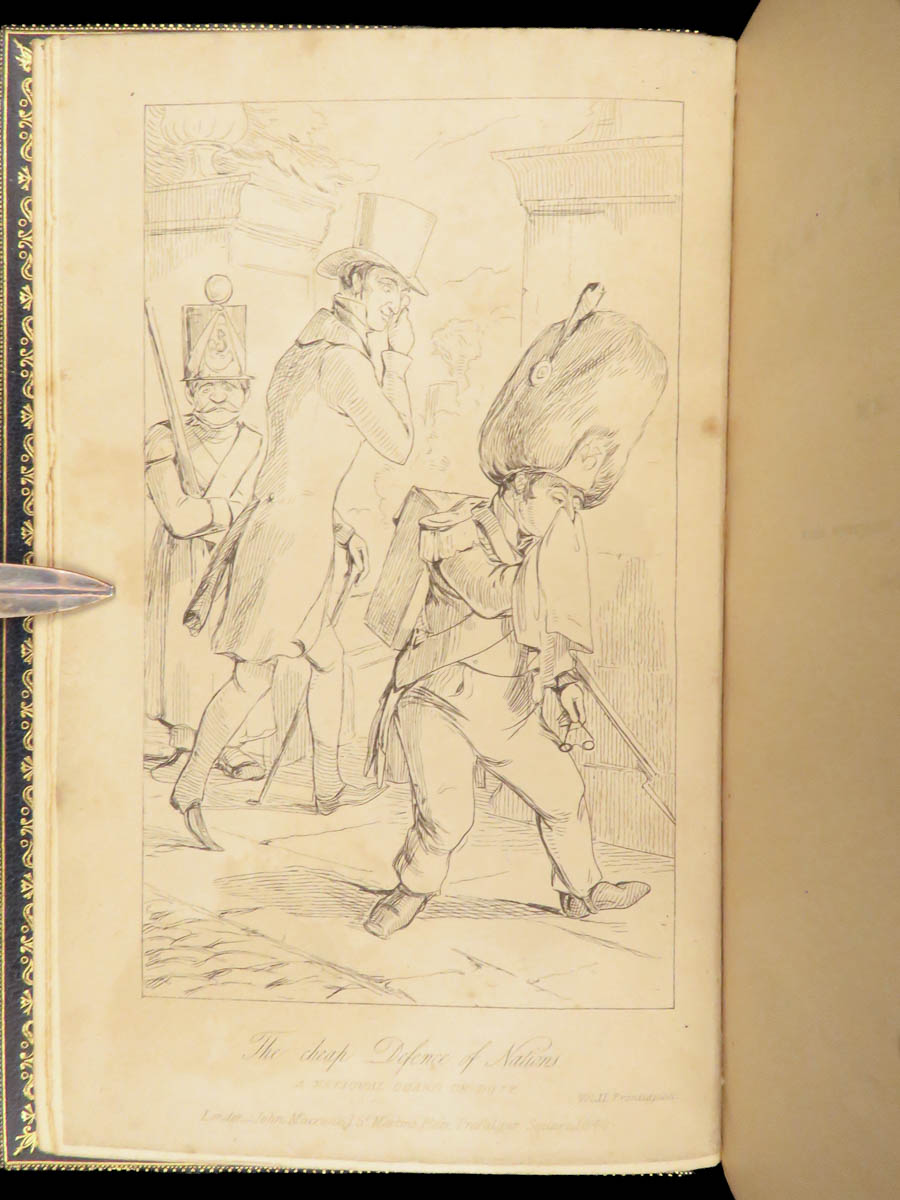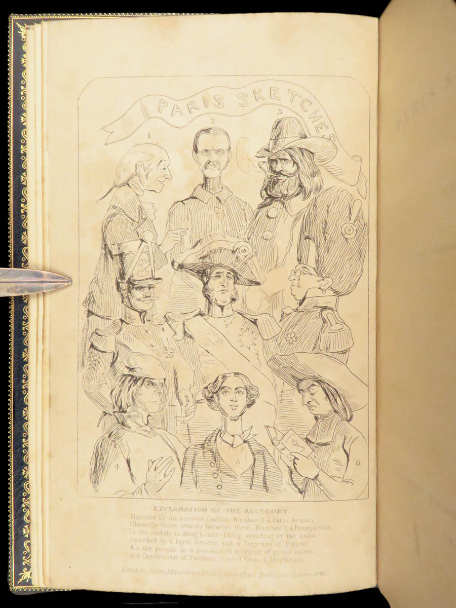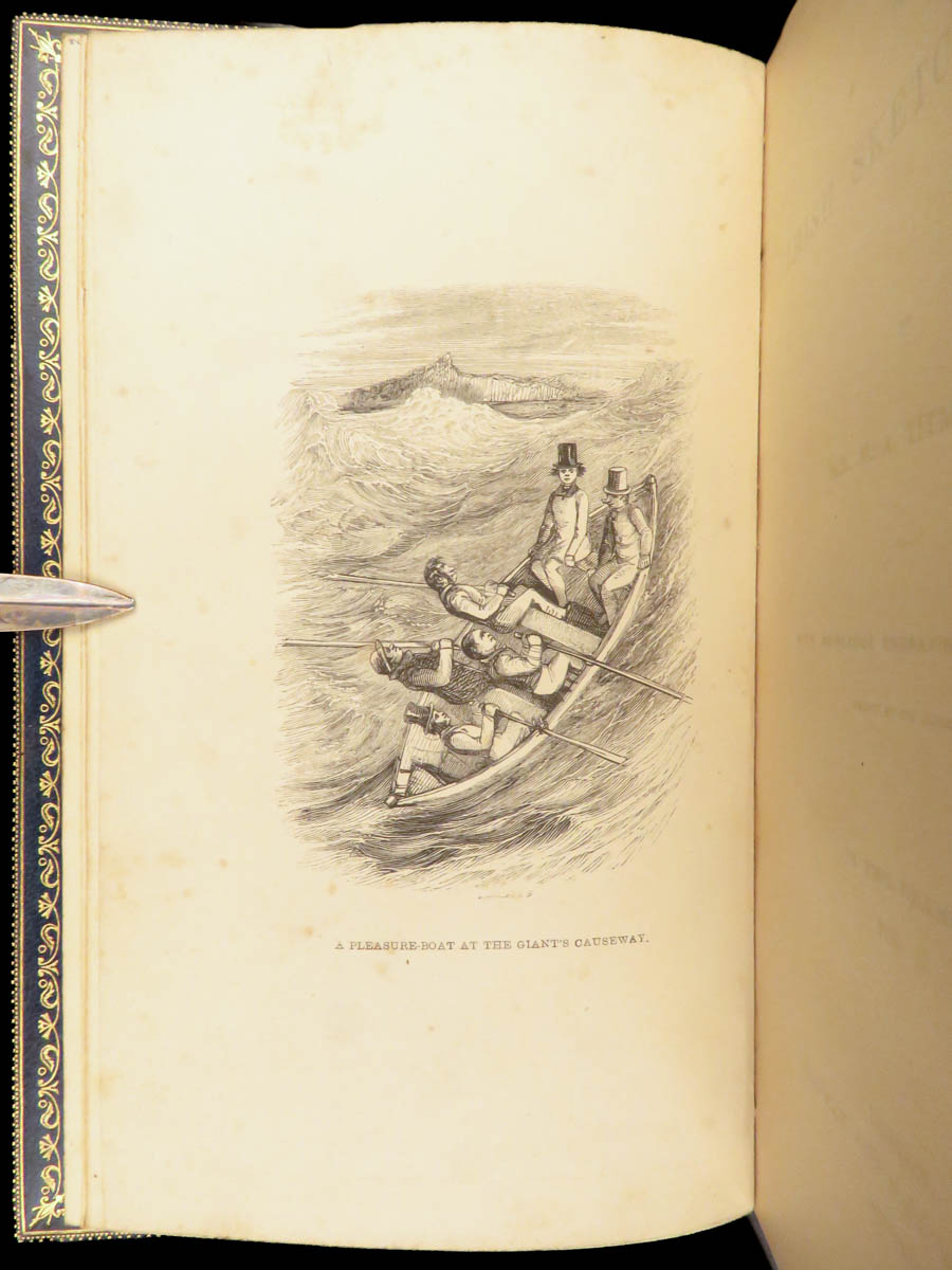 This edition of The Works of William Makepeace Thackeray was published in London in 1843. This six volume set includes shorter narratives, satirical sketches, and early prose that established his literary reputation during the Victorian period. The bindings are a striking feature, finished in blue Moroccan leather with marbled boards and gilt decoration. Titles gathered here include The Paris Sketchbook, The Irish Sketchbook, and Comic Tales and Sketches.