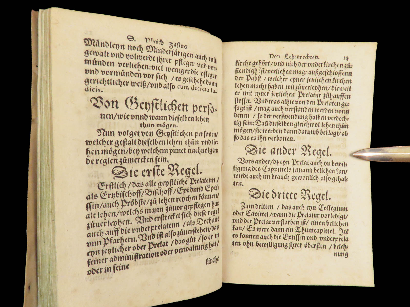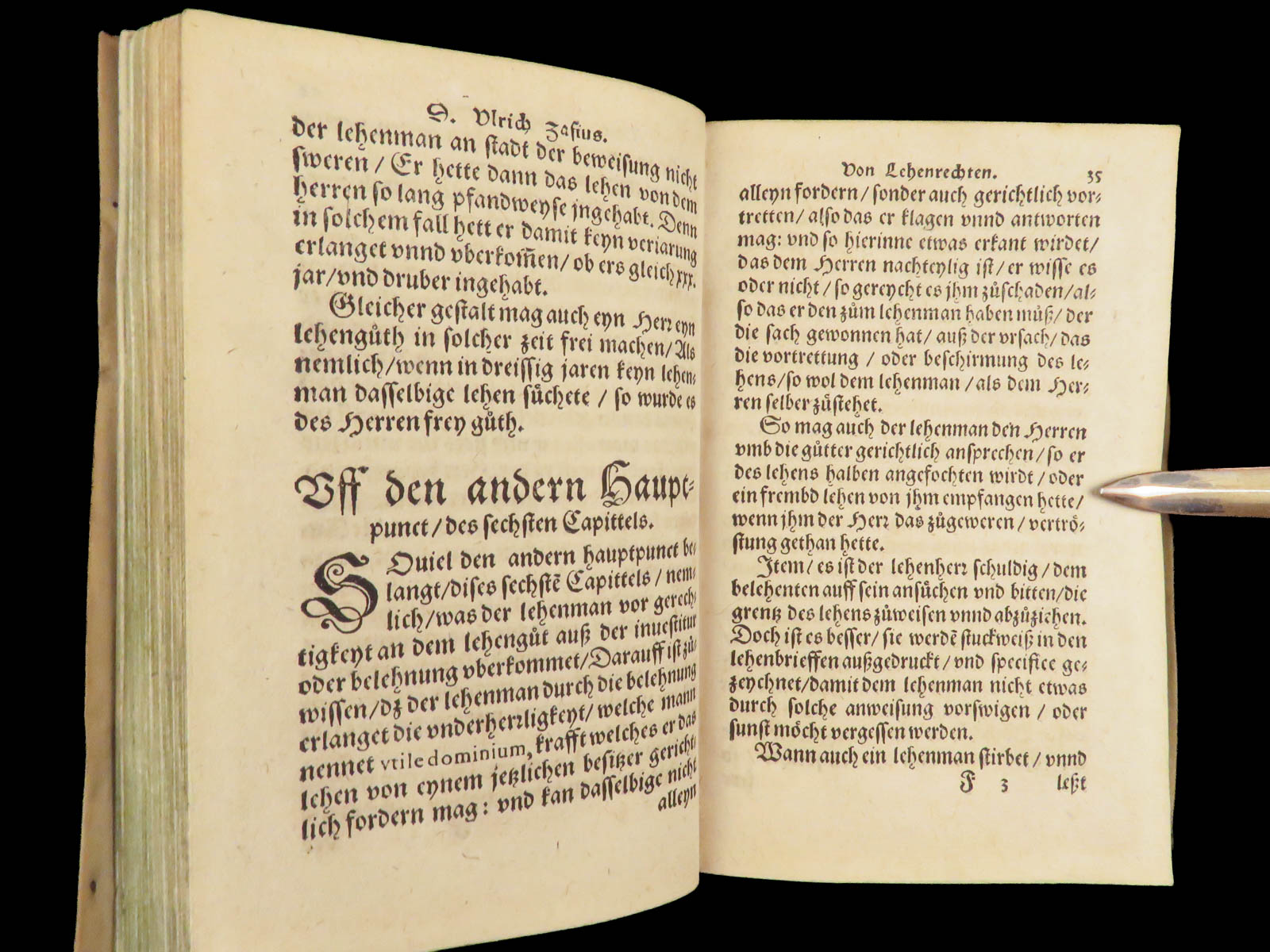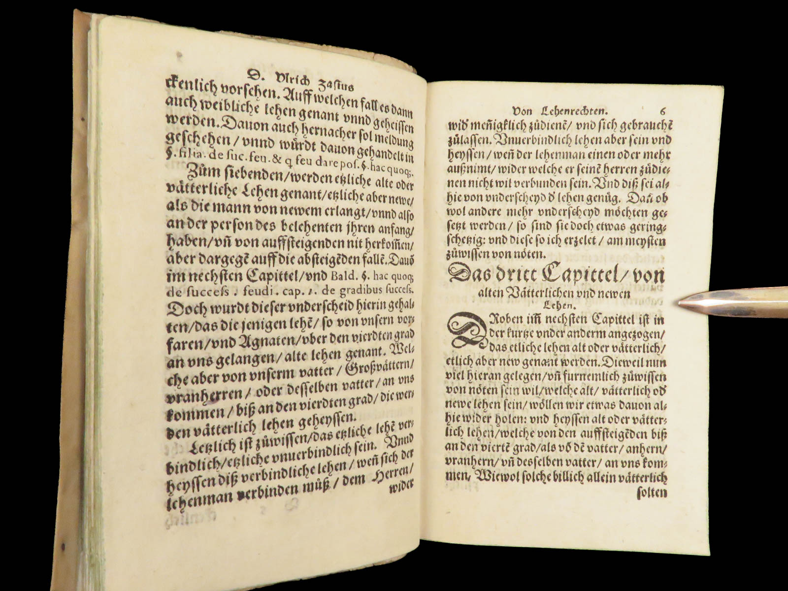Ulrich Zasius’s Die Summa des gantzen Keyserlichen Lehenrechtens is a foundational work of “Lehenrecht” or feudal law of the Holy Roman Empire. This work outlines the legal structure governing land tenure and feudal obligations, and it addresses principles of vassalage, tenure, and legal customs rooted in both Roman and German traditions. The vellum binding is original