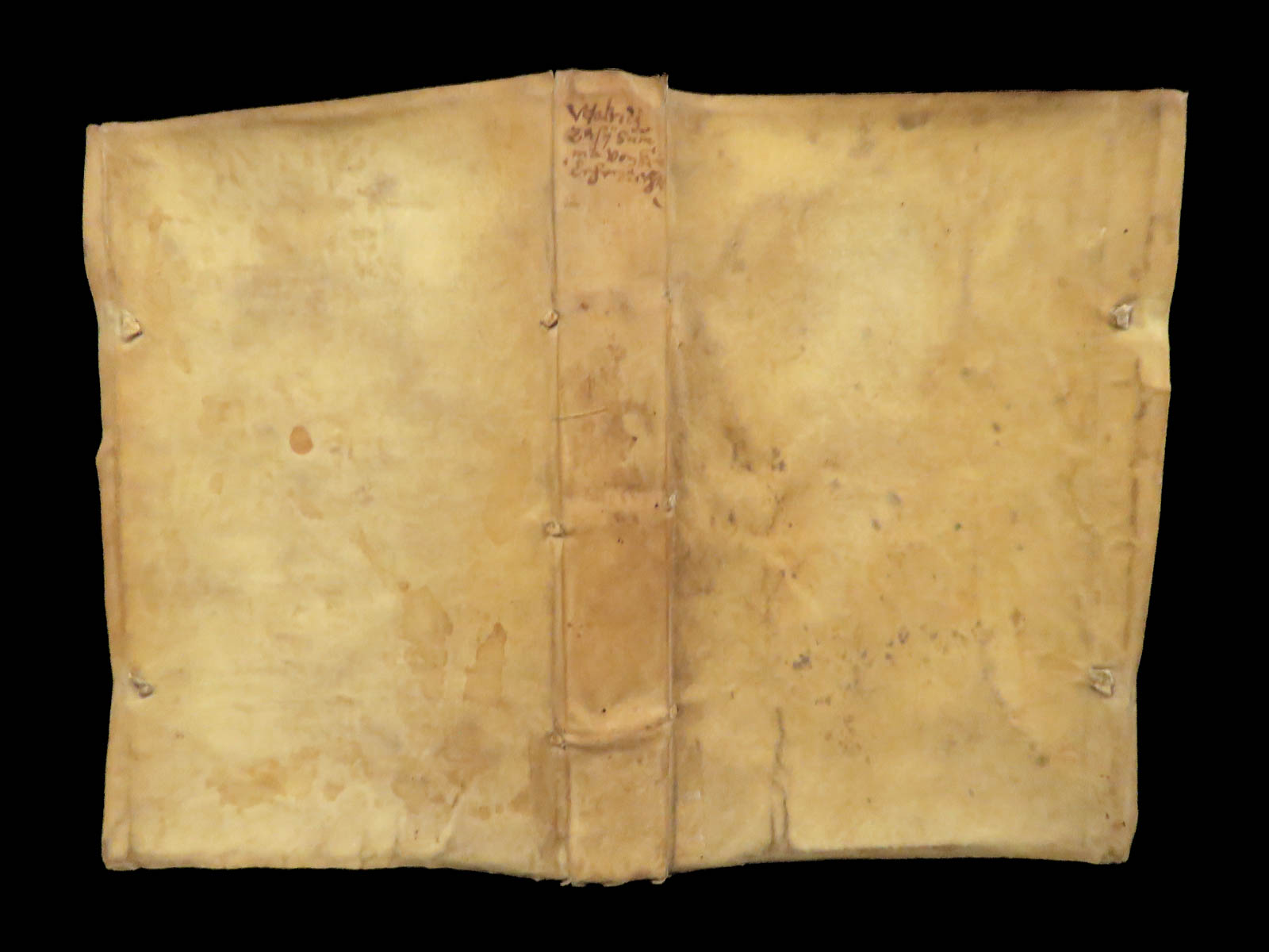 Full vellum binding with visible age wear and staining; binding remains secure. The first four leaves show professional repairs. Text is complete and fully legible with no loss or missing sections.