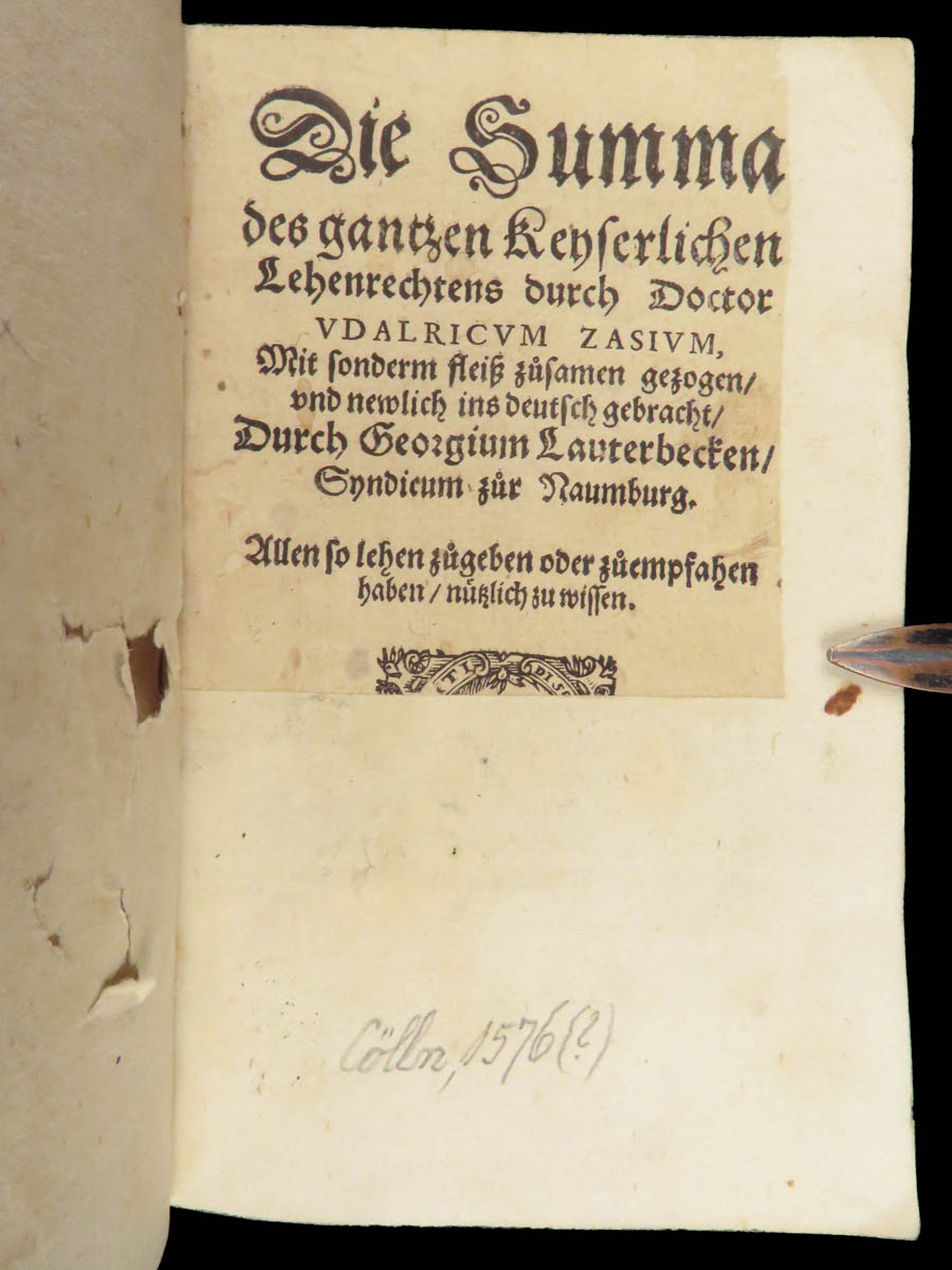 Zasius’s 1576 legal manual on imperial feudal law in the Holy Roman Empire, printed by Gymnicus in Cologne. Complete and restored copy in original vellum.